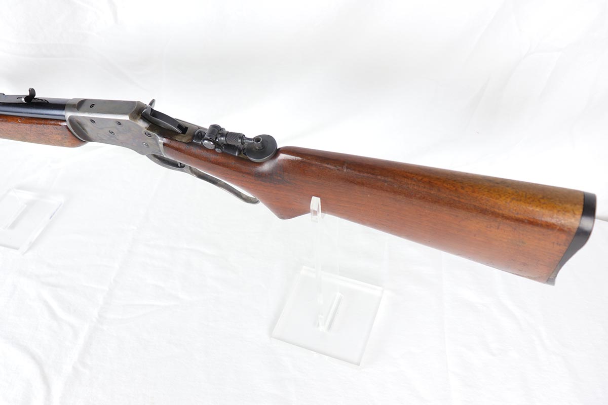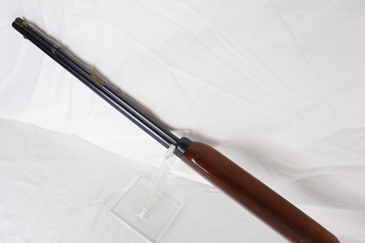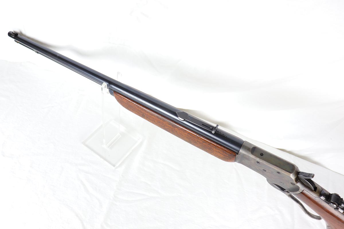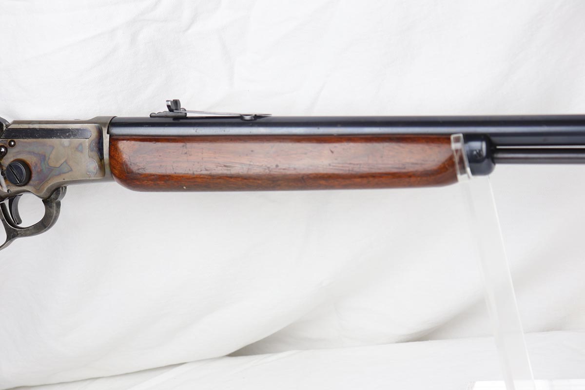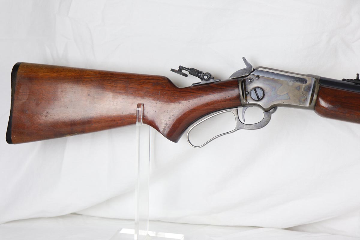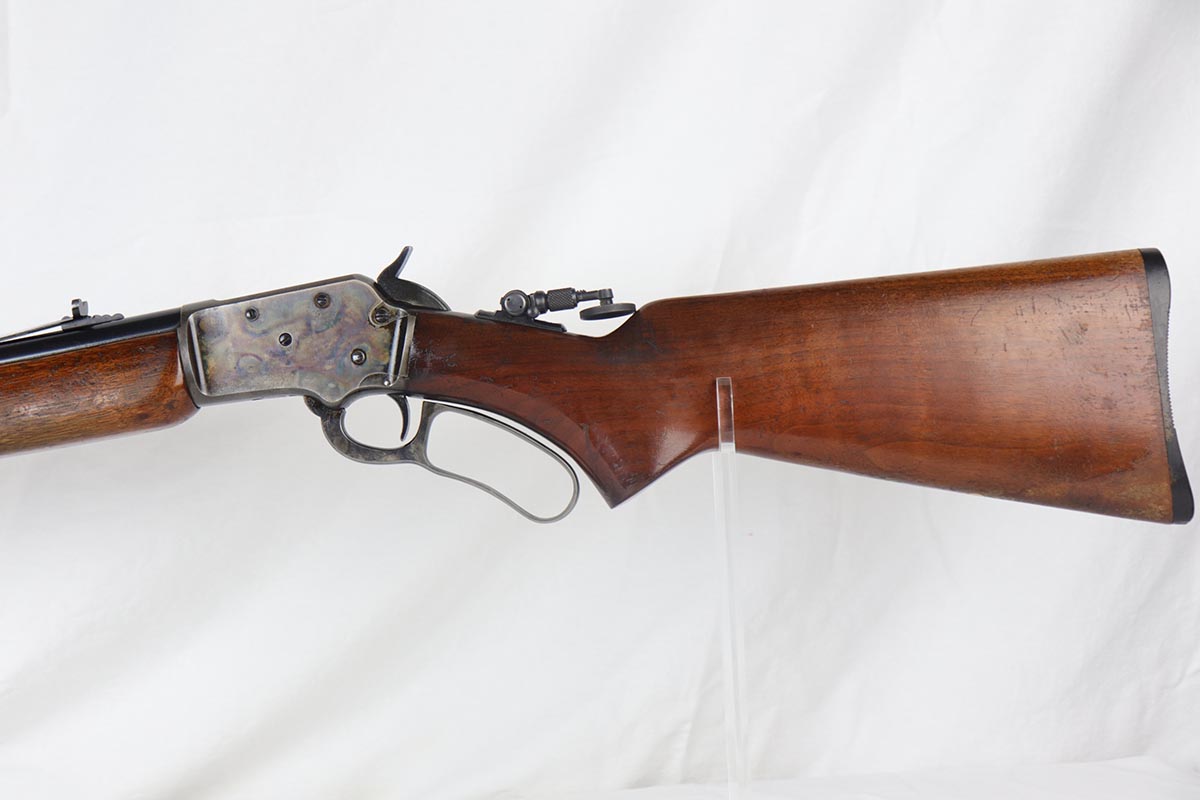 7/23/18 – This is a scarce, excellent Marlin Model 39A – second model lever-action rifle. This variation was manufactured in 1941 and is identified by the “B” prefix in the serial and the case colored frame. This rifle is chambered for .22 SL and LR, and retains about 95% original blue with minor muzzle wear and slight thinning on the barrel. The receiver shows a good amount of original case coloring, with minor freckling on the left side. The wood shows minor cosmetic defects but no major cracks or chips. Bore could use a cleaning but has strong rifling and no corrosion. The action is functional but slightly tight.