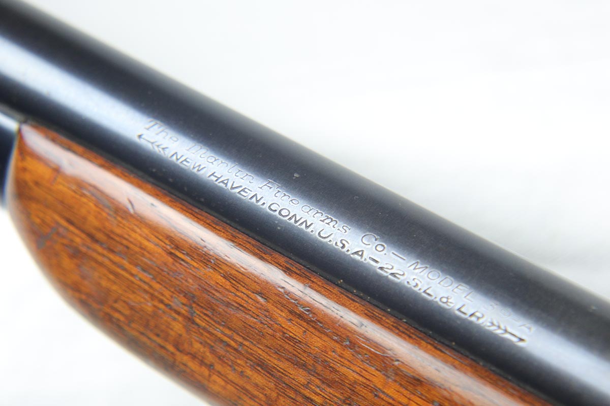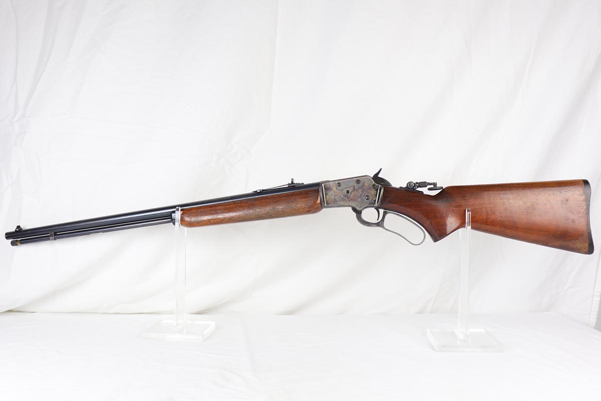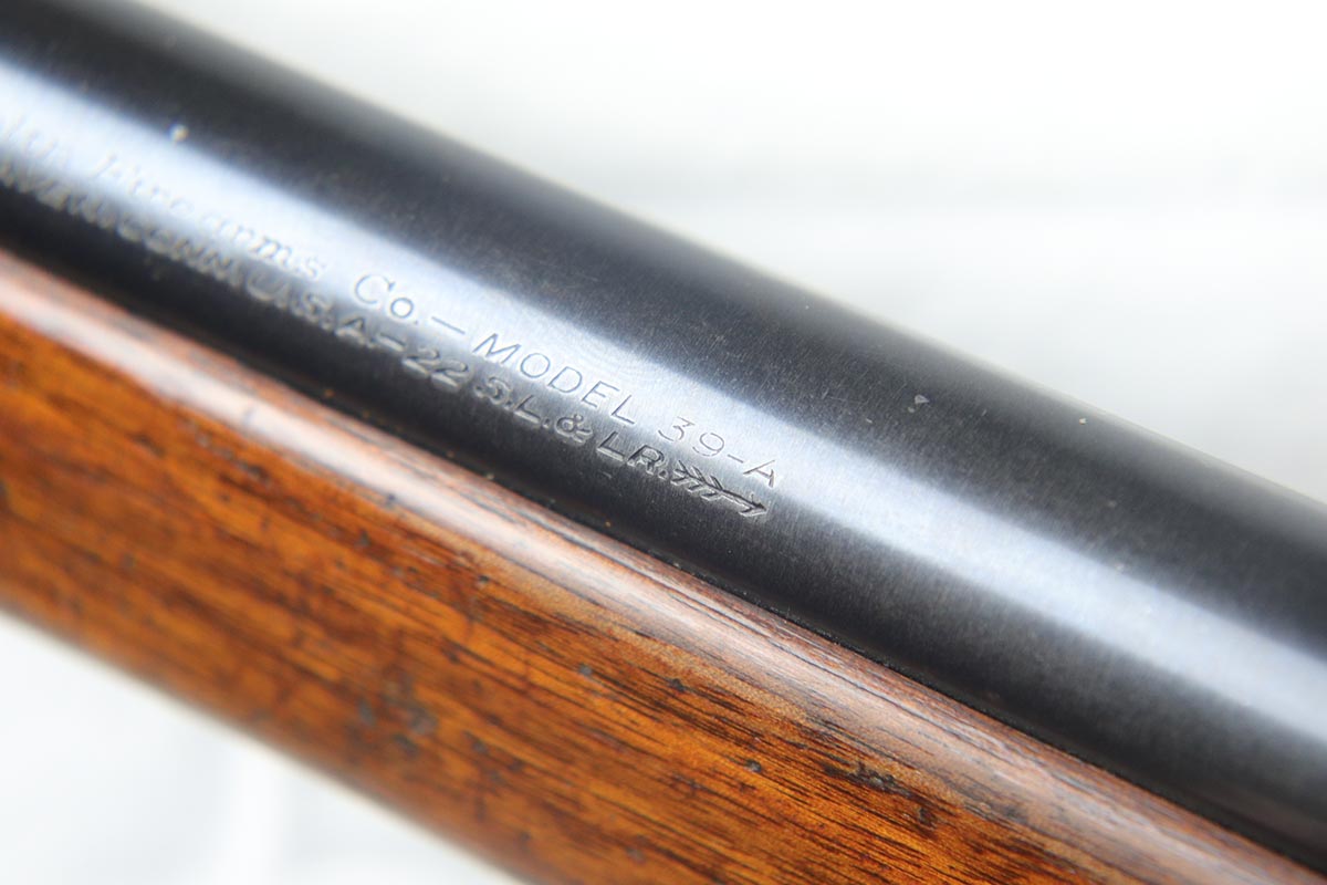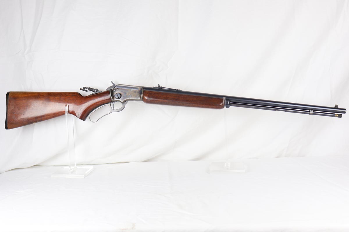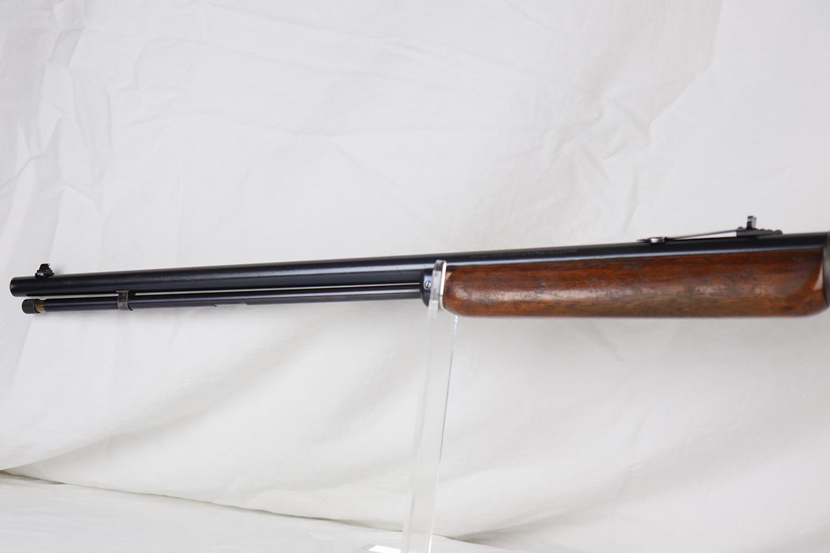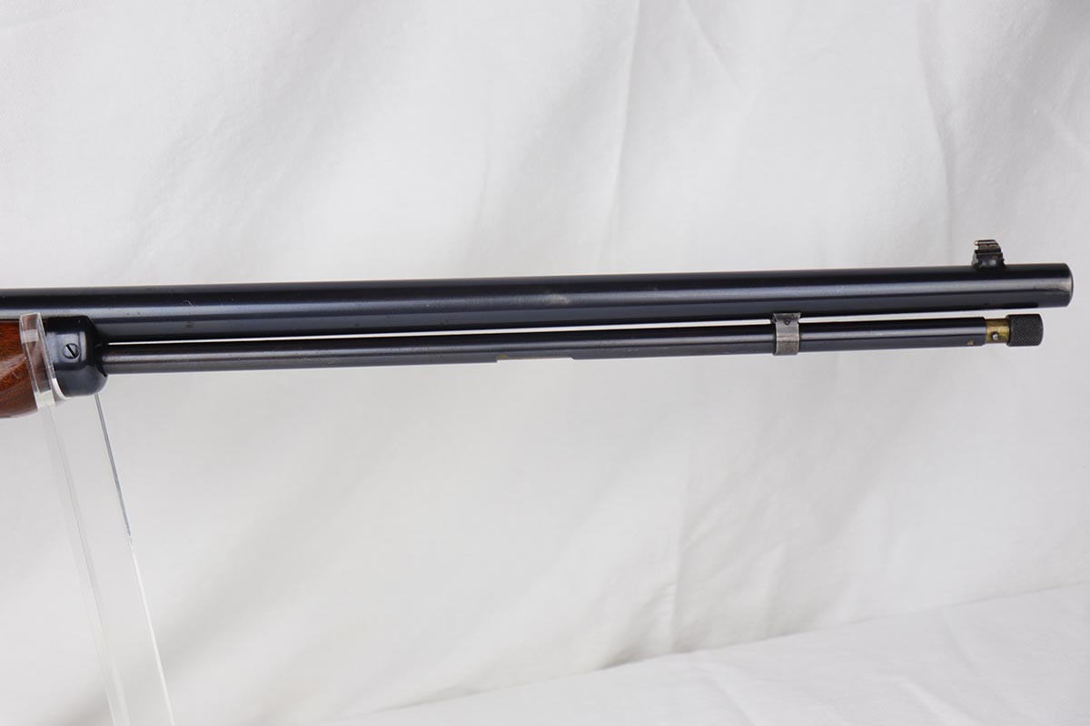 7/23/18 – This is a scarce, excellent Marlin Model 39A – second model lever-action rifle. This variation was manufactured in 1941 and is identified by the “B” prefix in the serial and the case colored frame. This rifle is chambered for .22 SL and LR, and retains about 95% original blue with minor muzzle wear and slight thinning on the barrel. The receiver shows a good amount of original case coloring, with minor freckling on the left side. The wood shows minor cosmetic defects but no major cracks or chips. Bore could use a cleaning but has strong rifling and no corrosion. The action is functional but slightly tight.