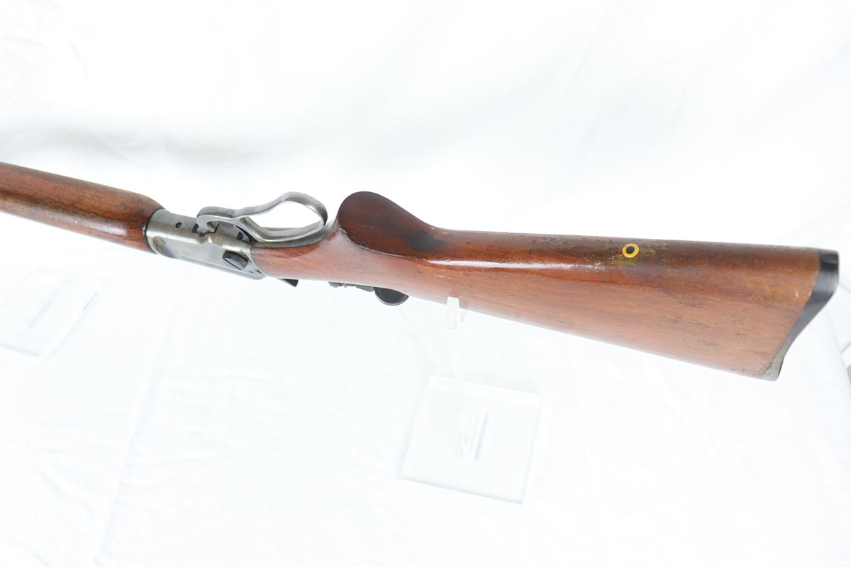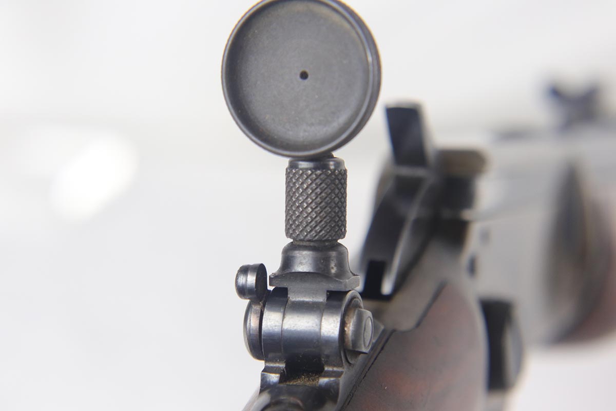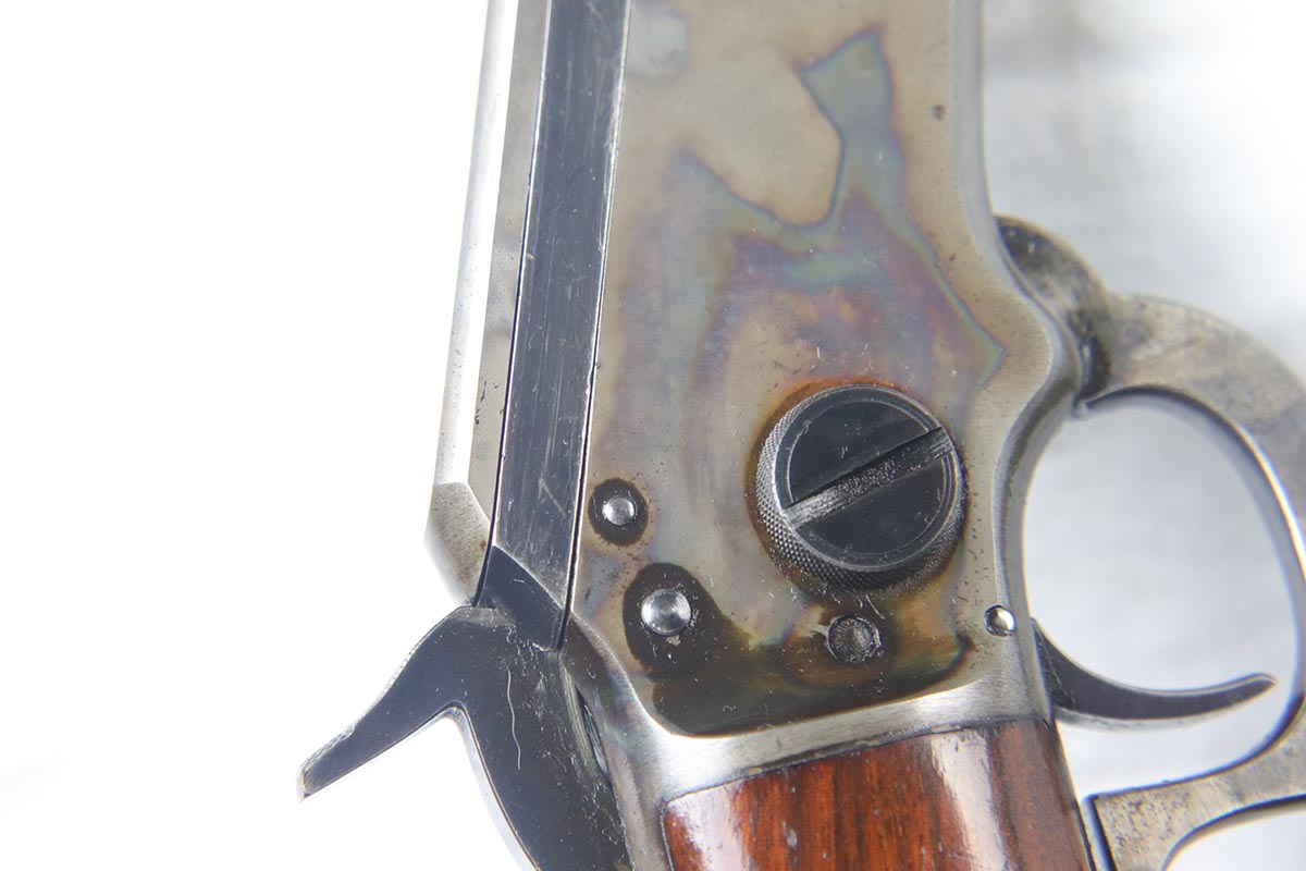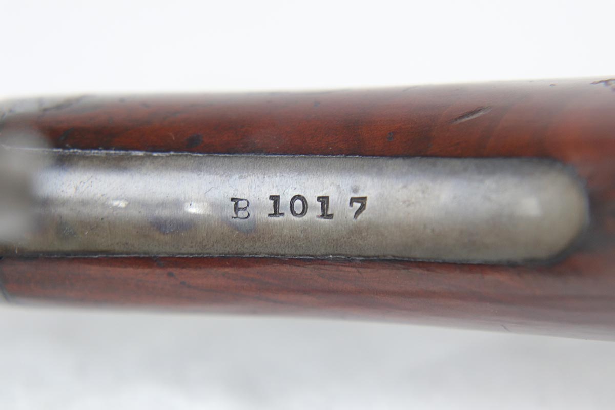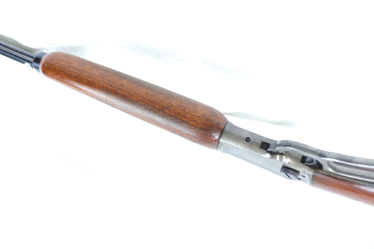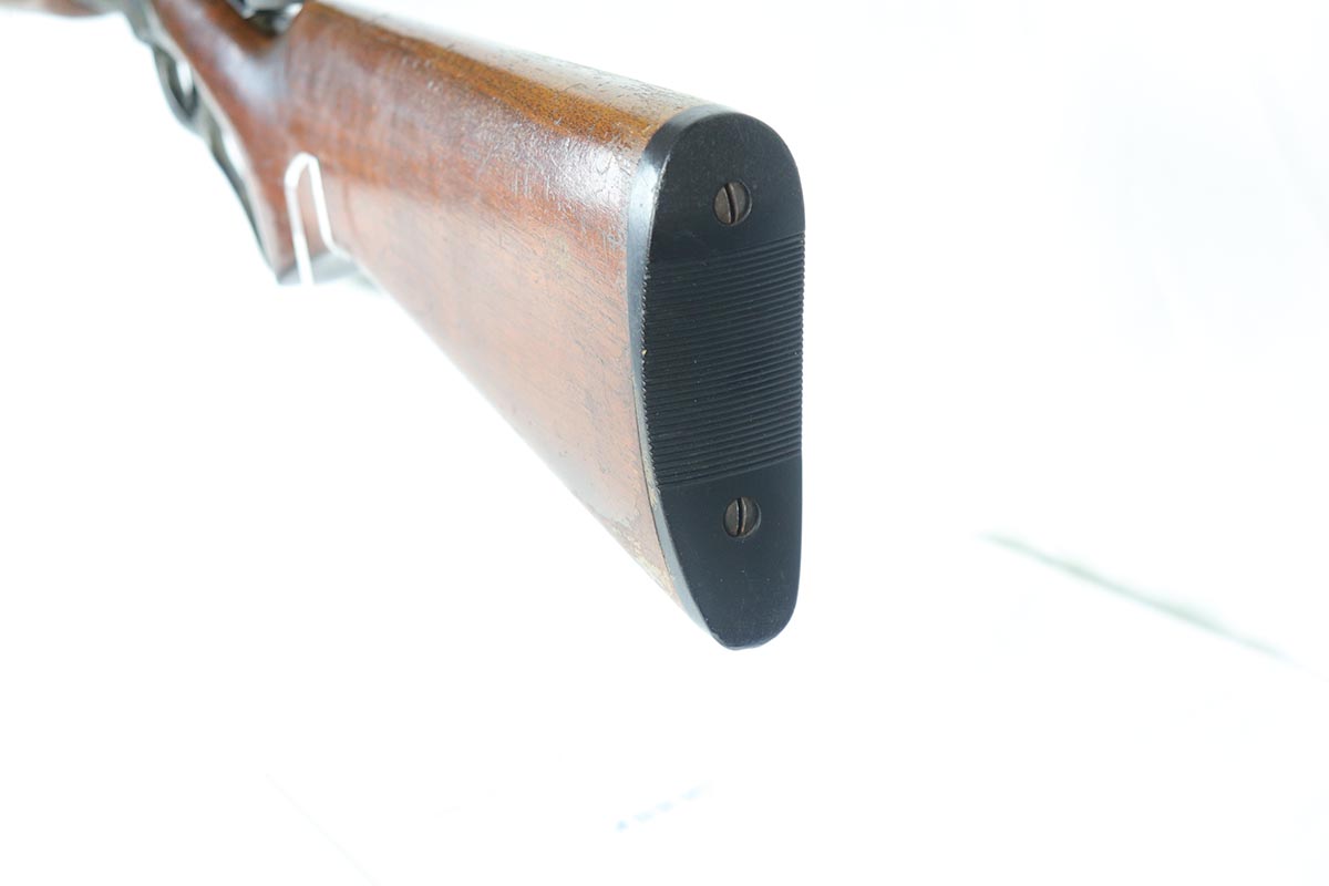7/23/18 – This is a scarce, excellent Marlin Model 39A – second model lever-action rifle. This variation was manufactured in 1941 and is identified by the “B” prefix in the serial and the case colored frame. This rifle is chambered for .22 SL and LR, and retains about 95% original blue with minor muzzle wear and slight thinning on the barrel. The receiver shows a good amount of original case coloring, with minor freckling on the left side. The wood shows minor cosmetic defects but no major cracks or chips. Bore could use a cleaning but has strong rifling and no corrosion. The action is functional but slightly tight.