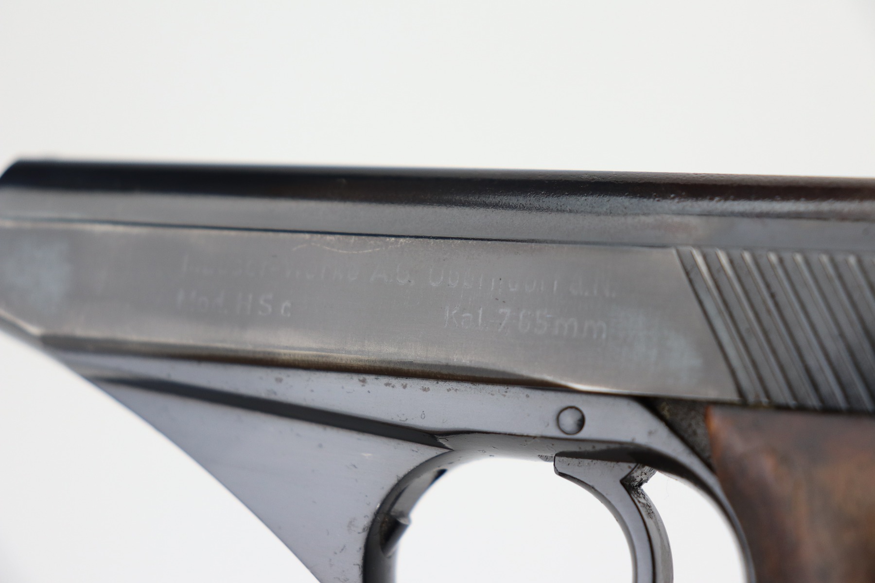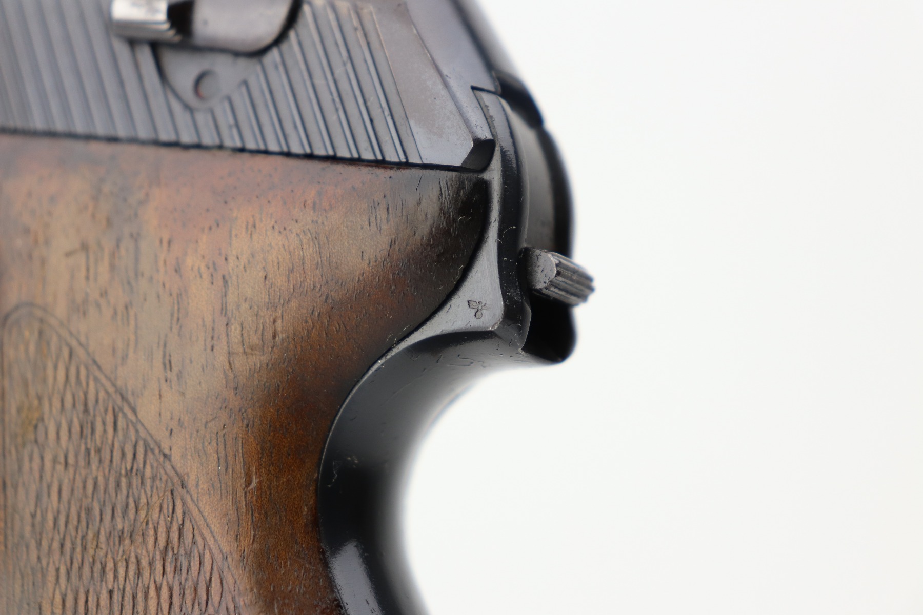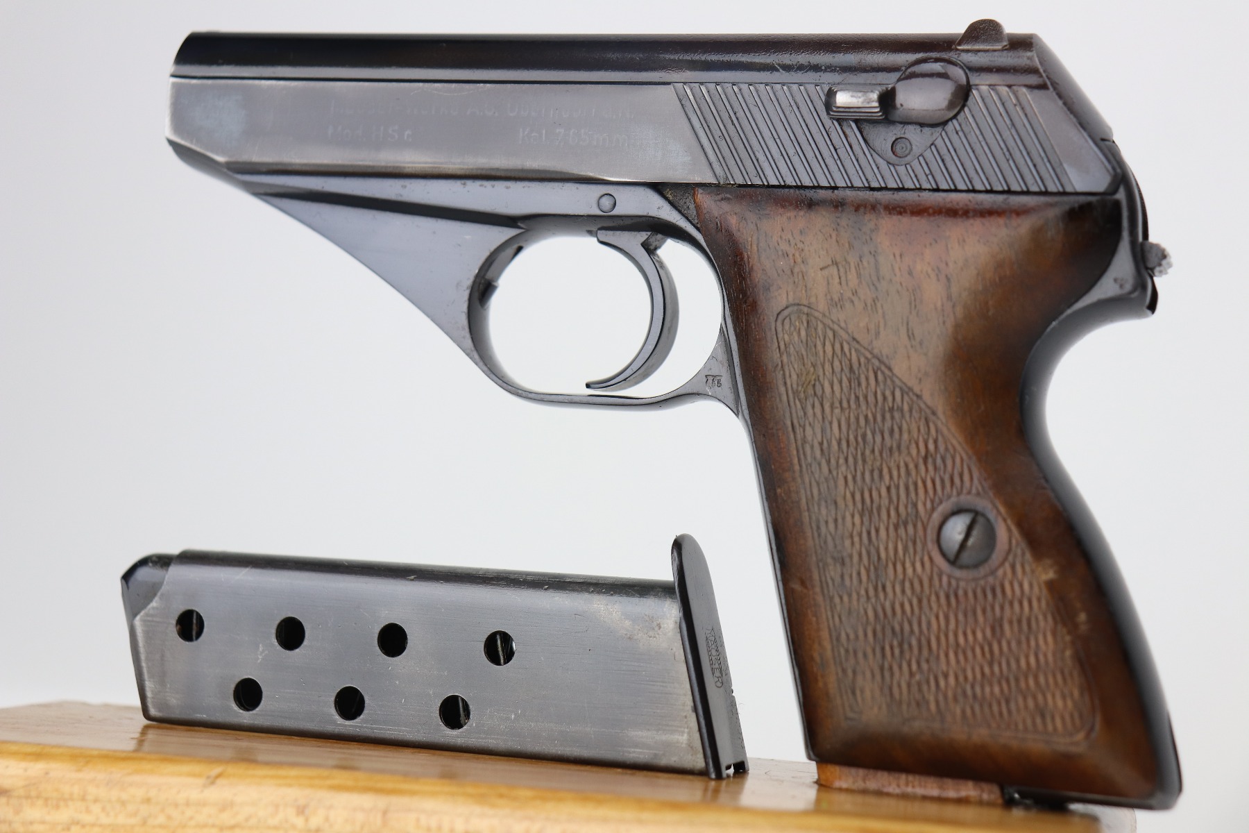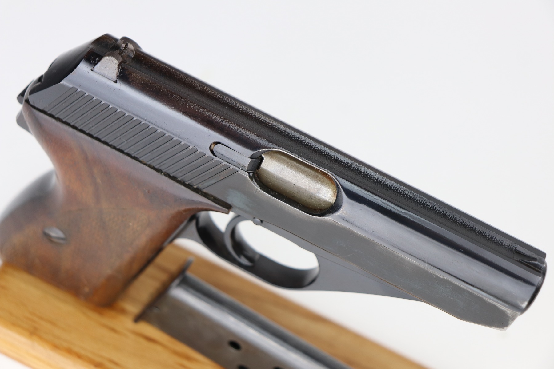 4/6/21 – This is a nice example of the rarest of all of the army Mauser HSC’s. In 1941, Mauser ceased production of the model 1934 in favor of the HSc, and some of the first several thousand procured bear the same proofs as the model 1934 – Eagle/655 on trigger guard and the army test proof on the grip tang. There were only 3,000 of this variation produced. This one has an old re-blued finish. As a result, the slide legend is weak from buffing. It has retained about 96% of this finish. Minor wear on the high edges and around the muzzle. There is discoloration and minor pitting along the top of the slide. Comes with excellent grips and a period-correct magazine. Very nice bore with strong rifling.