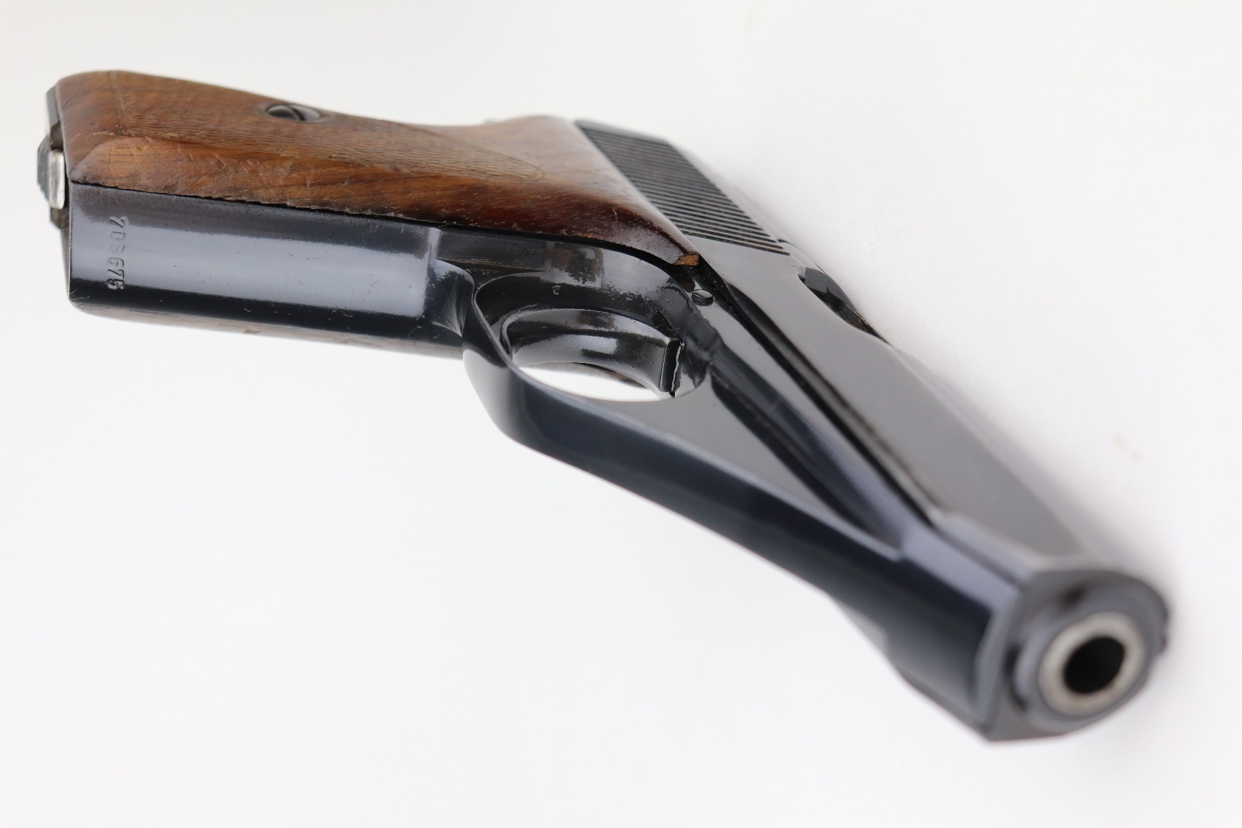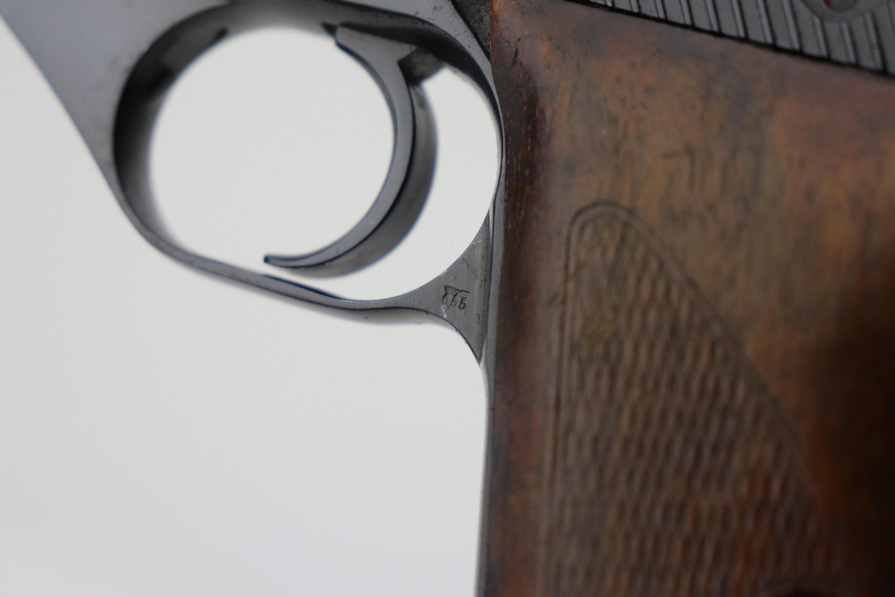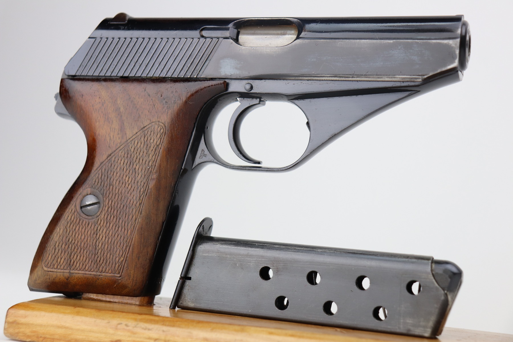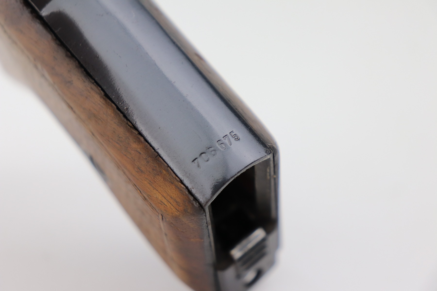 4/6/21 – This is a nice example of the rarest of all of the army Mauser HSC’s. In 1941, Mauser ceased production of the model 1934 in favor of the HSc, and some of the first several thousand procured bear the same proofs as the model 1934 – Eagle/655 on trigger guard and the army test proof on the grip tang. There were only 3,000 of this variation produced. This one has an old re-blued finish. As a result, the slide legend is weak from buffing. It has retained about 96% of this finish. Minor wear on the high edges and around the muzzle. There is discoloration and minor pitting along the top of the slide. Comes with excellent grips and a period-correct magazine. Very nice bore with strong rifling.