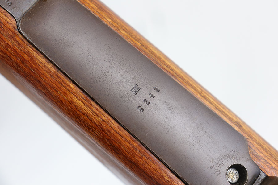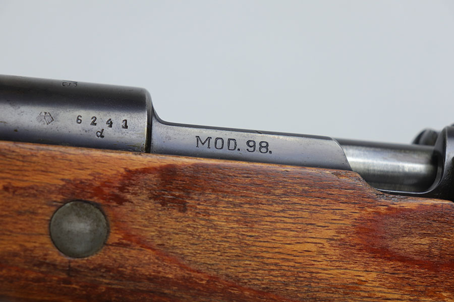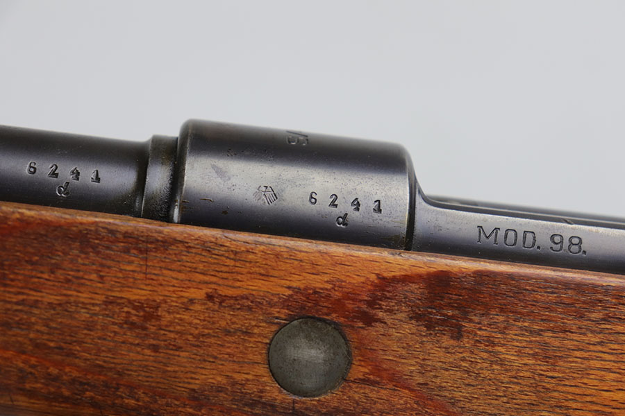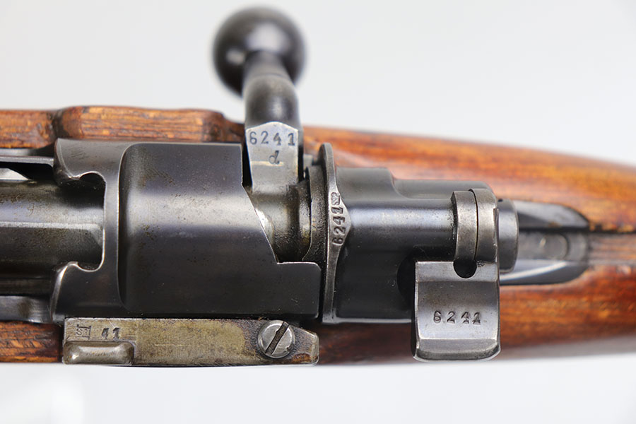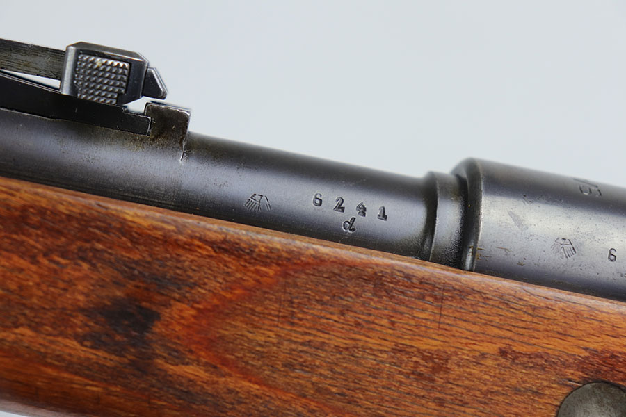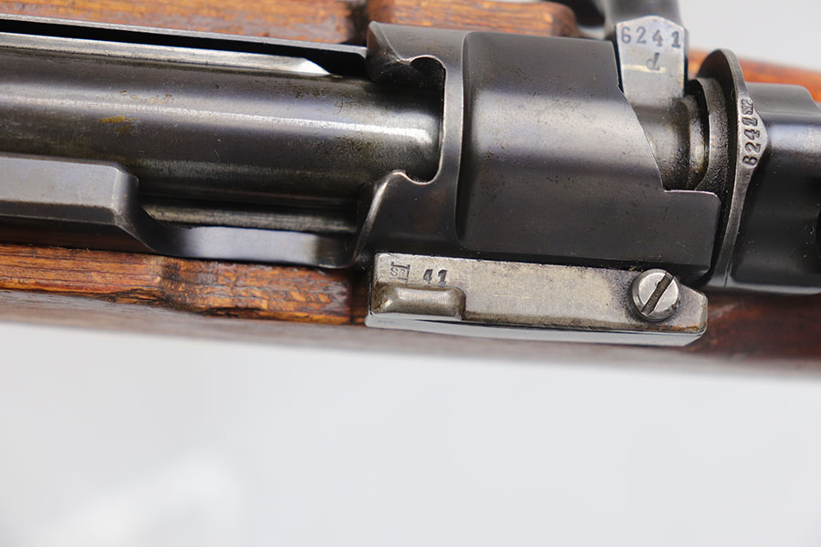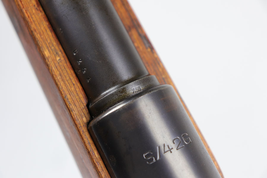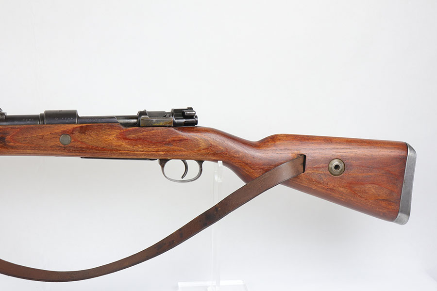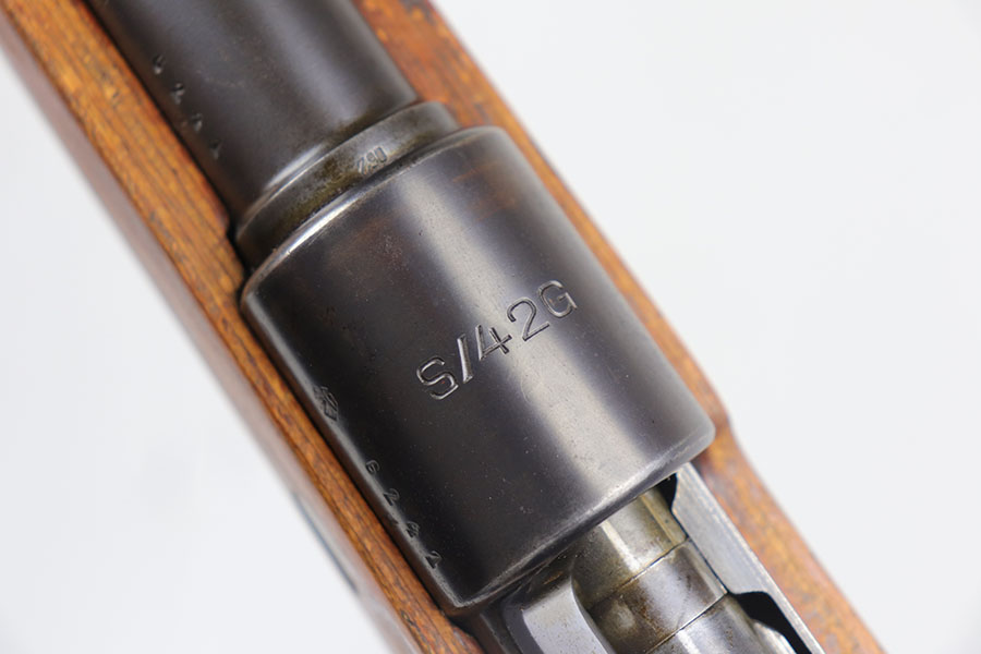 7/24/20 – This is a rare G Date Mauser K98, manufactured in 1935 and featuring all matching numbers and original finish. Introduced during the early years of the Nazi Party’s dominance of Germany, the code system was intended to obscure the scale and speed of German re-armament, and all correct G Date K98s are seldom available to the collector market. The original finish rates at about 80-85% with thinning on the trigger guard, front band and muzzle. There is also a general patina to certain areas, especially the trigger group. The receiver has excellent blue which is uncommon as these early K98s were heavily used. All numbered parts match the receiver, including the hand guard, as well as the stock (internally numbered). The only part we believe to be incorrect on the rifle is the front barrel band. Stock is gorgeous with sharp Heer Army proof on the right side. Loads of early acceptance proofs adorn this rifle as well. Comes with an original sling and cleaning rod. The rod is an early example and numbered ’71’, as opposed to the ’41’ of the rifle. Terrific bore.