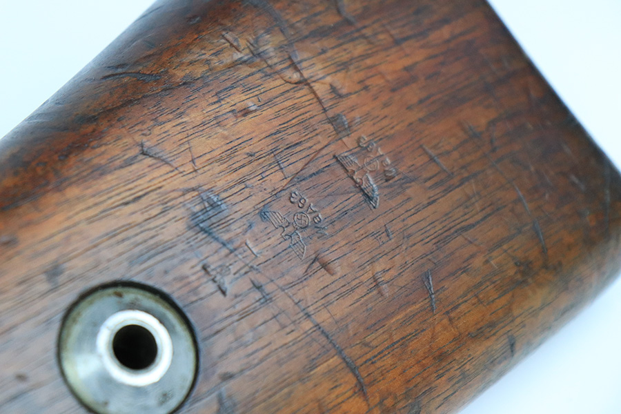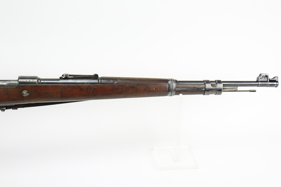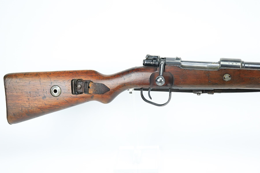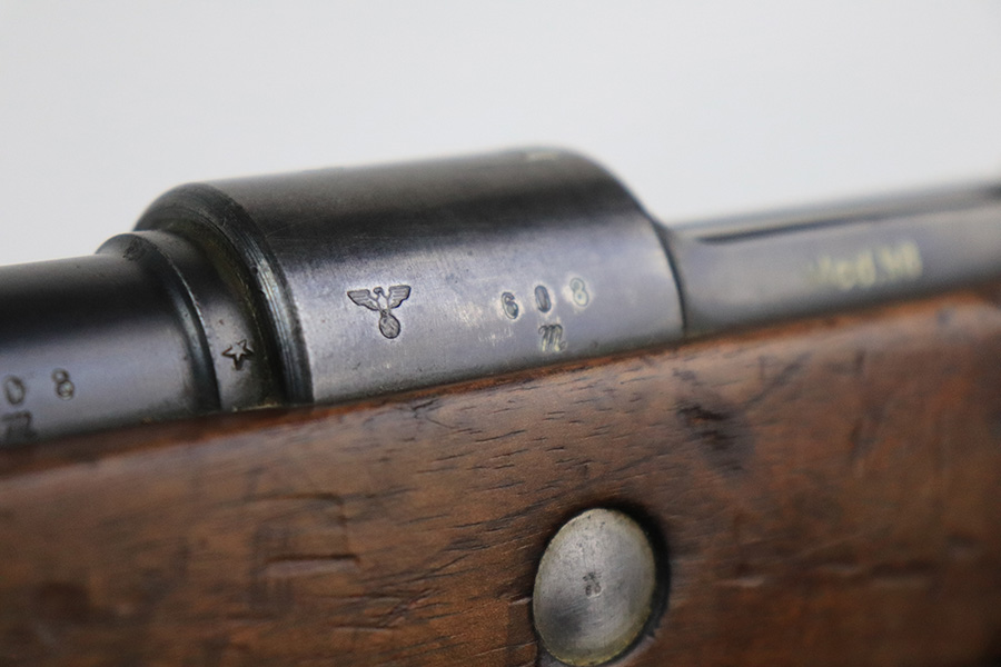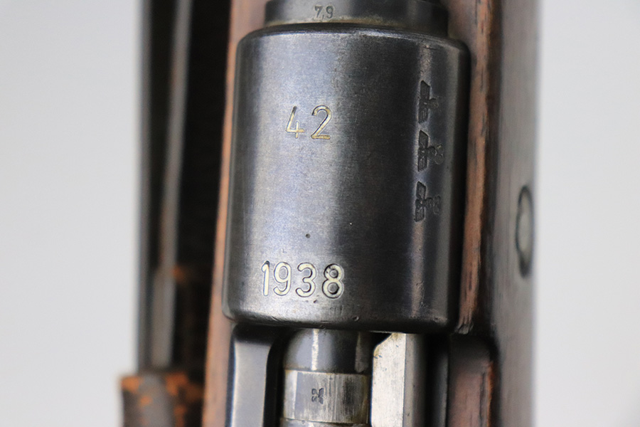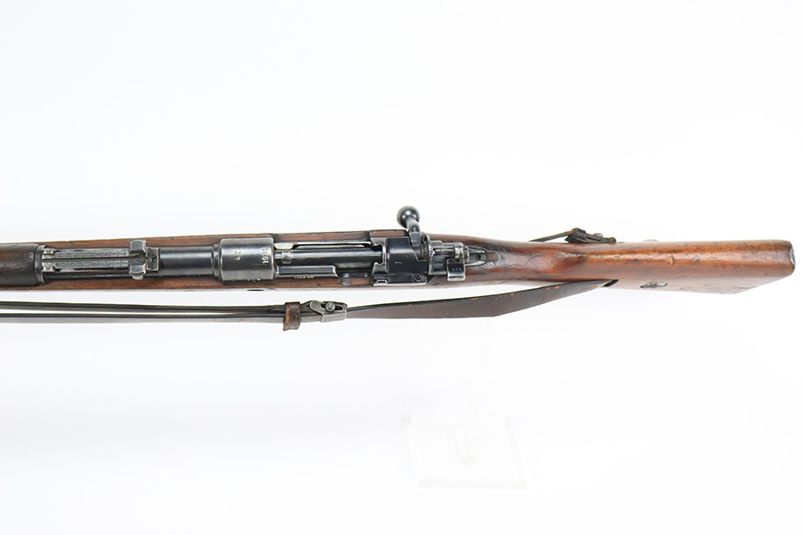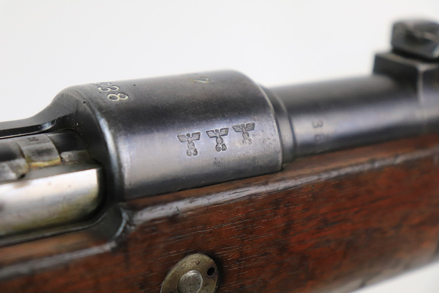 6/21/22 – This is a scarce Mauser K98 from 1938 that was issued as part of a Luftwaffe contract order, as indicated by the Eagle/L on the stock. The rifle is all matching and correct except for the trigger guard/assembly, which has been replaced unfortunately. Matching numbered parts throughout otherwise, including the stock, handguard, buttplate, rear sight assembly, bolt release, bolt assembly, bands, receiver and barrel. The finish on the receiver and bolt shows some thinning but is in good condition overall. The bands show thinning and freckling, and the barrel has some wear and surface scratches. Bore is minty. The stock has various handling dings and scratches but no cracks or structural issues. The listing includes an original sling, cleaning rod and muzzle cover.