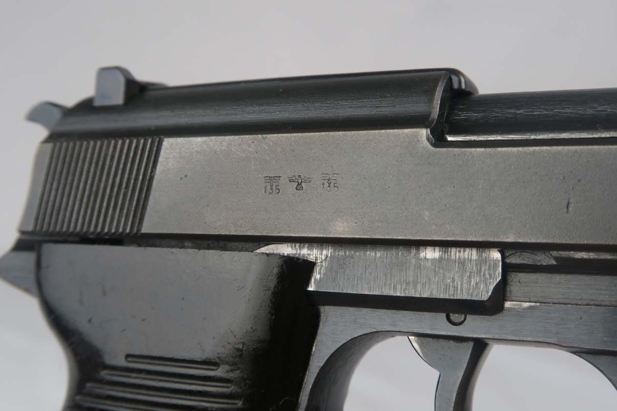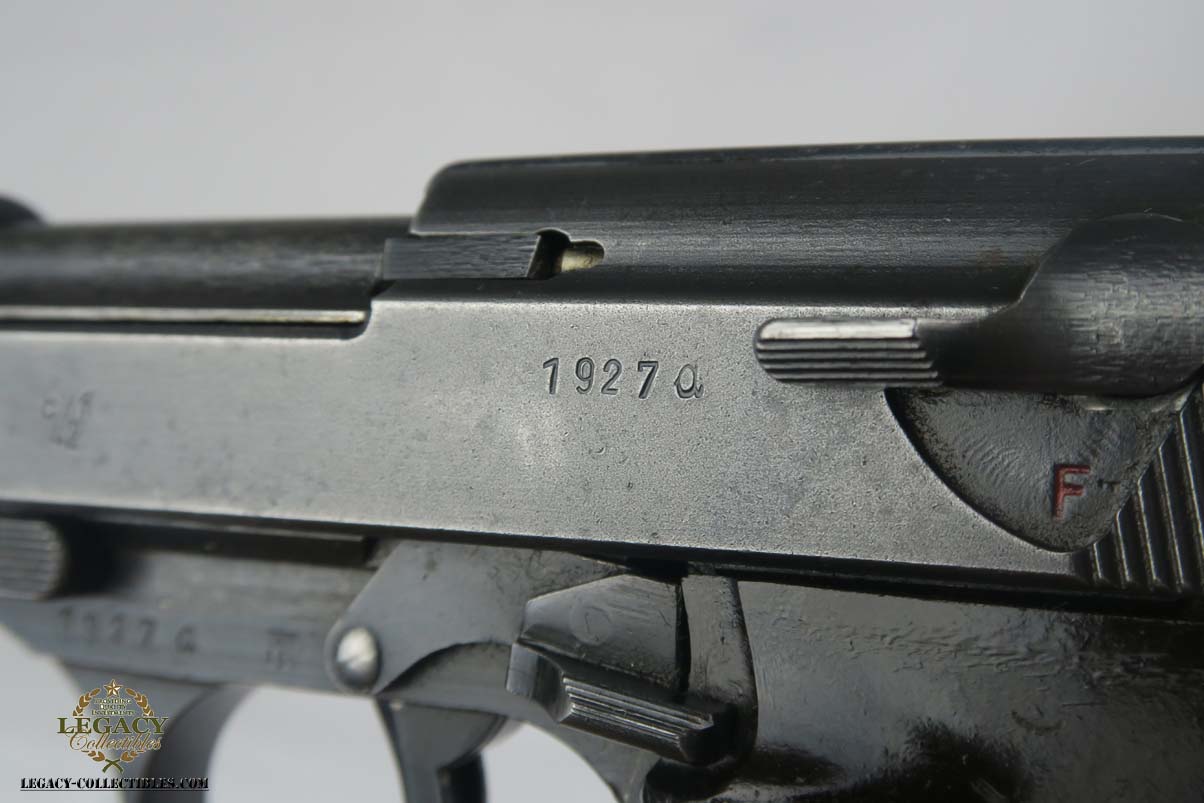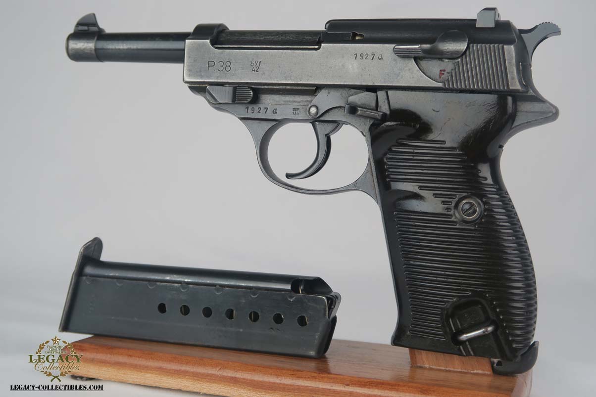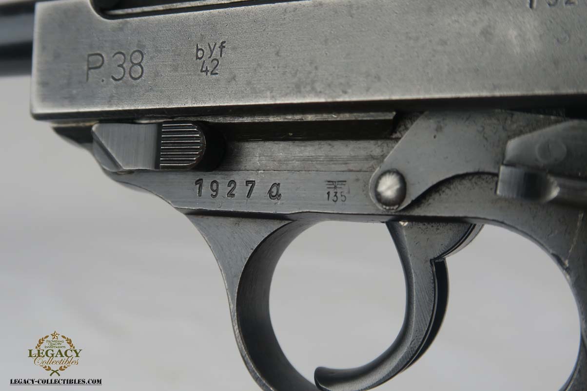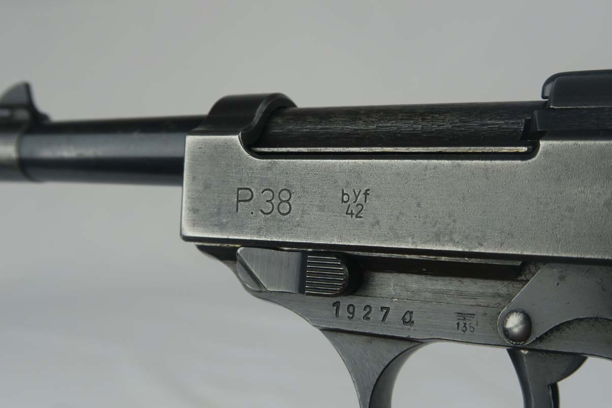 7/19/17 – This is a scarce byf 42 Mauser P.38 – first year of production!  It is all correct and original, with about 93-94% of the original dust blue finish remaining.  The color has lightened some over the years, and there is some minor edge wear.  Nice grips and Eagle/135 mag.  Bore has some freckling throughout but it should still function okay.
