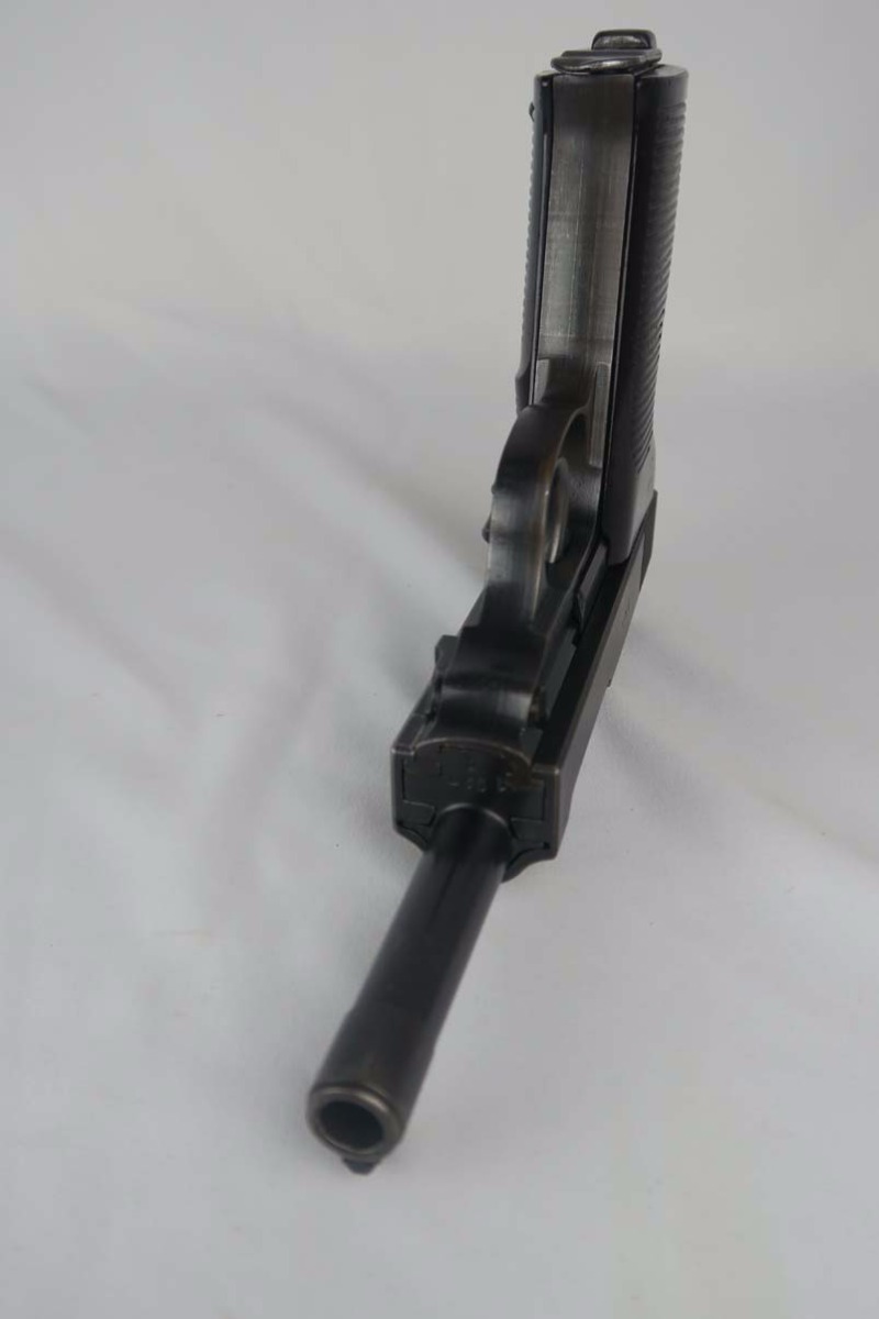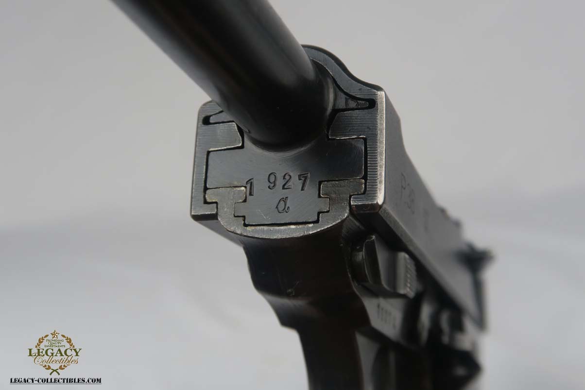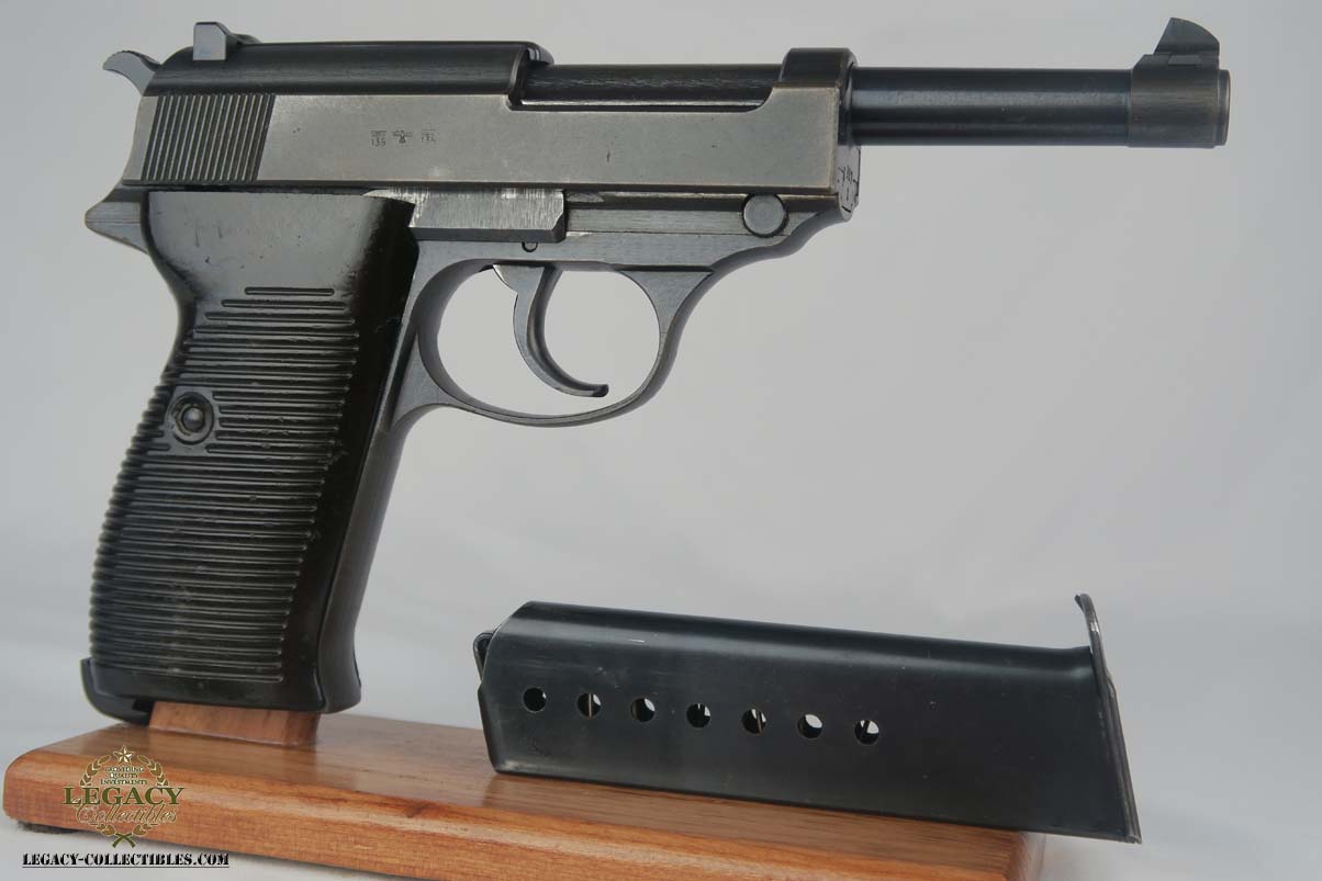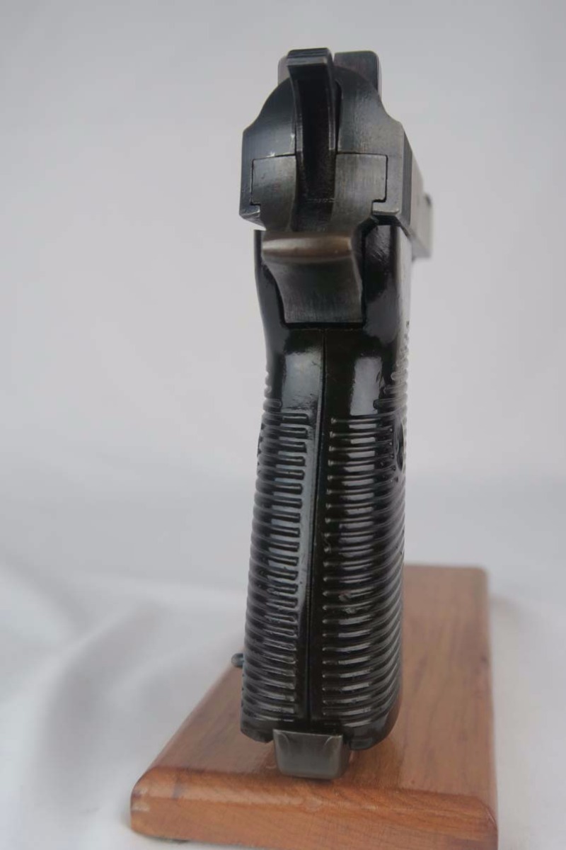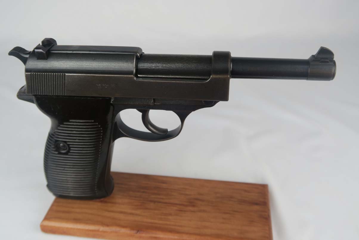 7/19/17 – This is a scarce byf 42 Mauser P.38 – first year of production!  It is all correct and original, with about 93-94% of the original dust blue finish remaining.  The color has lightened some over the years, and there is some minor edge wear.  Nice grips and Eagle/135 mag.  Bore has some freckling throughout but it should still function okay.