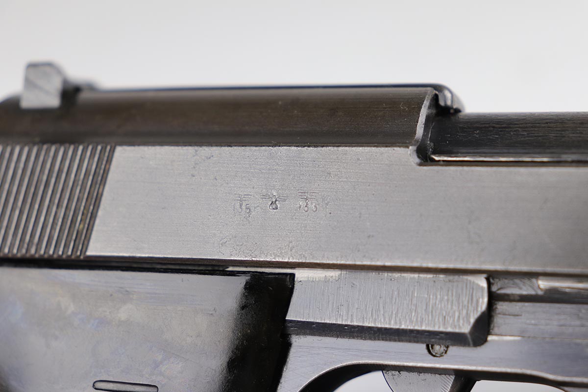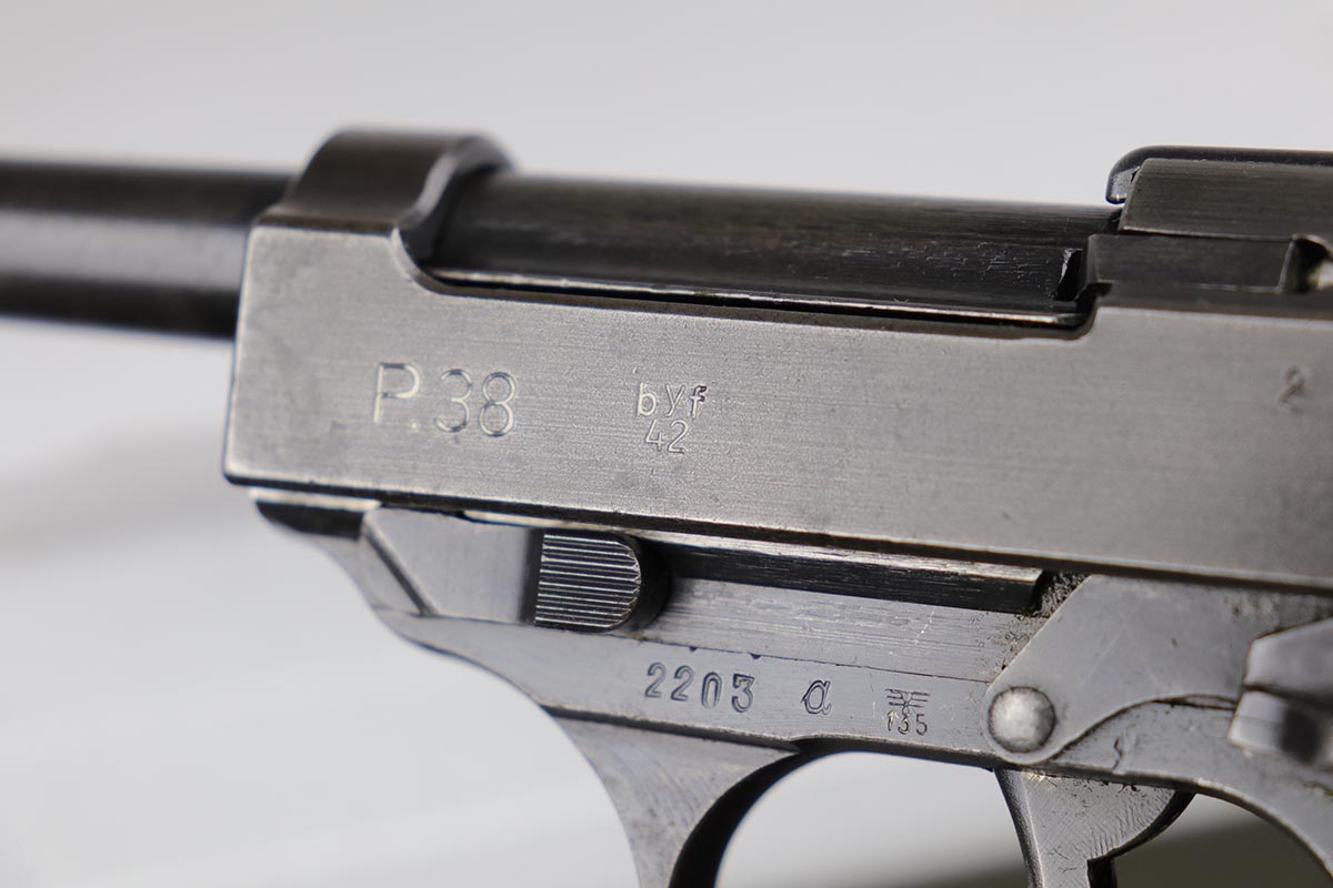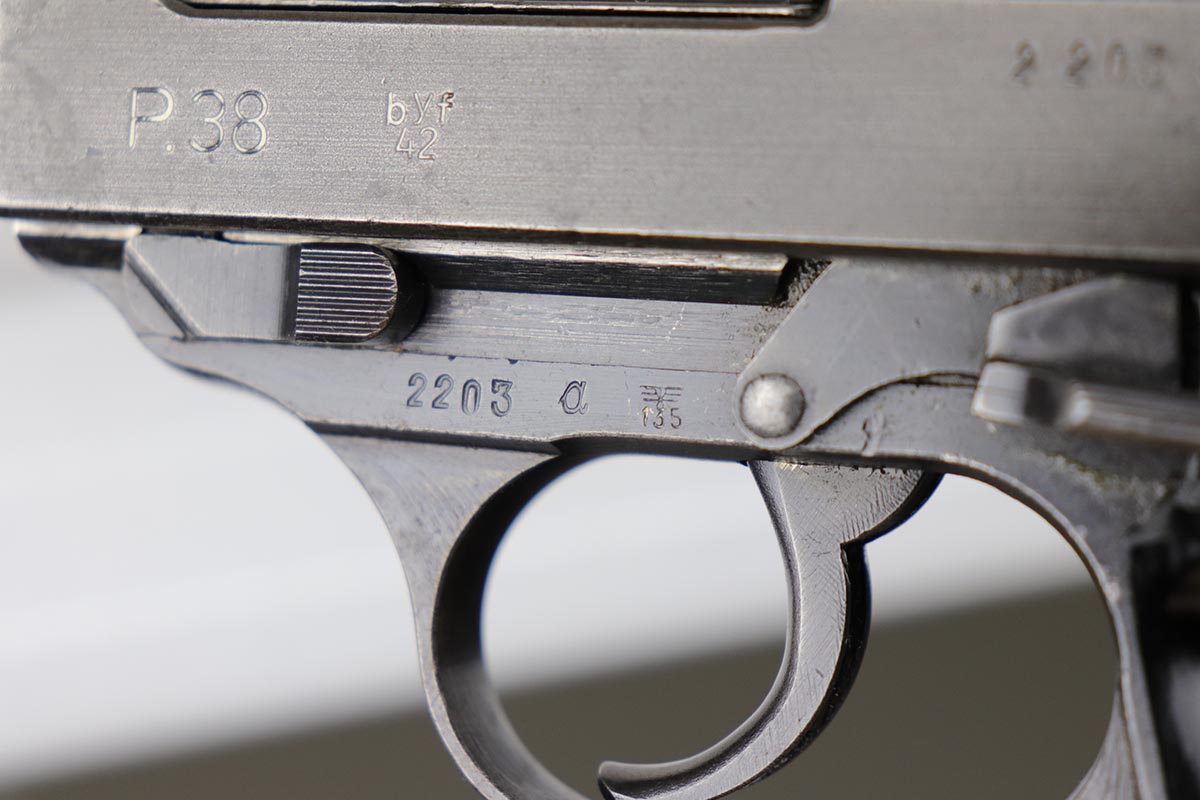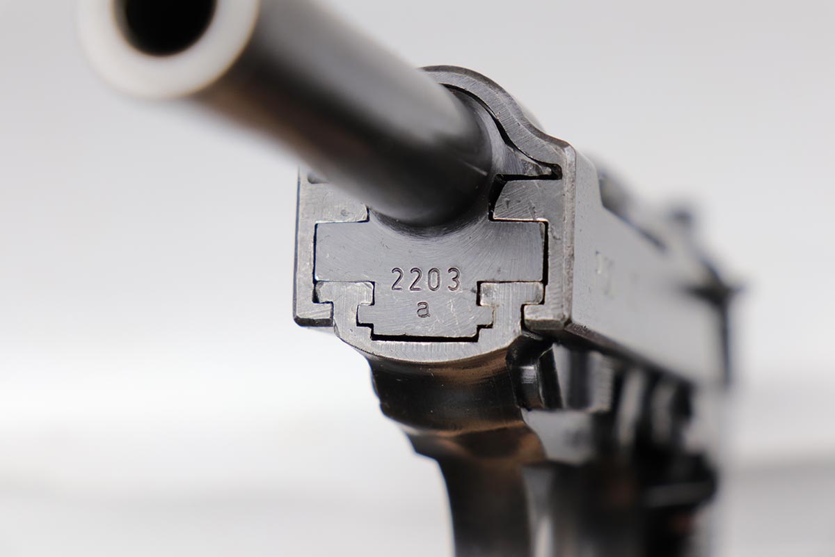 2/21/20 – This is a nice example of a rare Mauser P.38, made in 1942, the first year of production. There were fewer than 20,000 of this variation produced, which is a very low production total for any wartime P.38 variation. This particular gun is all matching with 90-92% of the original, dust blue finish remaining. There is minor finish loss on the left side of the slide, toward the front edge, and a little more on the muzzle. There is also some thinning/browning on the front strap. Excellent bore and good mechanics. Very nice grips and a Mauser made magazine.