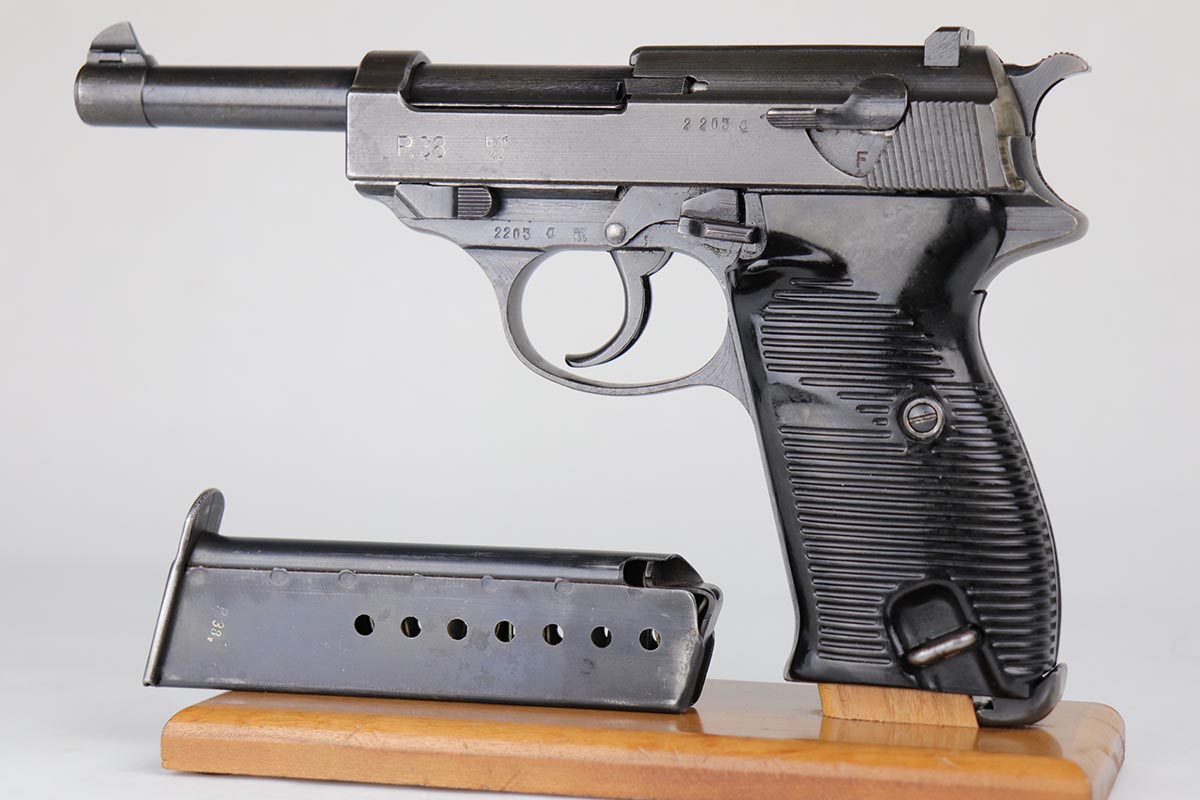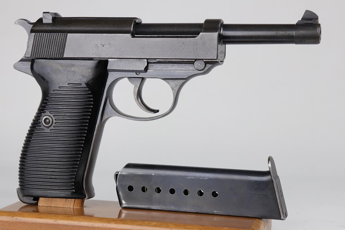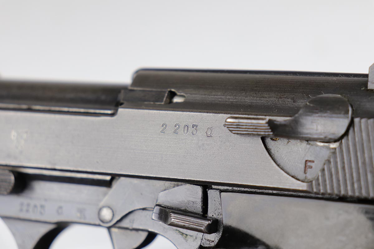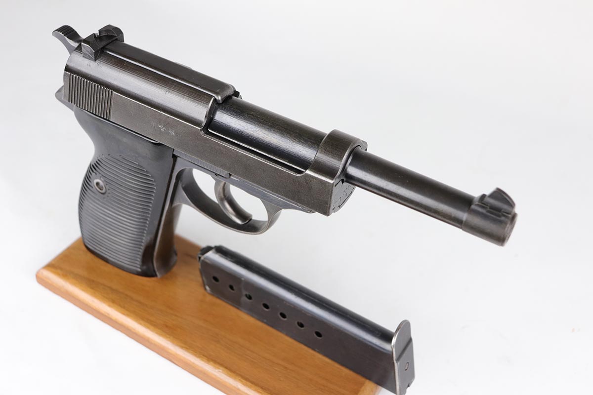 2/21/20 – This is a nice example of a rare Mauser P.38, made in 1942, the first year of production. There were fewer than 20,000 of this variation produced, which is a very low production total for any wartime P.38 variation. This particular gun is all matching with 90-92% of the original, dust blue finish remaining. There is minor finish loss on the left side of the slide, toward the front edge, and a little more on the muzzle. There is also some thinning/browning on the front strap. Excellent bore and good mechanics. Very nice grips and a Mauser made magazine.