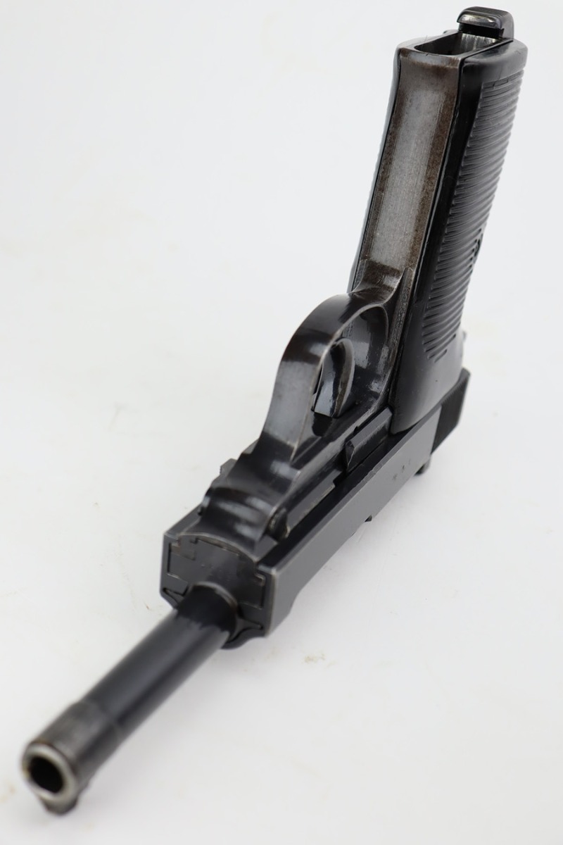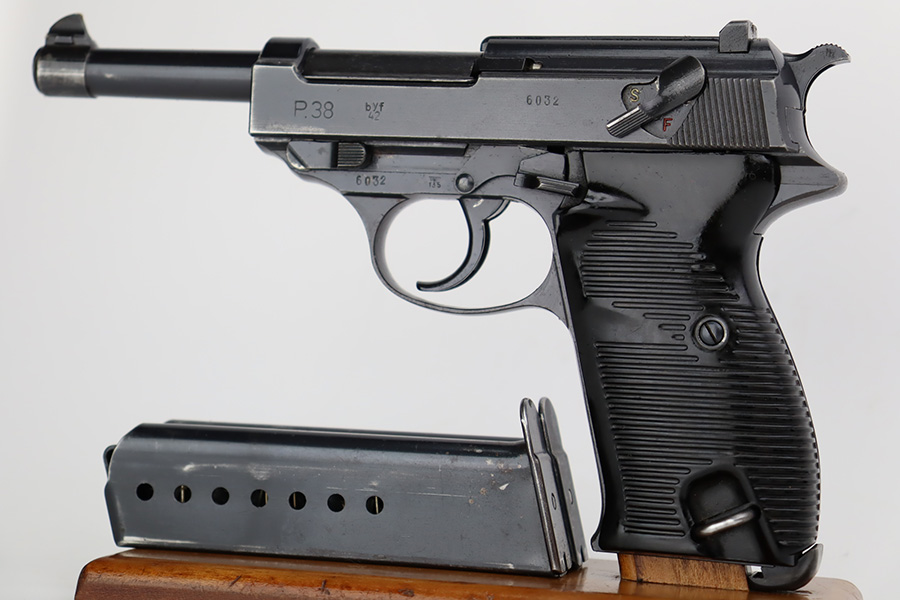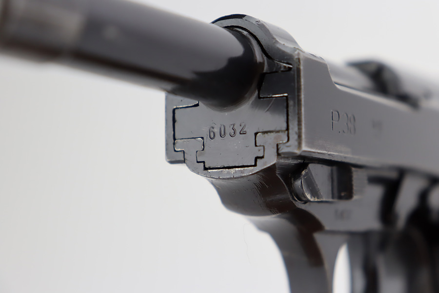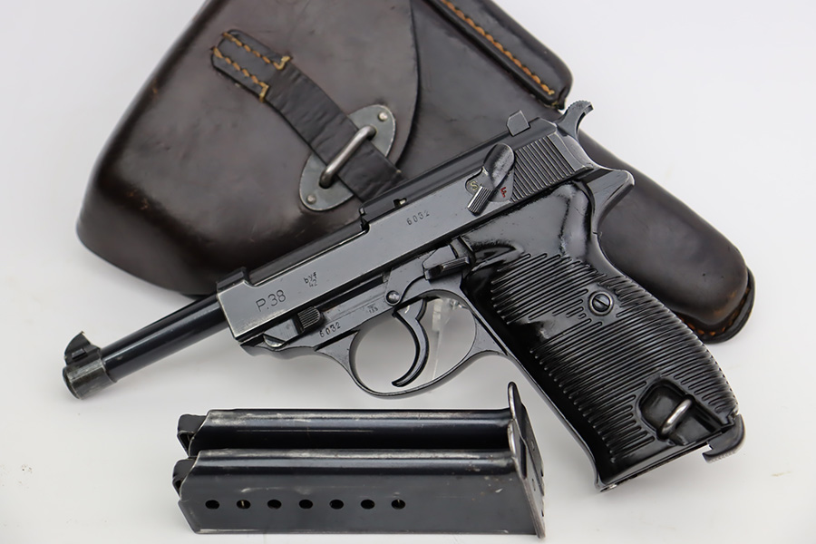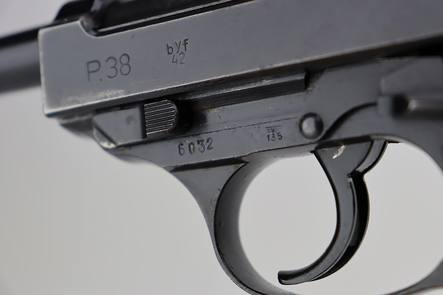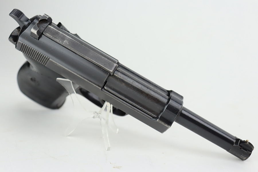 9/19/23 – This is an excellent example of a rare Mauser P.38 rig issued to the Nazi military in 1942. It is a first-year Mauser production, where only 19,000 of these were made, making it only slightly more common than the zero series or Nazi-marked svw 45’s. The pistol is all matching and original with desirable dust blue finished slide. The bluing rates at about 94-95%. There is minor wear around the muzzle and on the high edges of the slide. Very minor thinning and some spotty patina on the front strap. Fitted with excellent period-correct black bakelite grips. The bore has good rifling, but there is pin-pricking throughout. De-cocker is functional. It comes as a rig with a hard shell holster, an “Eagle 135” marked Mauser magazine, and an “Eagle 359” marked Walther magazine.