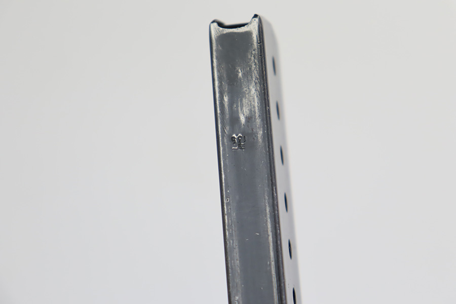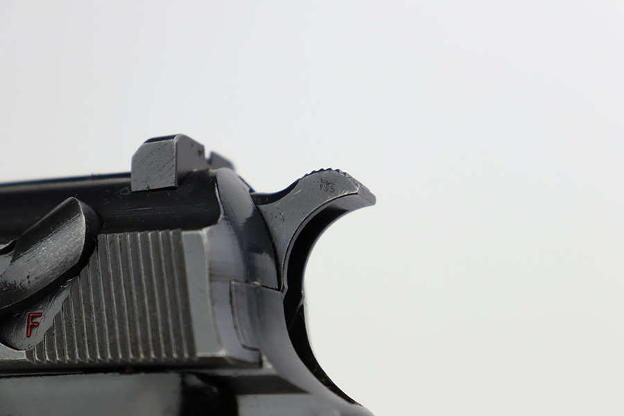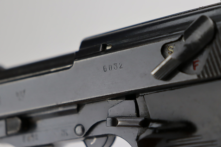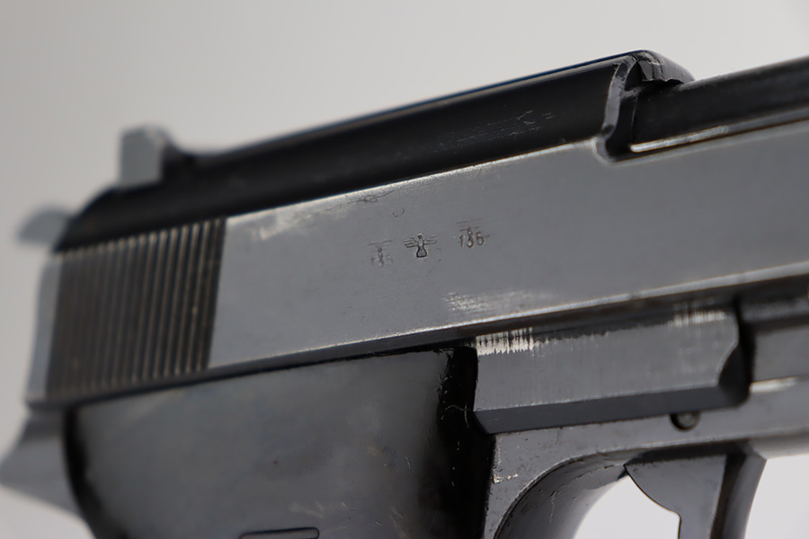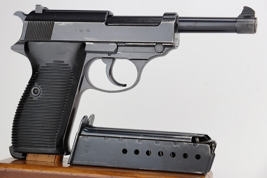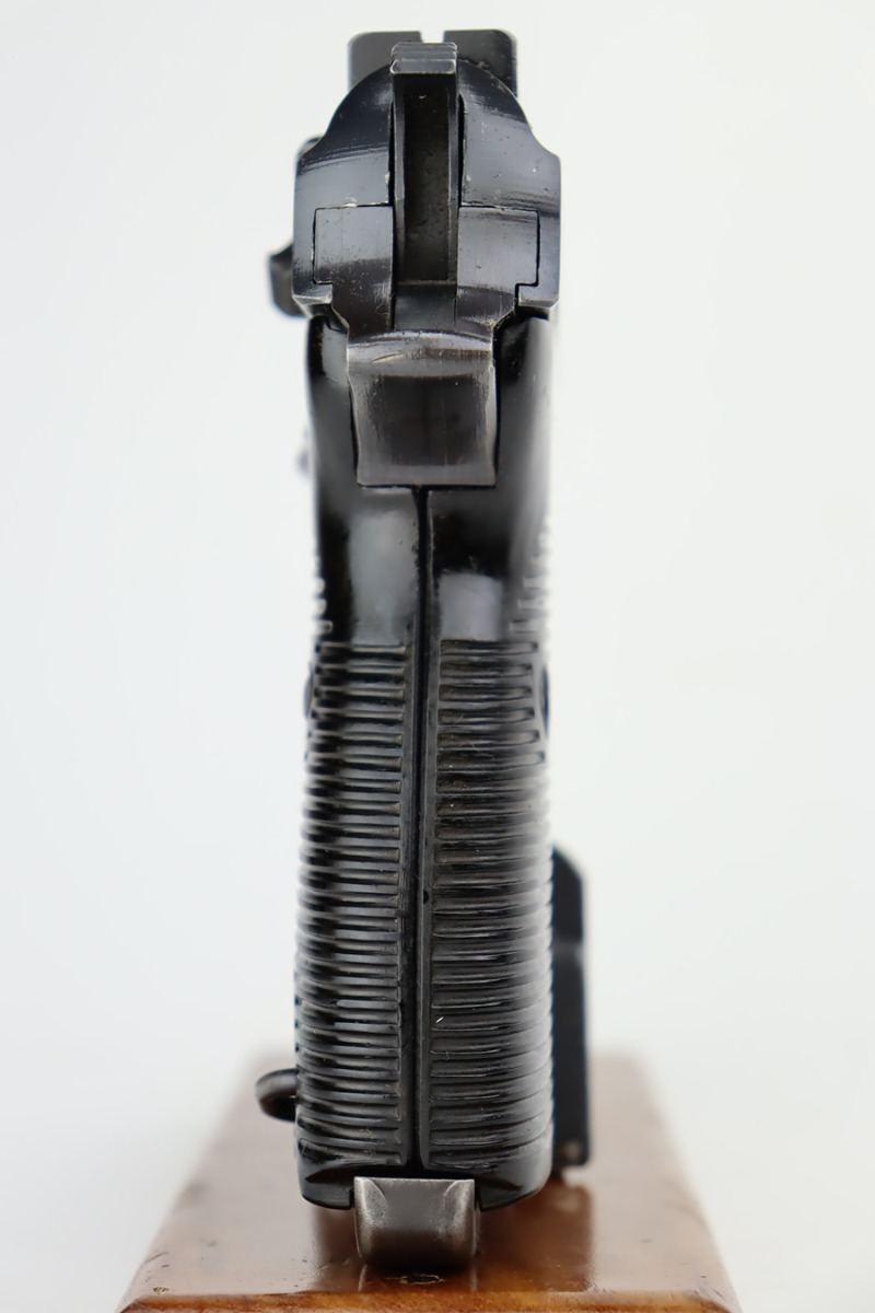 9/19/23 – This is an excellent example of a rare Mauser P.38 rig issued to the Nazi military in 1942. It is a first-year Mauser production, where only 19,000 of these were made, making it only slightly more common than the zero series or Nazi-marked svw 45’s. The pistol is all matching and original with desirable dust blue finished slide. The bluing rates at about 94-95%. There is minor wear around the muzzle and on the high edges of the slide. Very minor thinning and some spotty patina on the front strap. Fitted with excellent period-correct black bakelite grips. The bore has good rifling, but there is pin-pricking throughout. De-cocker is functional. It comes as a rig with a hard shell holster, an “Eagle 135” marked Mauser magazine, and an “Eagle 359” marked Walther magazine.