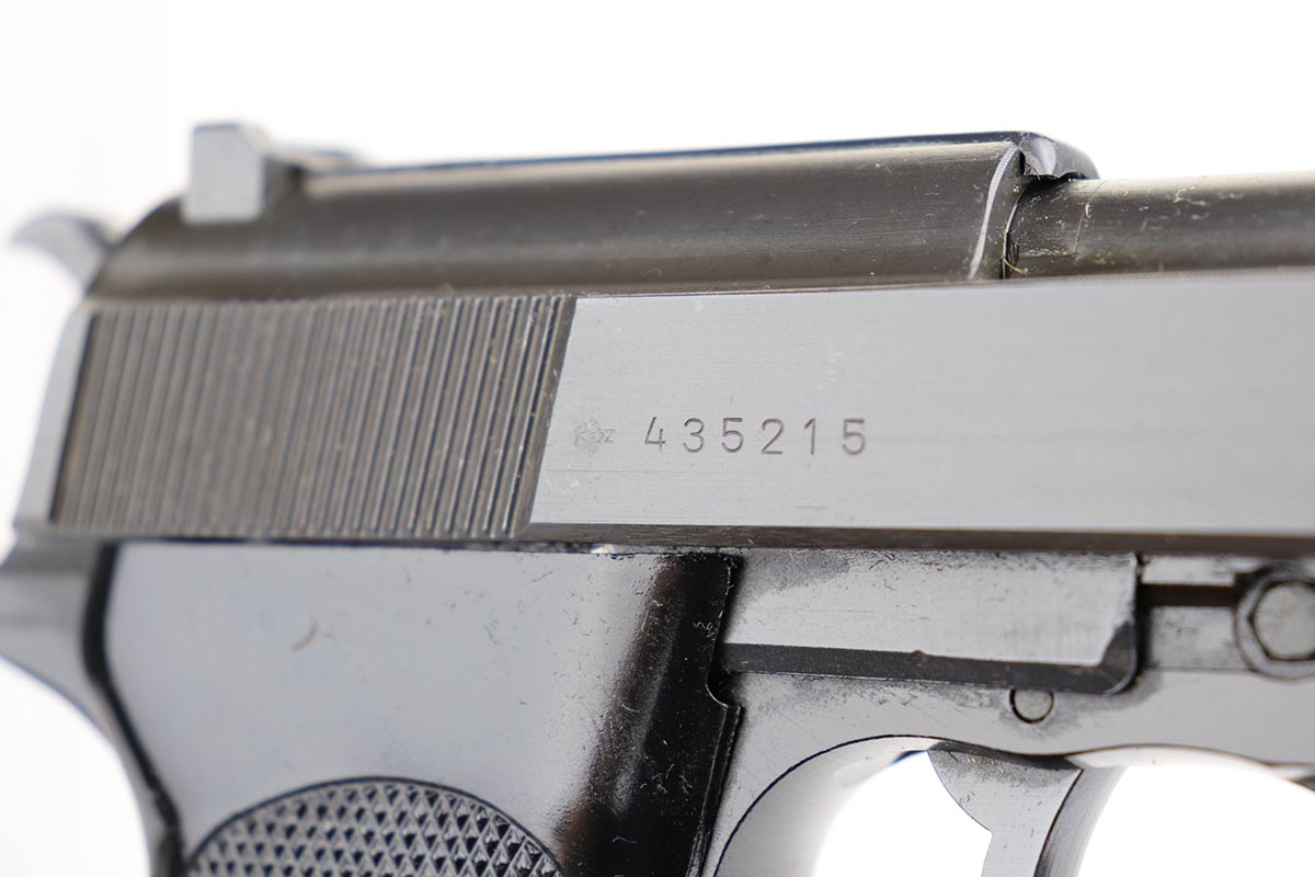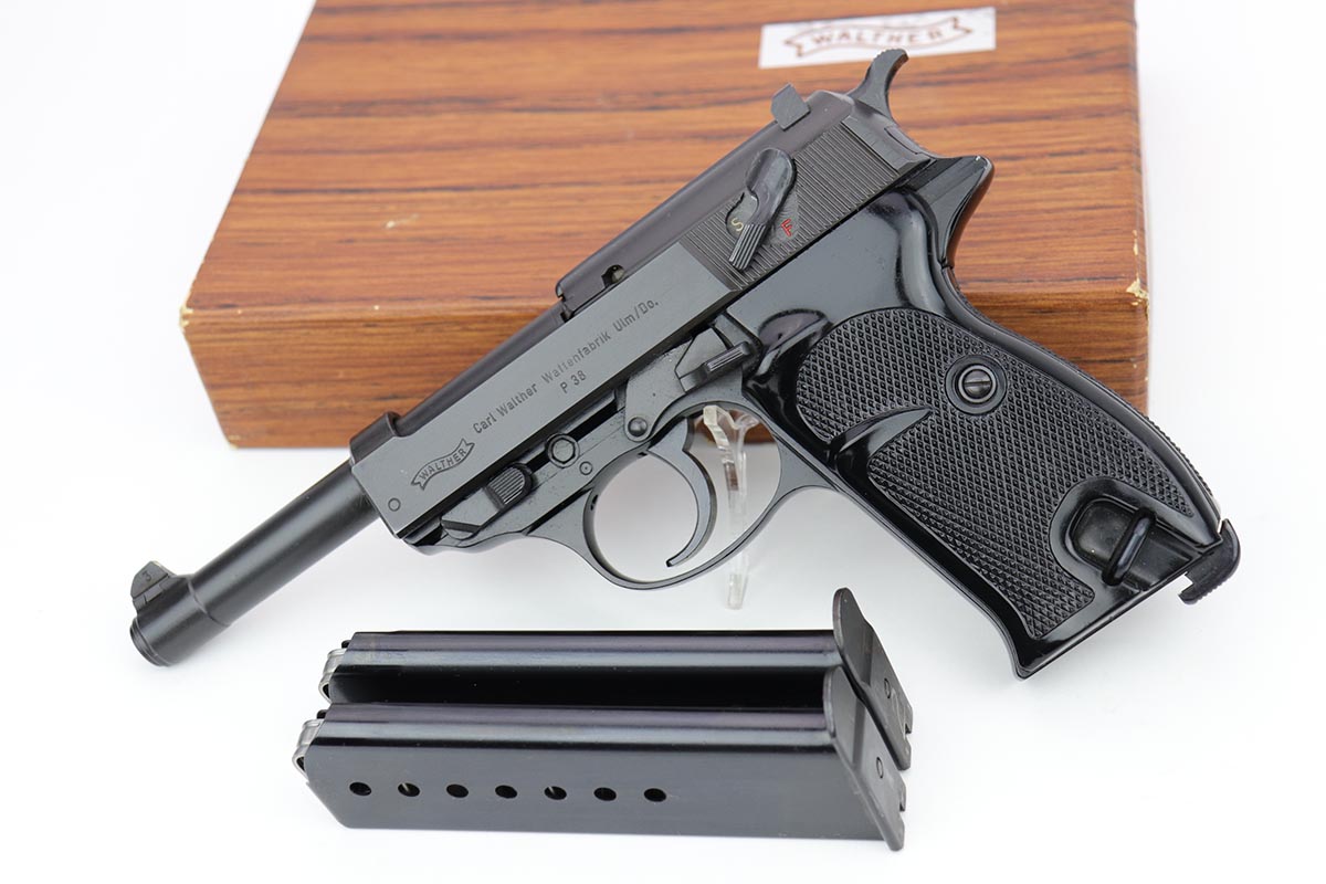 2/6/20 – This is a scarce commercial Walther P.38 in the original box, with original manual and matching test target. This is an especially desirable variant as it has no import mark, despite being manufactured in 1982. The gun is mint, and appears nearly unfired. The grips do have a very minor scratch on each side, but the gun otherwise can’t be upgraded. Box is numbered to the gun, as is the target. Box includes manual and spare magazine.