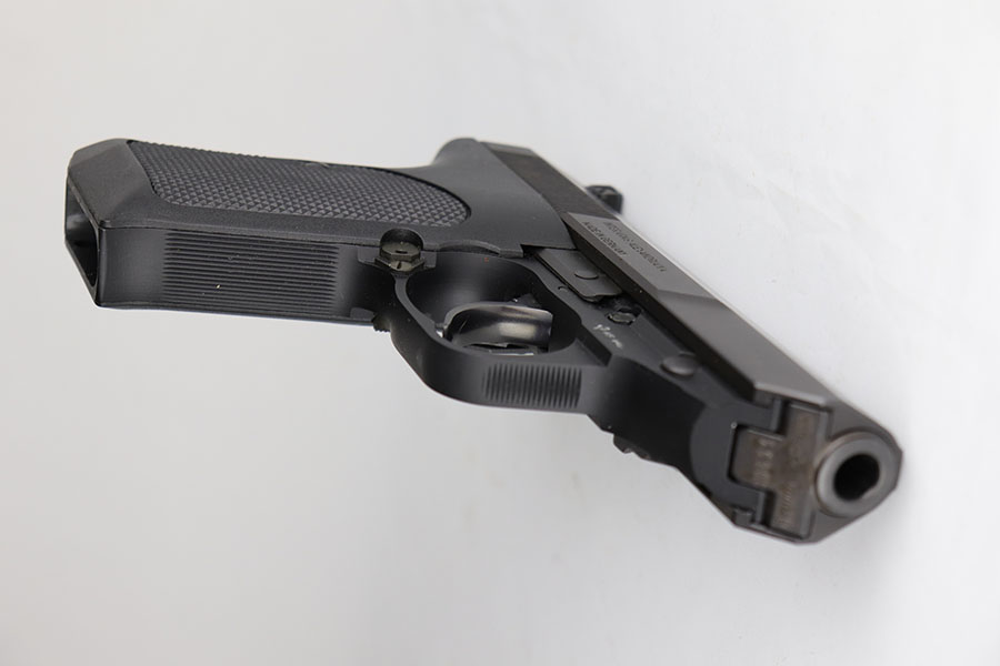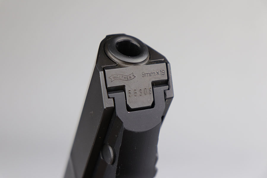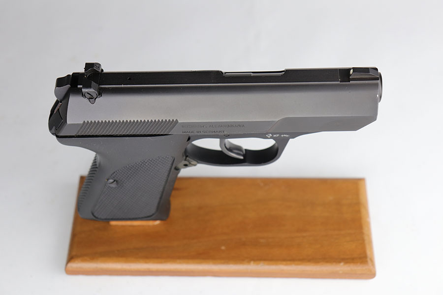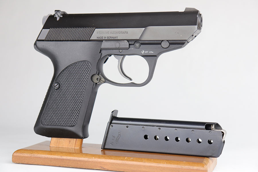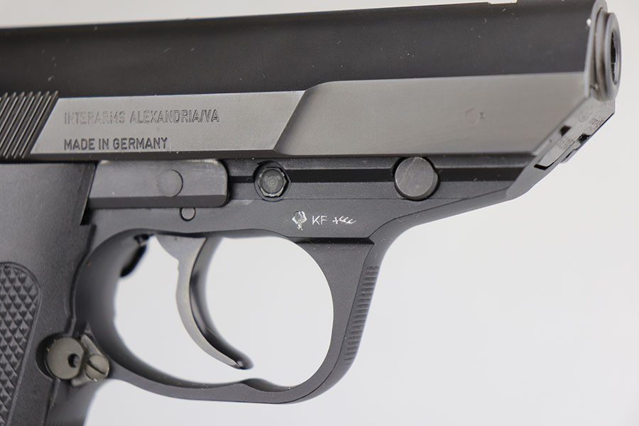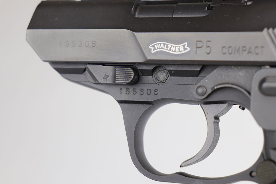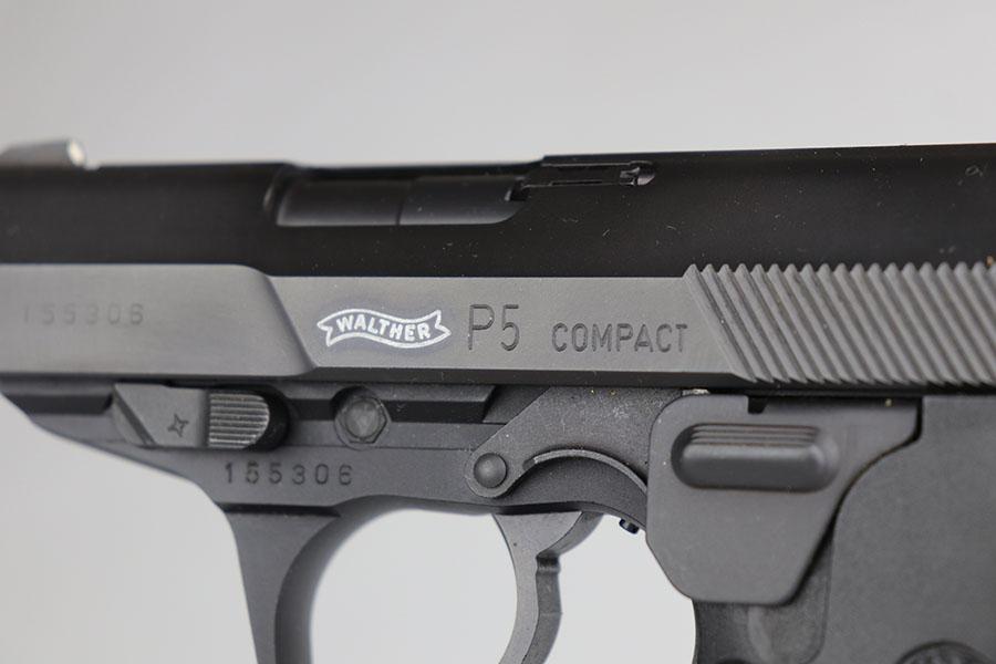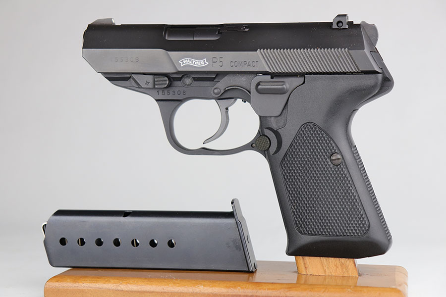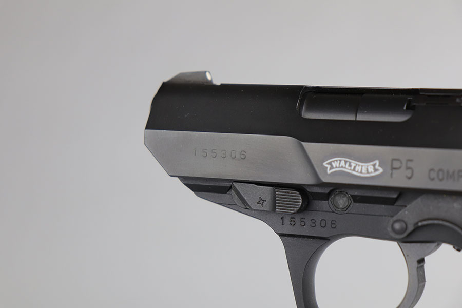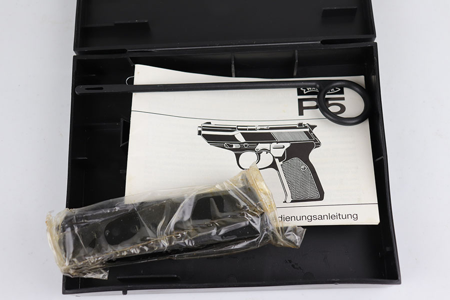 6/17/20 – This is a minty and rare Walther P5 Compact in box with manual, cleaning rod and spare magazine. There were only 6,500 of this model produced for the commercial market. The pistol is virtually mint and has hardly any sign of being fired, but there is a minor spot of discoloration underneath the muzzle. Date code indicates this one was made in 1995. Box appears original and correct but the label came off at some point. Interarms import mark on slide.