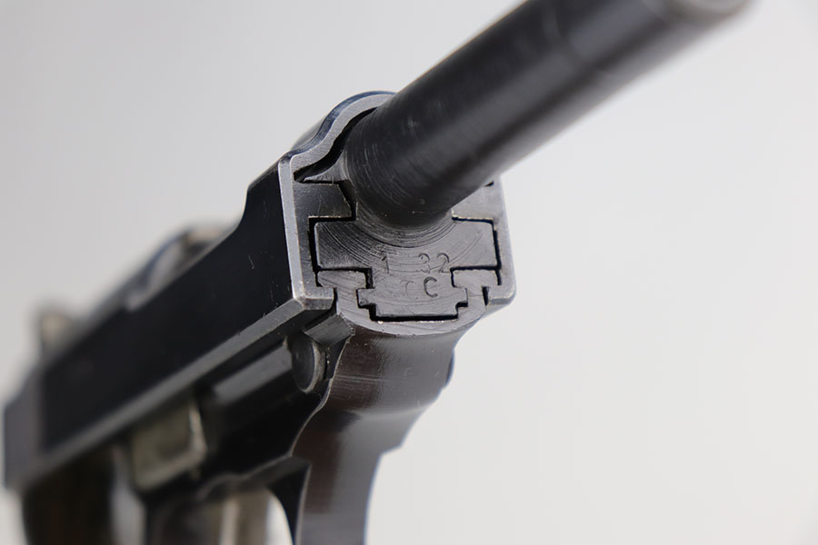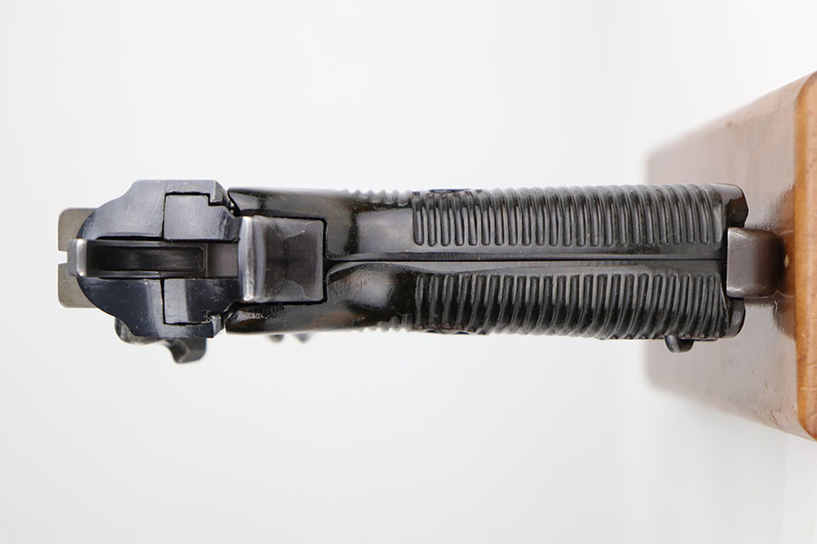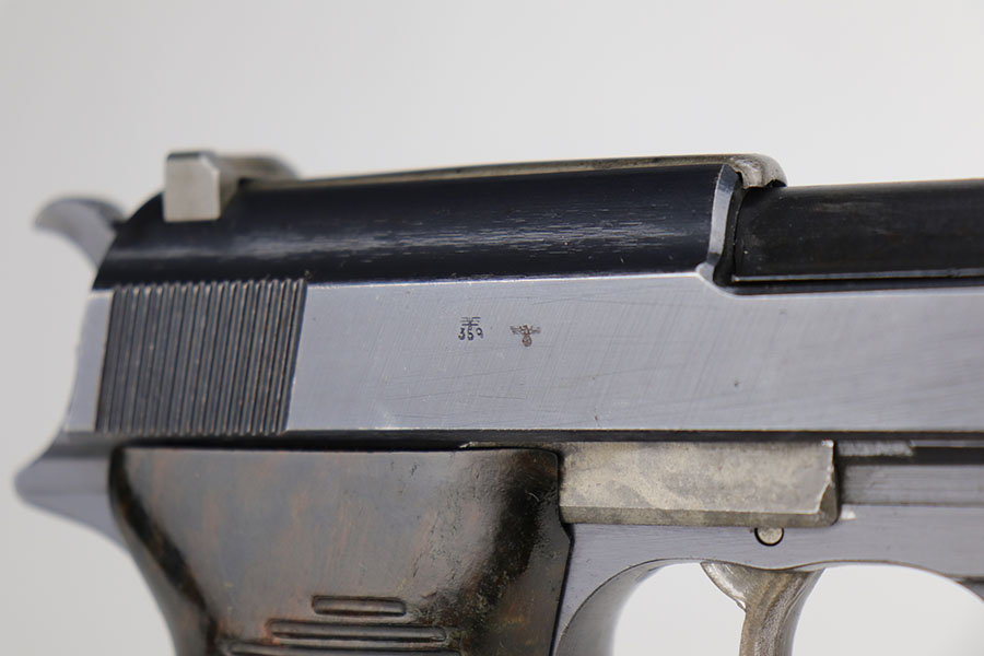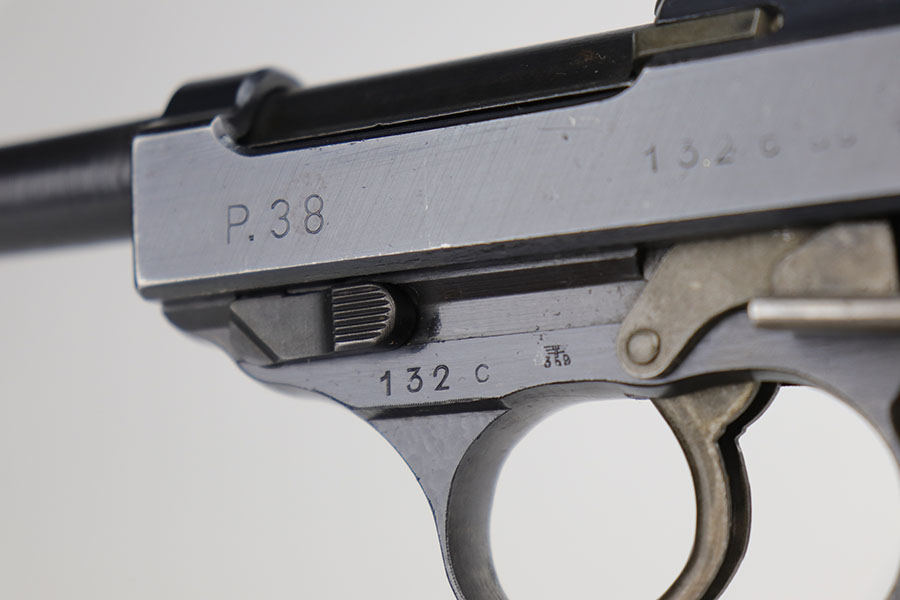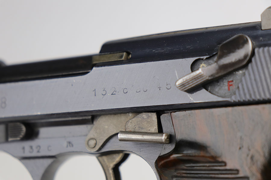 3/25/21 – This is an interesting and minty Walther P.38 from April of 1945, one of the last produced with all matching numbers. The barrel is WaA76 proofed, indicating it was made at the FNH factory. The original finish rates at 99% with just a bit of high edge wear but no major defects. Minty bore and good mechanics. Scarce Posselt grips with cool tiger stripe pattern. Small parts are a mix of blued and phosphate finishes, even the grip screw has a phosphate finish!