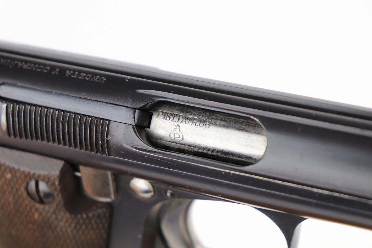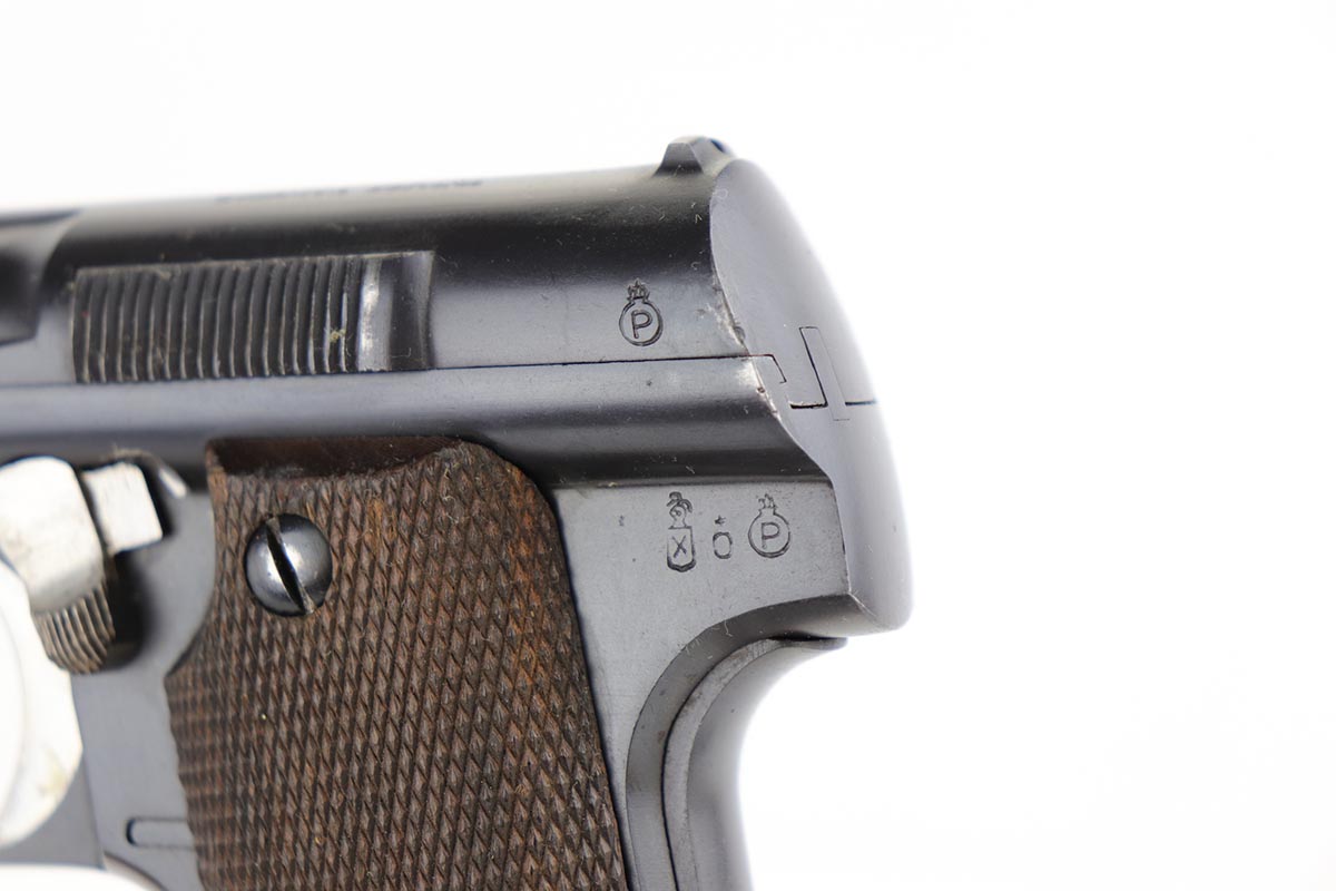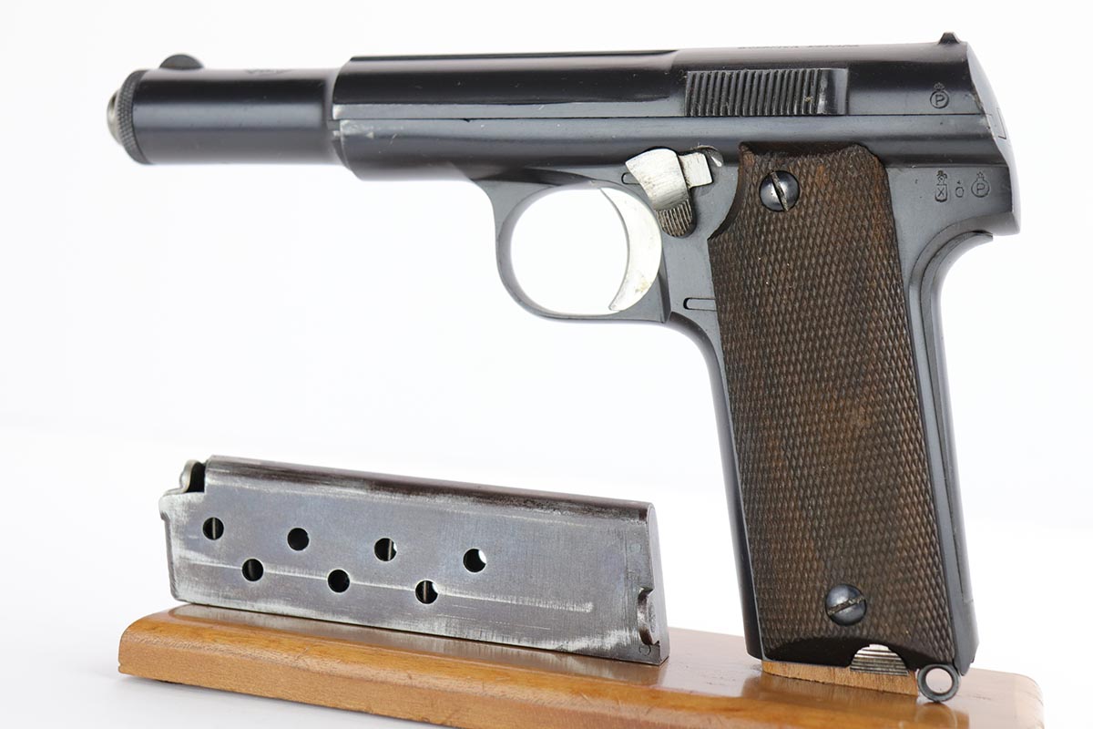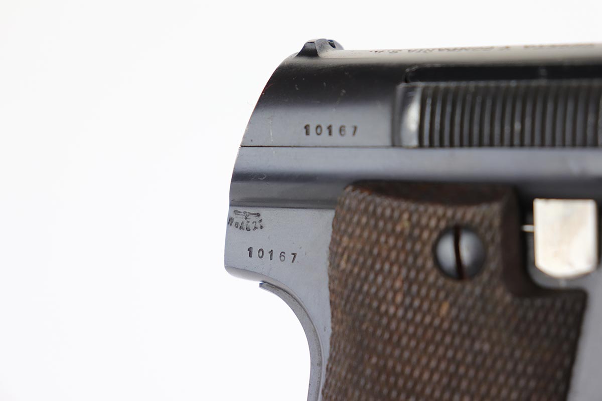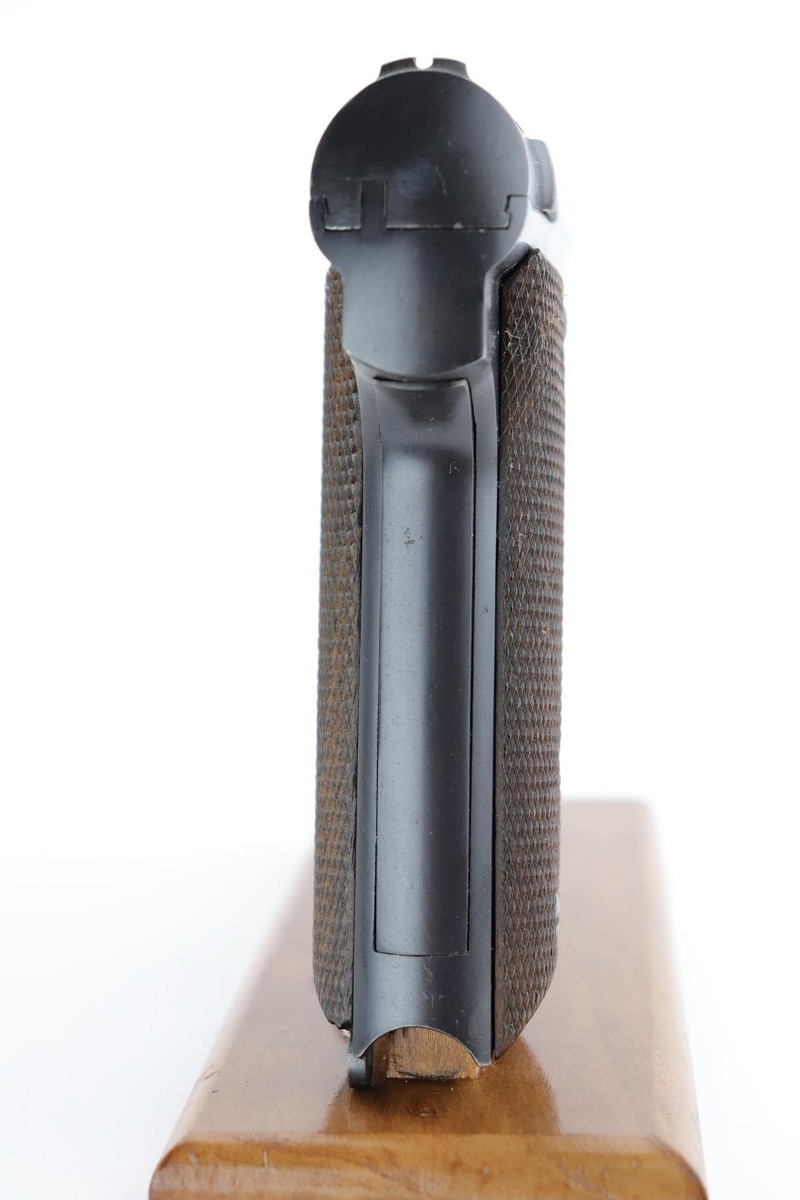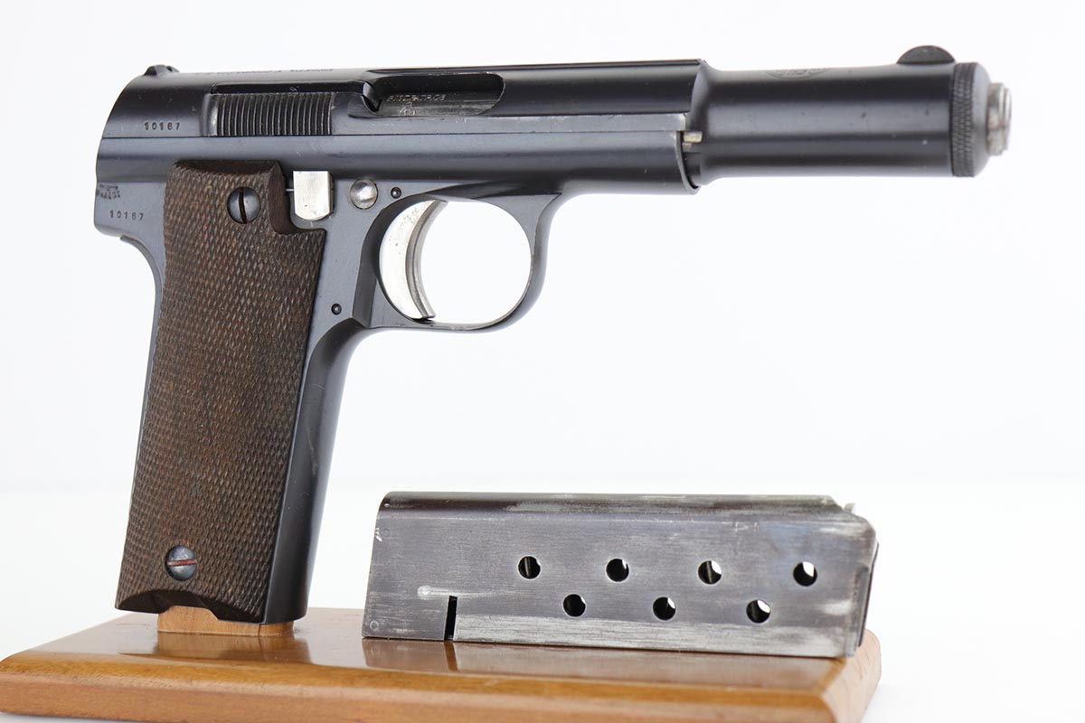 2/13/20 – This is a near-mint Astra 600 that was part of the first Nazi contract order of these pistols. One of only 10,000 such examples, this one is all original with 98-99% blue remaining. There’s a tiny hint of wear on the front strap, and a little more on the left side high edges. Excellent grips and a mint bore.2/13/20 – This is a near-mint Astra 600 that was part of the first Nazi contract order of these pistols. One of only 10,000 such examples, this one is all original with 98-99% blue remaining. There’s a tiny hint of wear on the front strap, and a little more on the left side high edges. Excellent grips and a mint bore. Correct magazine. Correct magazine.