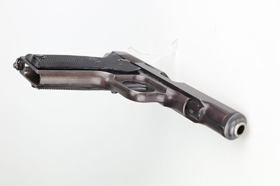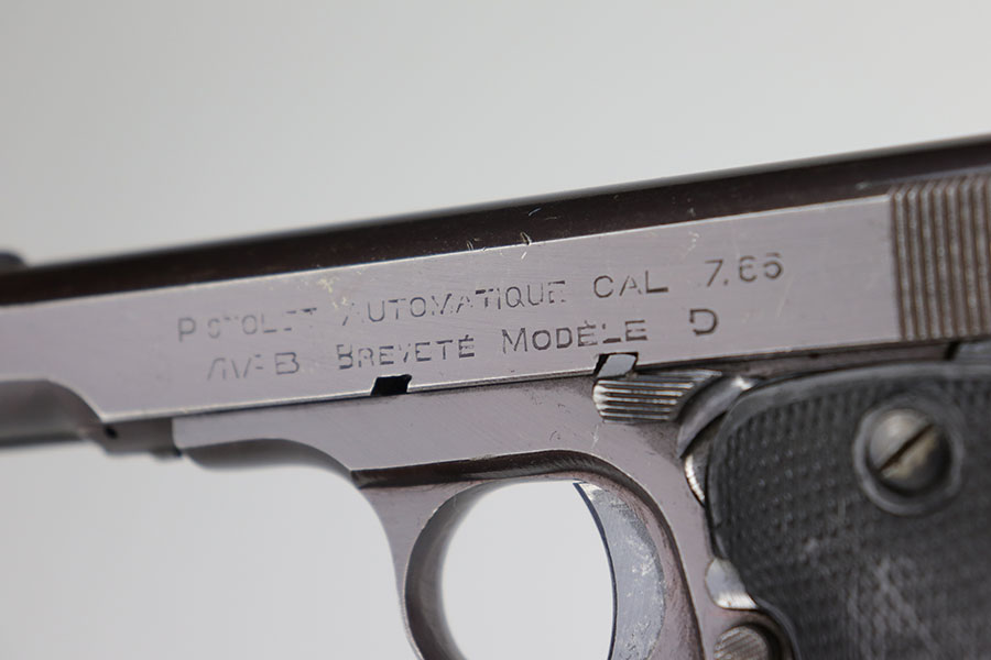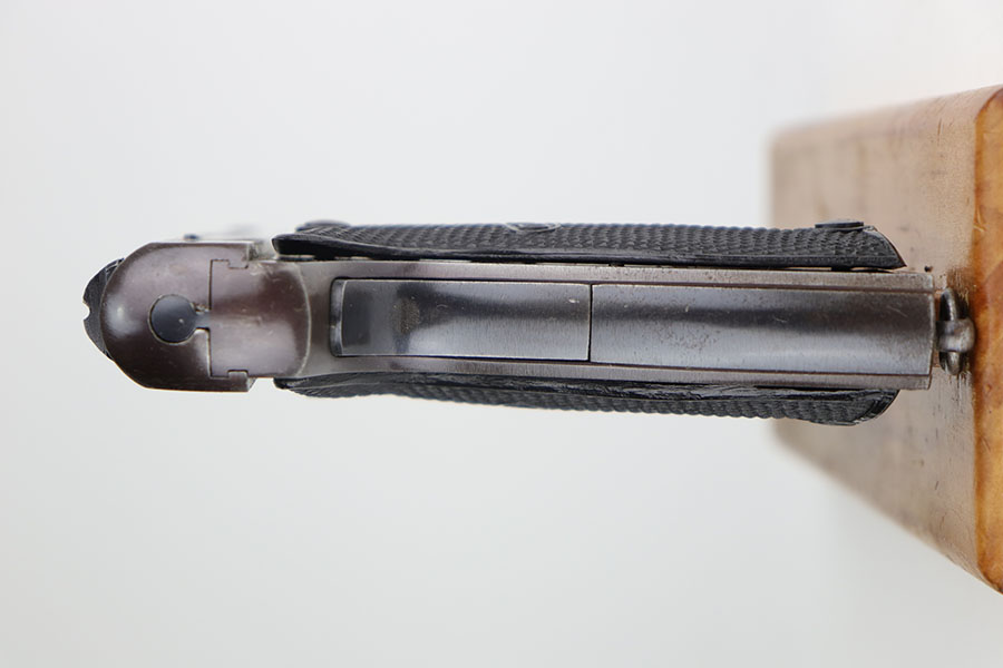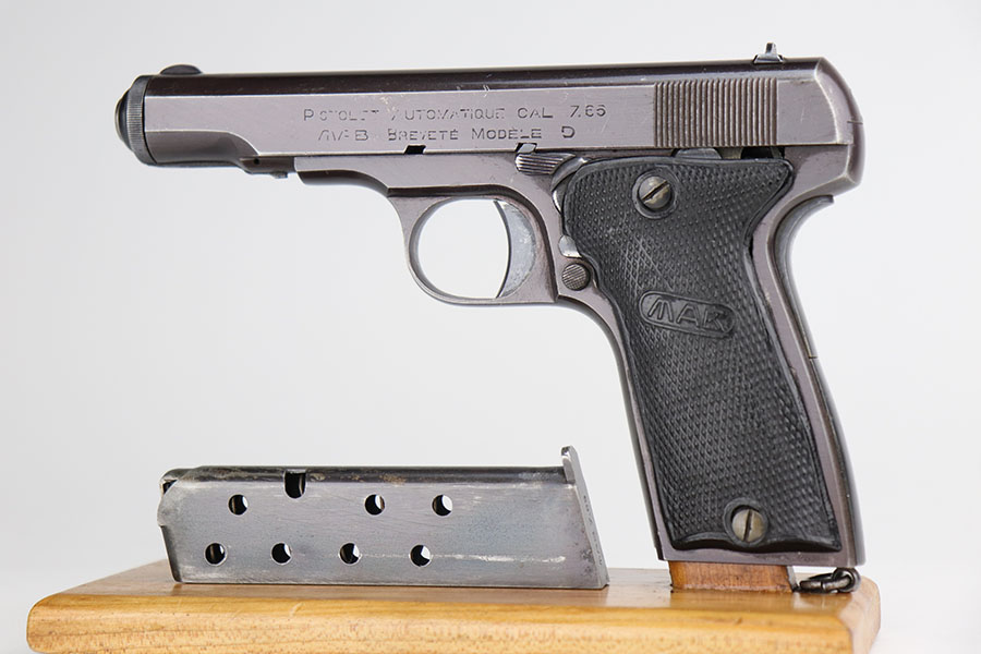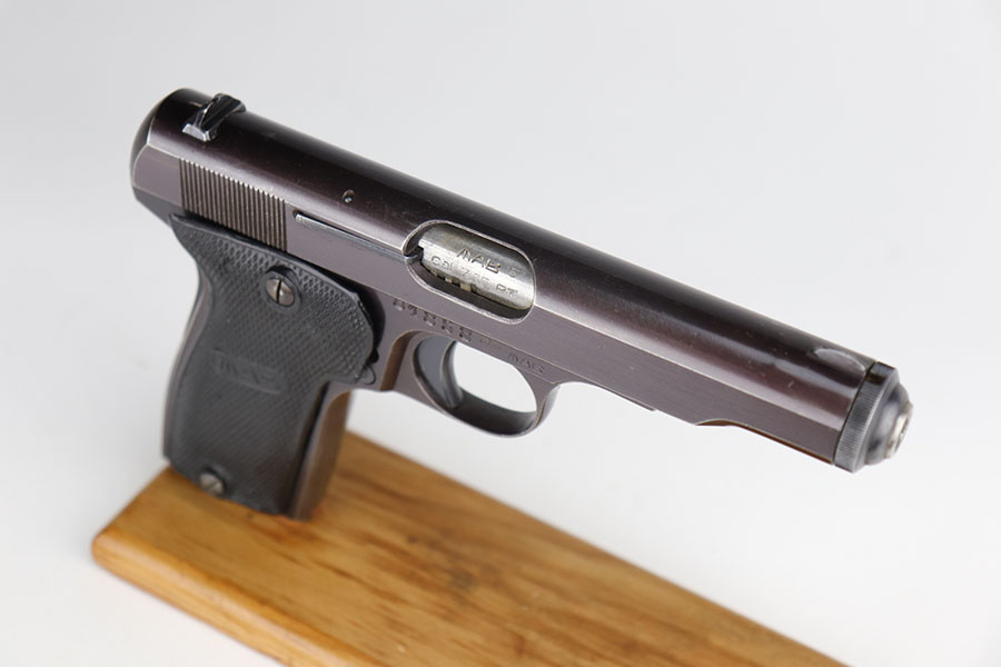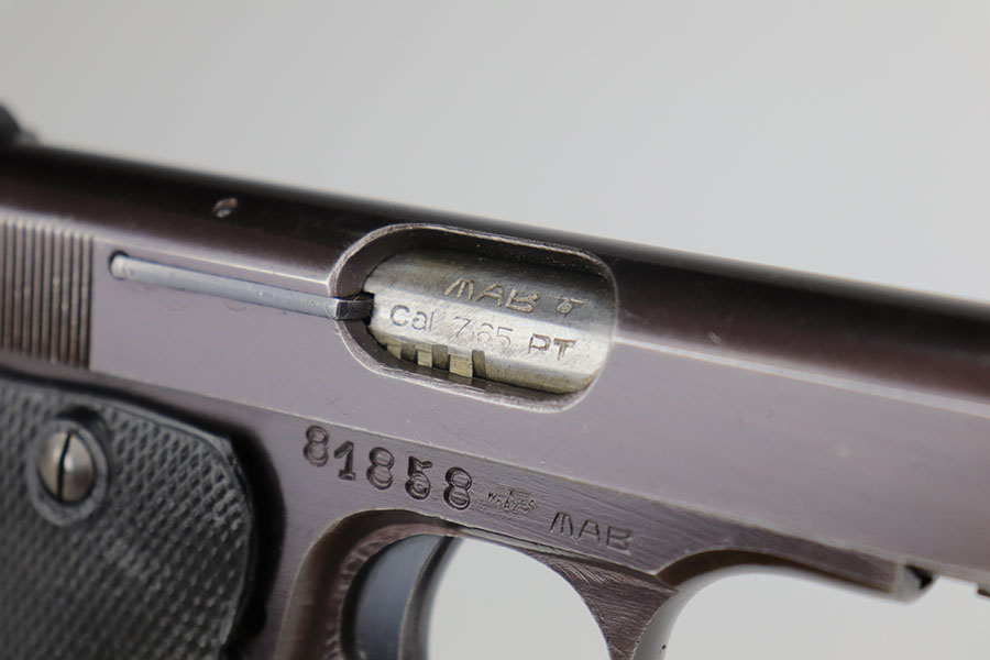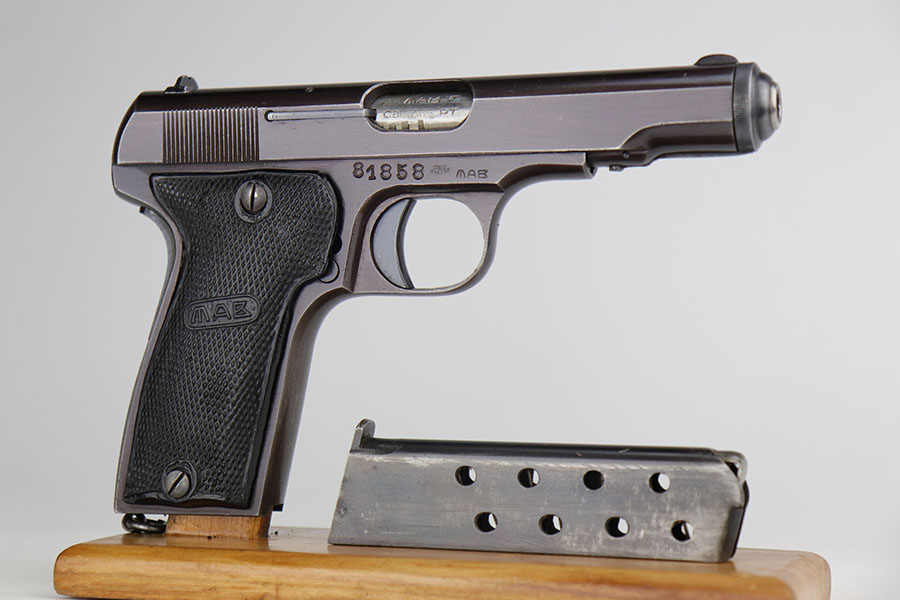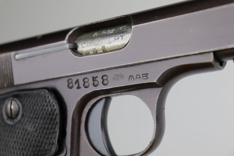 12/16/20 – This is a minty example of a hard-to-find French MAB Model D that was manufactured for the German Army following their occupation of France in 1940. It has proper WaA251 proofs on the frame and Nazi eagle on the barrel. It also comes with correct grips and magazine. The bluing rates at about 98% with a few minuscule spots of wear in various areas. Nice, original grips with no cracks. Minty bore.