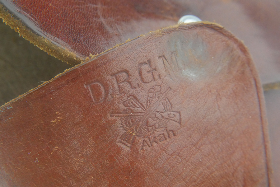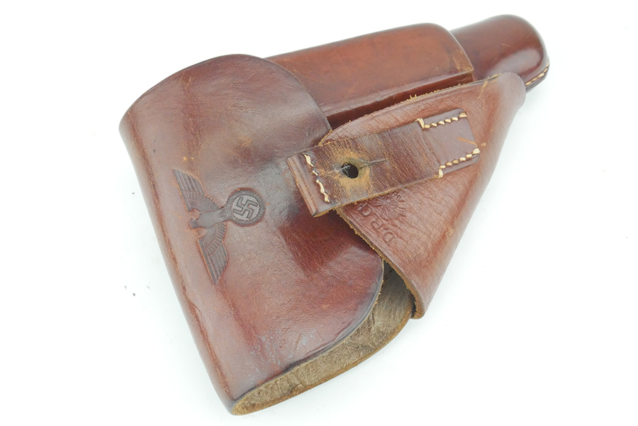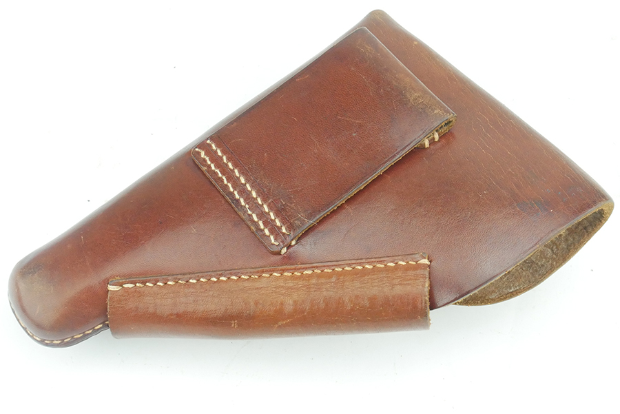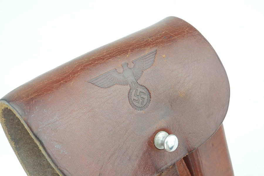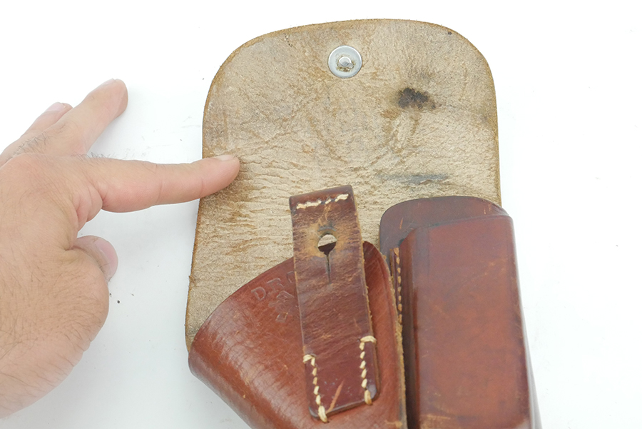 8/9/24 – This is an original and very scarce Walther PPK Party Leader holster in minty condition. The holster features a deeply struck, crisp party leader eagle on the front leather, and an AKAH maker mark under the closure strap. The light brown leather has some very minor surface wrinkling, but no major wear. Interior leather is also in excellent overall condition, but there is a bit of mild wrinkling. Stitching appears flawless. There is a small area of magazine wear in the form of two dark marks which bookend a single line of slightly distressed leather above the magazine holder, and the leather around the closure strap is very slightly worn around the hole where the snap inserts. The snap has also created a slightly distressed point directly to the right of the AKAH marking beneath the closure strap.