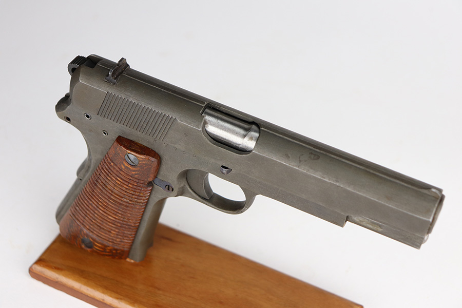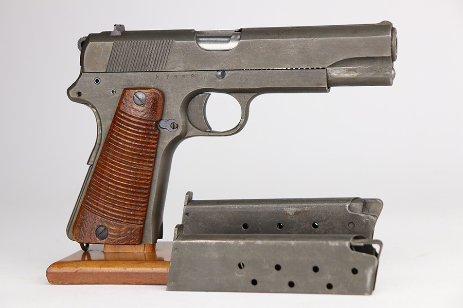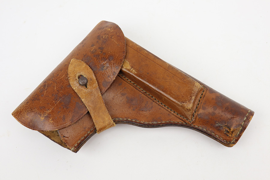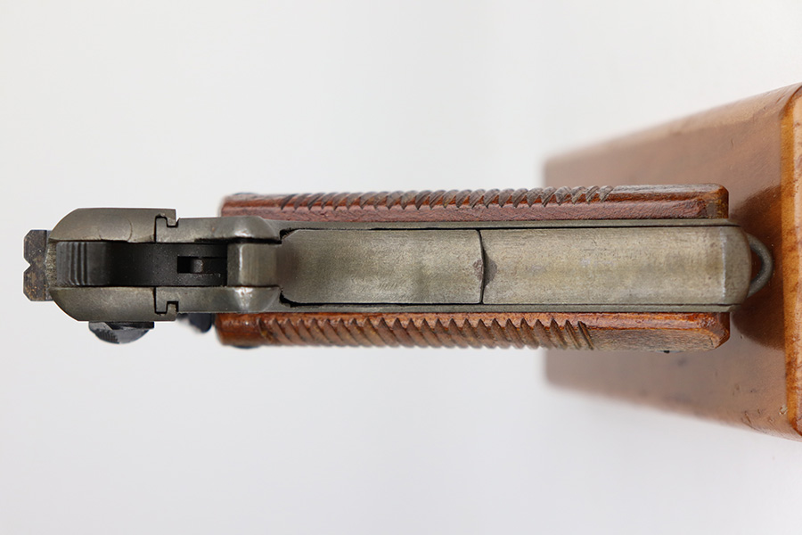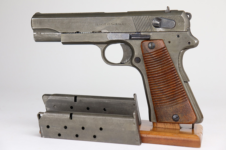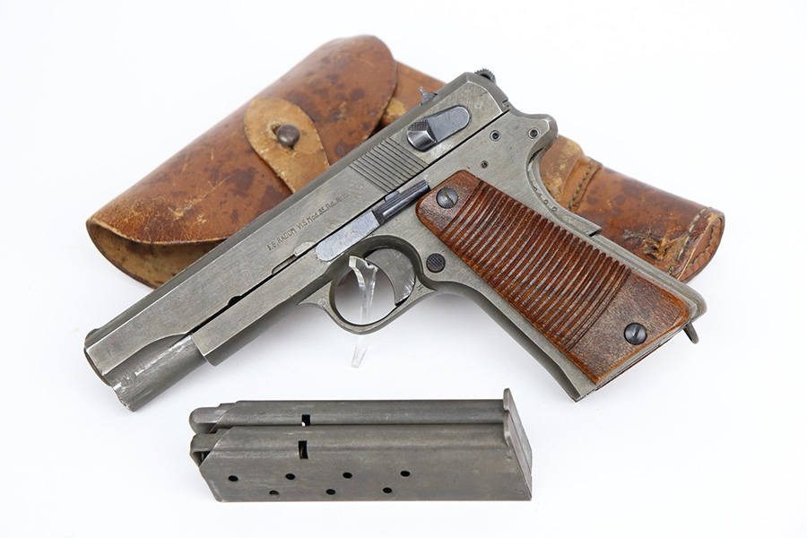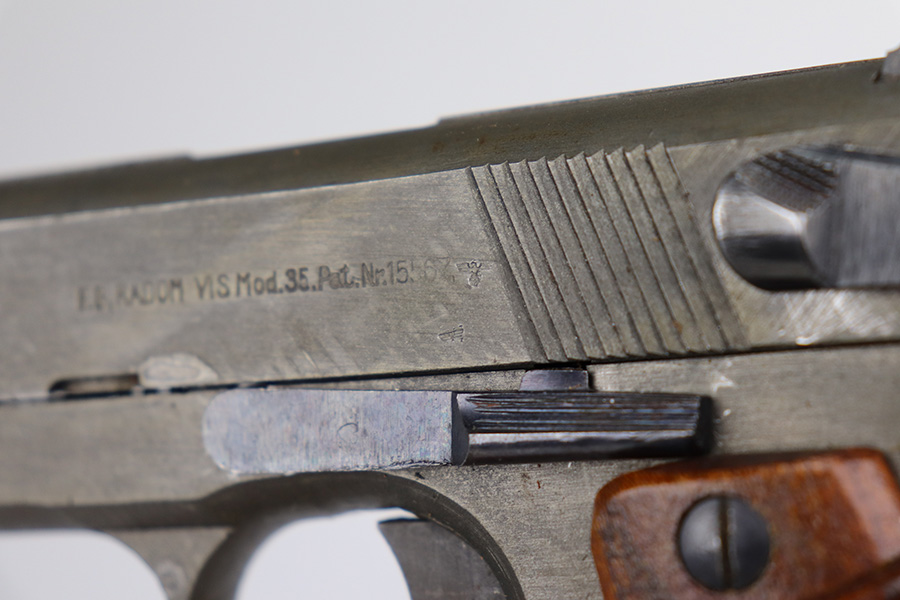 4/29/21 – This is a minty example of a scarce all-phosphate Radom VIS 35 rig issued to the Nazi military during WW2. The gun is all matching and has the proper waffen military proofs. The rig comes with a nice 1944-dated Steyr holster and two phosphate magazines. Because of the phosphate finish, the gun is a little difficult to rate, but we estimate it has retained about 98% of its original finish. There is just a hint of wear on some of the high edges. Comes with excellent grips. Minty bore – shiny with strong rifling.