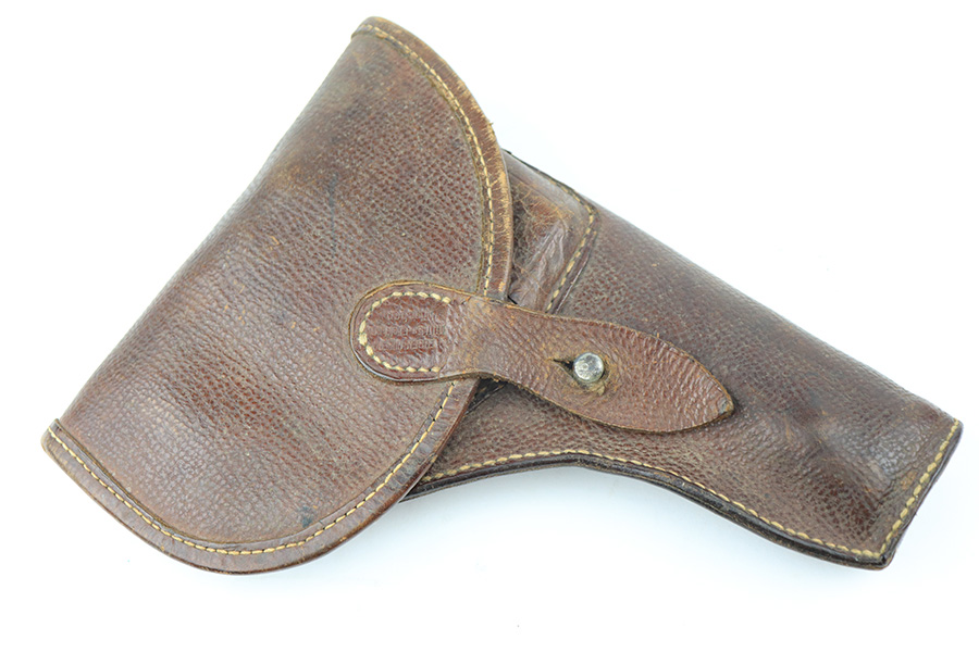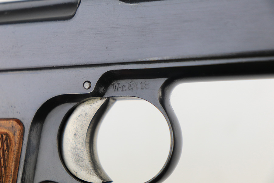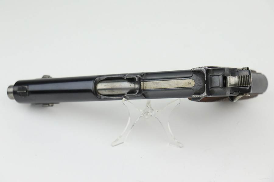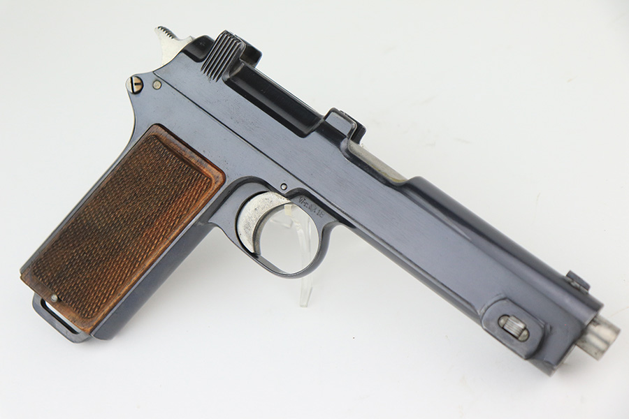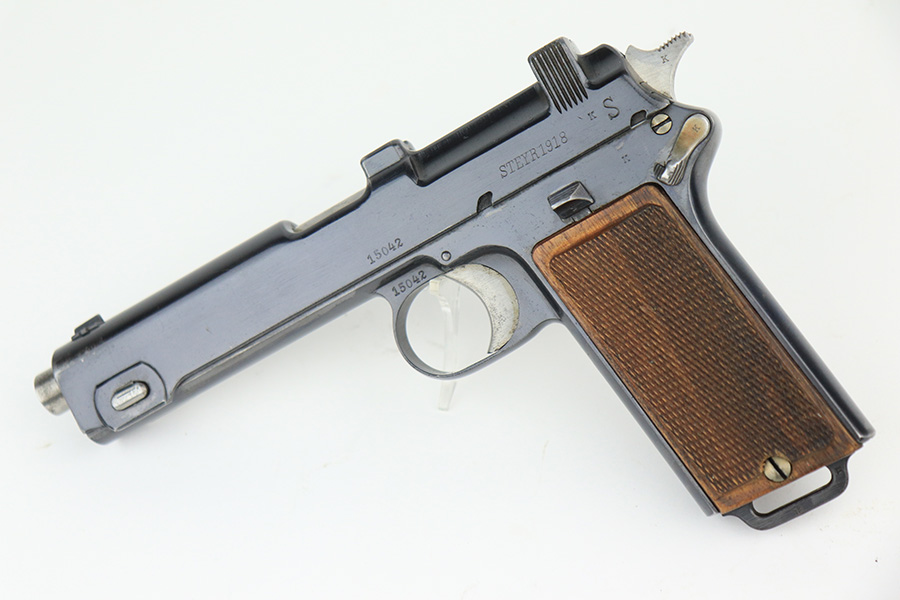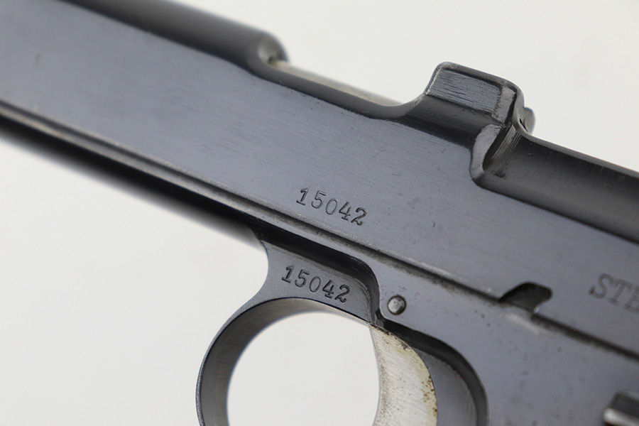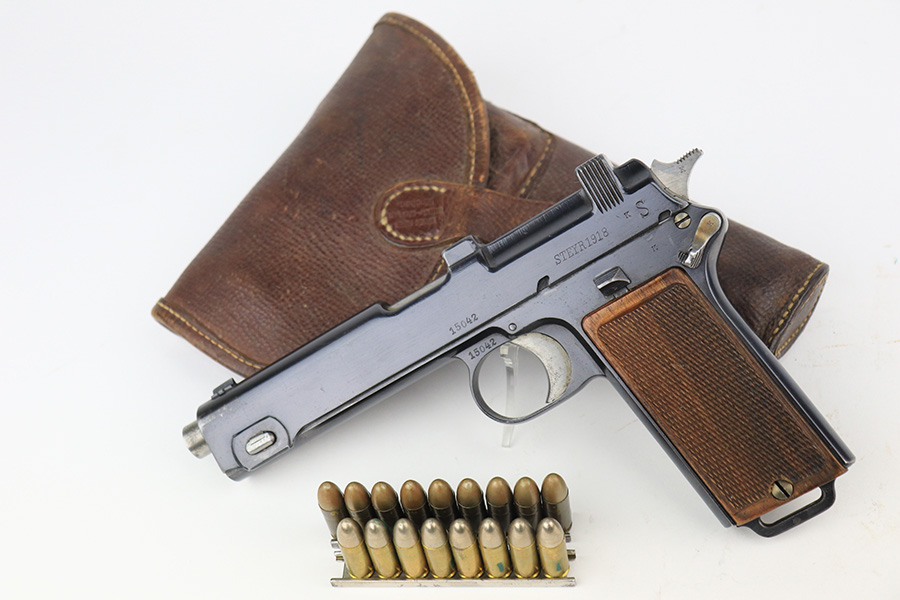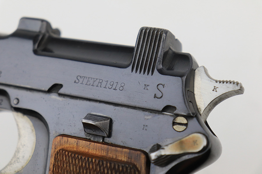 12/3/21 – This is a scarce Steyr Model 1912 pistol rig that was manufactured in 1918 as part of the Bavarian contract order. These pistols are identified by serial range and the lack of a letter block. This particular gun has about 97-98% of the original blue with just a bit of bluing loss from the holster on the front edges of the slide. It’s the nicest example that we’ve encountered, and has a terrific bore and minty grips. Slide and frame are both 1918 dated, and right side of frame has military inspectors mark. Comes with an original holster that is maker marked on the closure strap. It also includes two stripper clips with period German 9mm Steyr ammo.