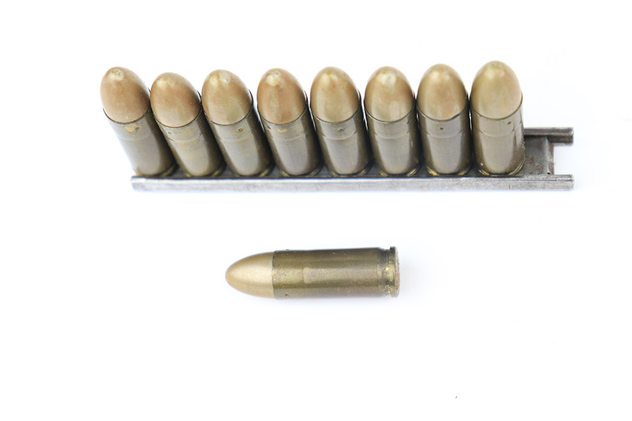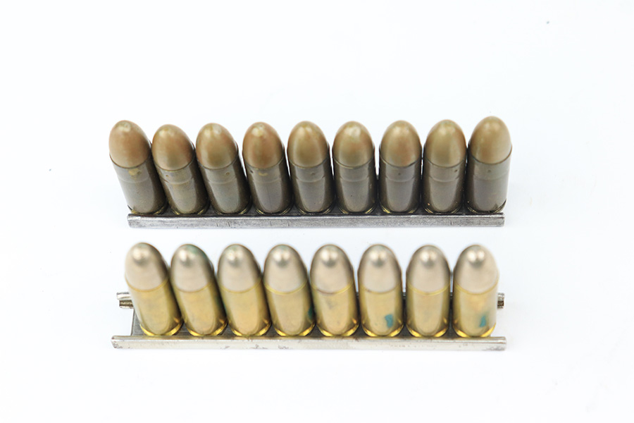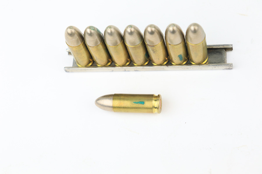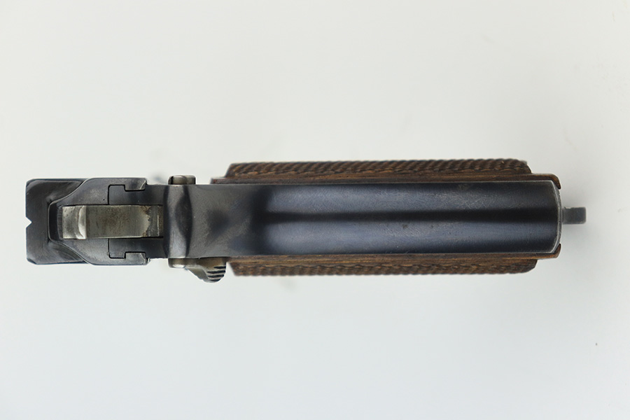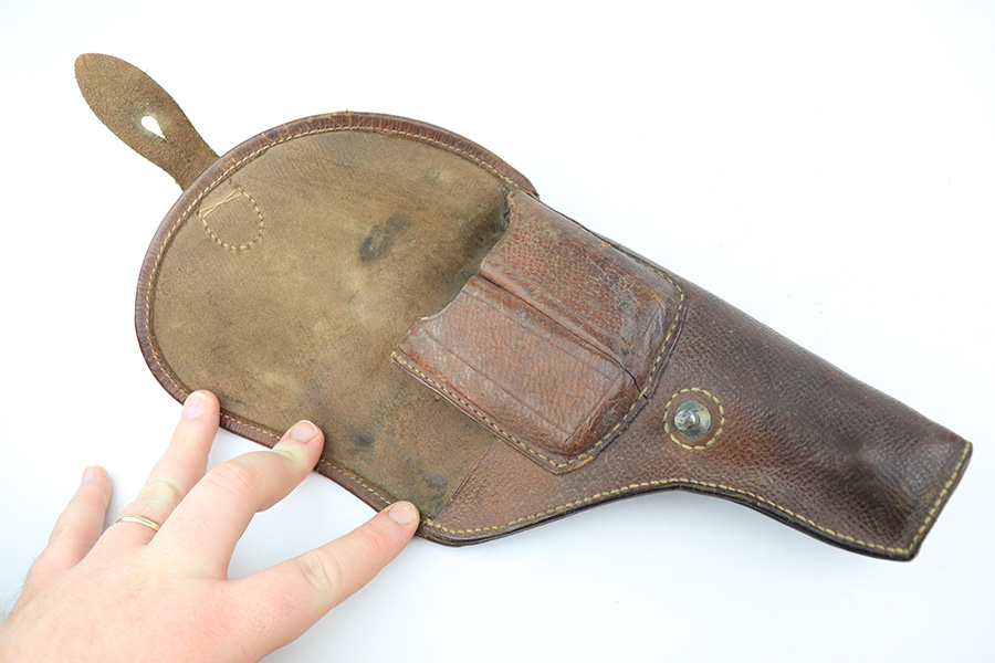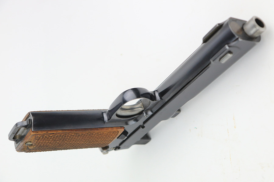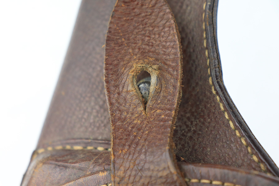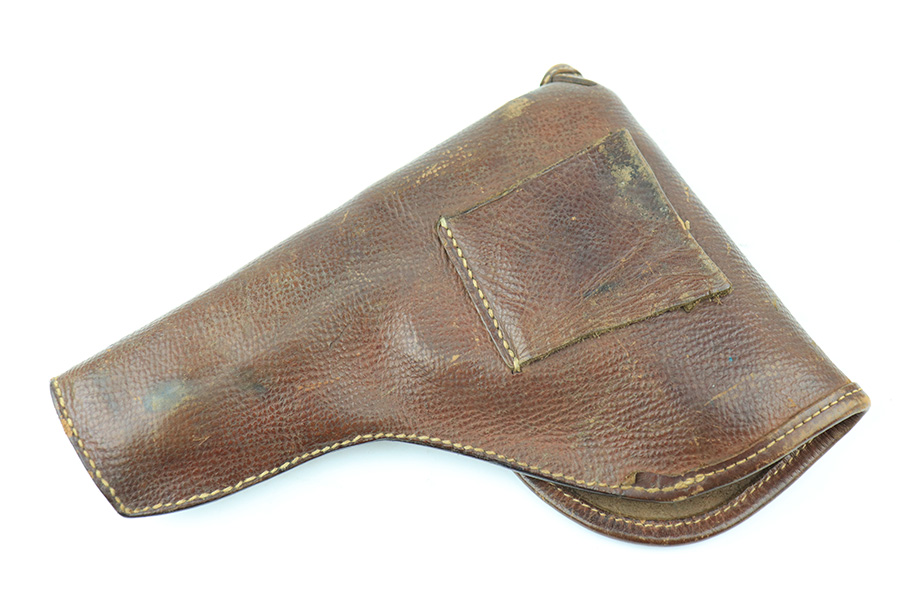 12/3/21 – This is a scarce Steyr Model 1912 pistol rig that was manufactured in 1918 as part of the Bavarian contract order. These pistols are identified by serial range and the lack of a letter block. This particular gun has about 97-98% of the original blue with just a bit of bluing loss from the holster on the front edges of the slide. It’s the nicest example that we’ve encountered, and has a terrific bore and minty grips. Slide and frame are both 1918 dated, and right side of frame has military inspectors mark. Comes with an original holster that is maker marked on the closure strap. It also includes two stripper clips with period German 9mm Steyr ammo.