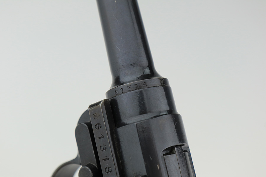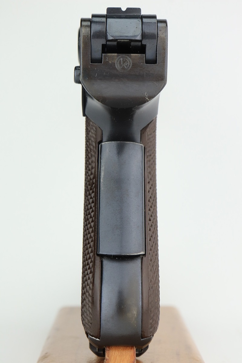 1/23/23 – This is a minty example of a Swiss Bern M1929 Luger rig, manufactured in the 1940’s. It is all matching and has the proper Swiss proofs. No “P” proof. It has retained about 98% of its finish with some very minor wear on the high edges in general and at the base of the straps. A few very light scratches along the barrel. Comes with excellent Swiss bakelite grips and a correct Swiss magazine. The bore looks brand new.