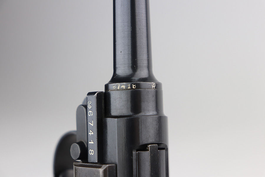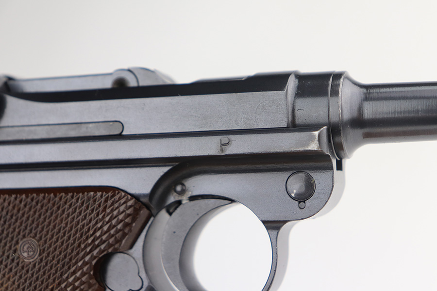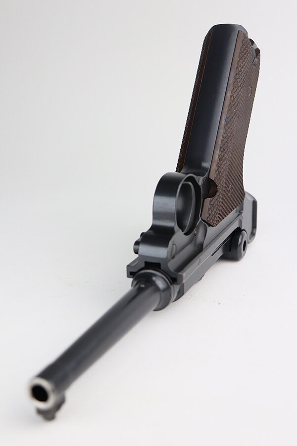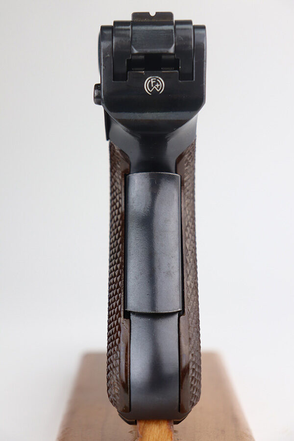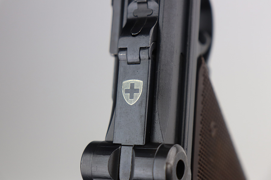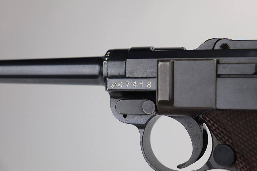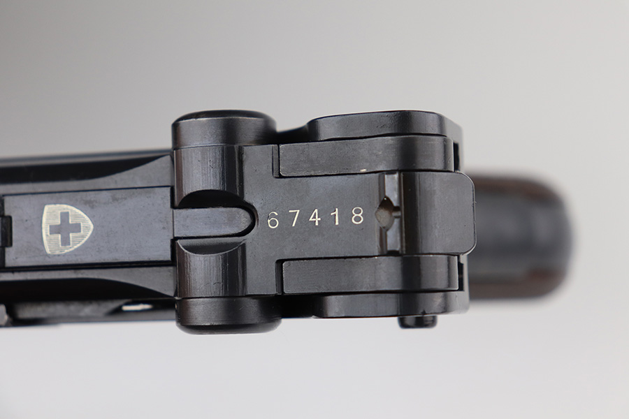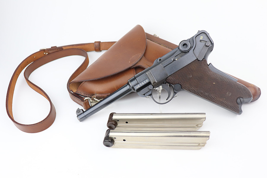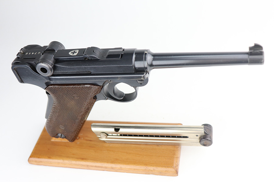 6/17/21 – This is a minty example of a Swiss Bern M1929 Luger rig, manufactured in the 1940’s. It is all matching, has the proper Swiss proofs, and has a “P” proof on the right side rail. The gun comes with a nice 1945-dated leather shoulder holster – it could be period-correct, but we can’t say for sure. It has retained about 98% of its finish with hints of wear on the side plate, side rails, and around the muzzle. Very small dots of oxidation on the back strap. Comes with excellent Swiss bakelite grips and two correct Swiss magazines. The bore looks brand new.