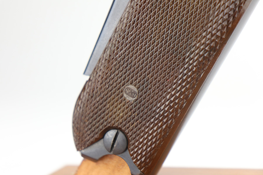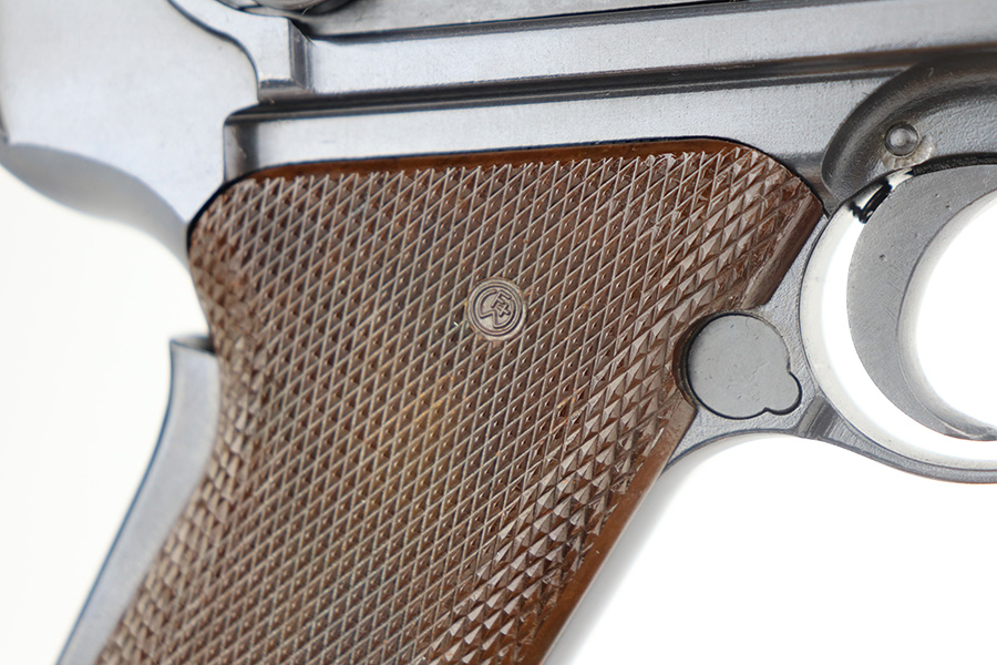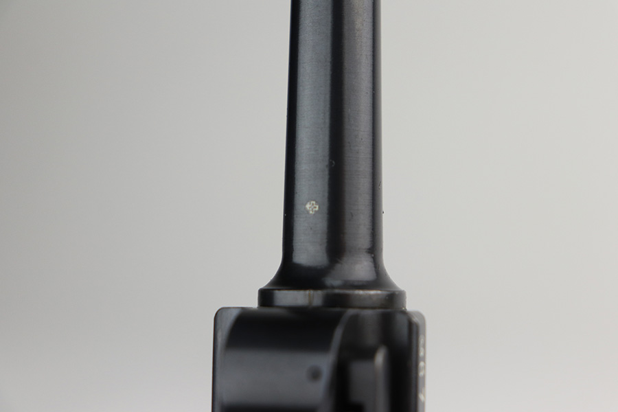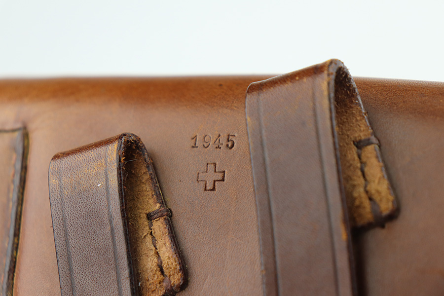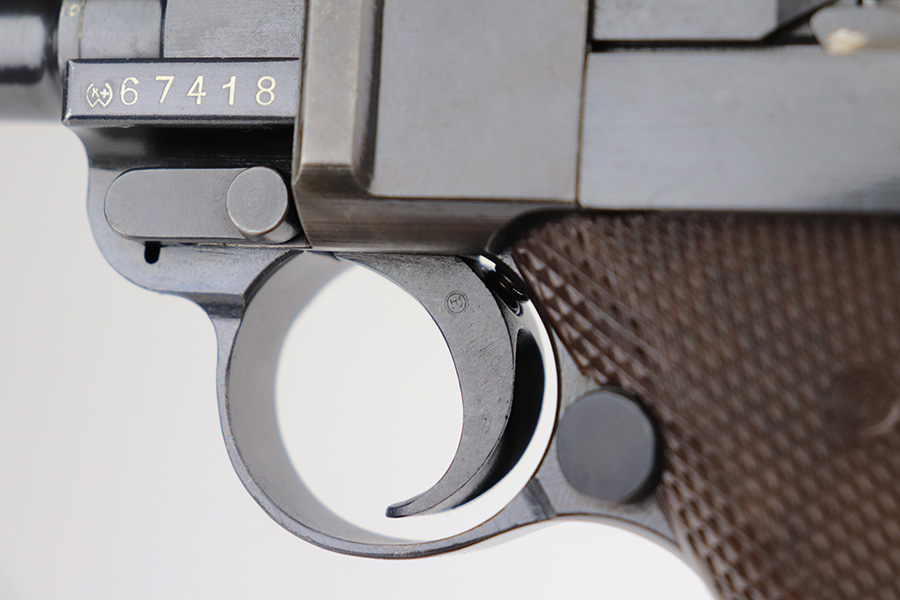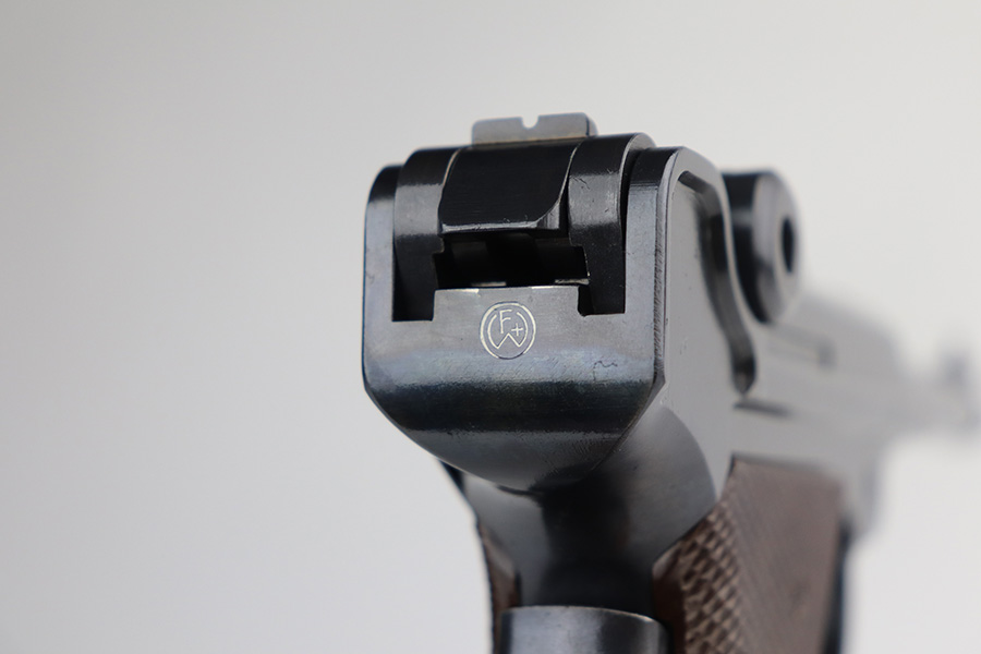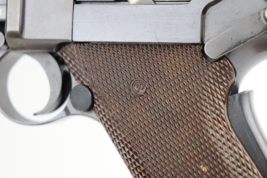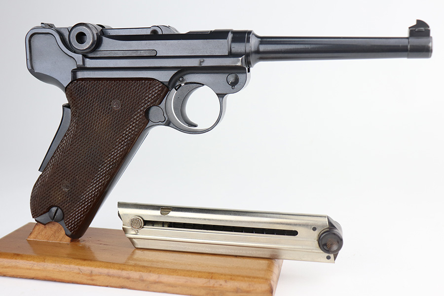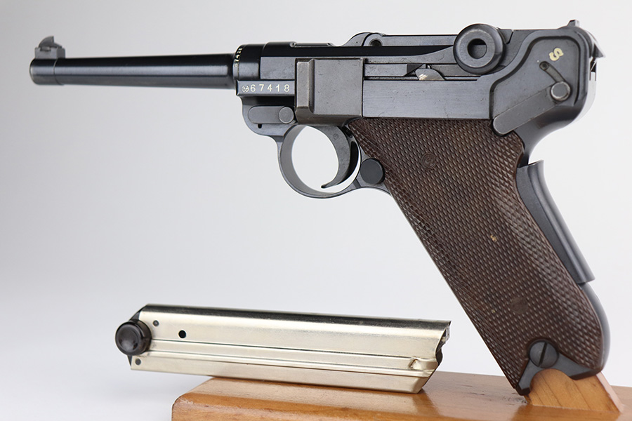 6/17/21 – This is a minty example of a Swiss Bern M1929 Luger rig, manufactured in the 1940’s. It is all matching, has the proper Swiss proofs, and has a “P” proof on the right side rail. The gun comes with a nice 1945-dated leather shoulder holster – it could be period-correct, but we can’t say for sure. It has retained about 98% of its finish with hints of wear on the side plate, side rails, and around the muzzle. Very small dots of oxidation on the back strap. Comes with excellent Swiss bakelite grips and two correct Swiss magazines. The bore looks brand new.