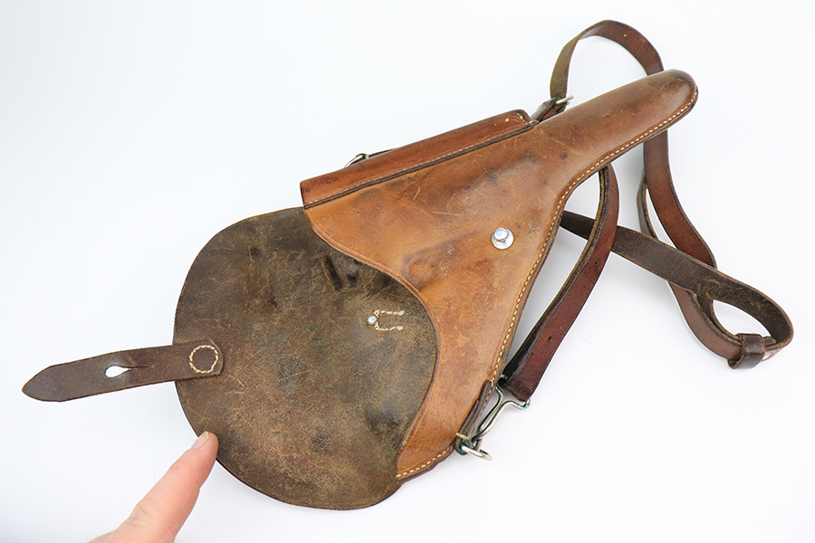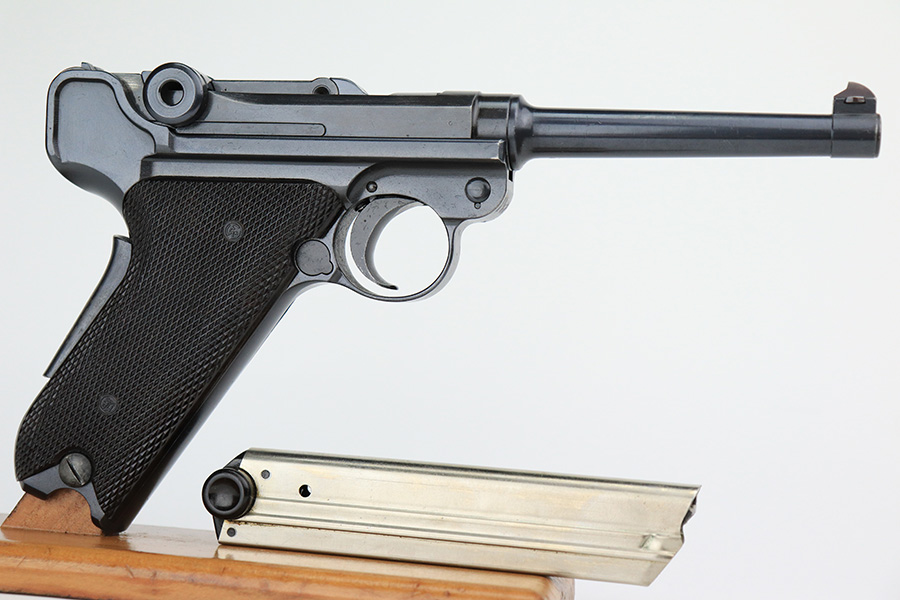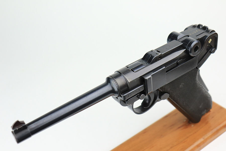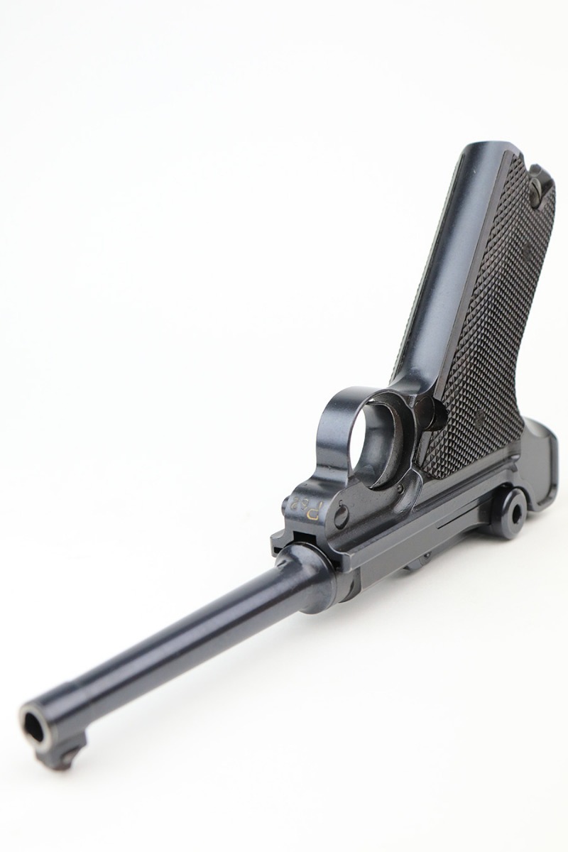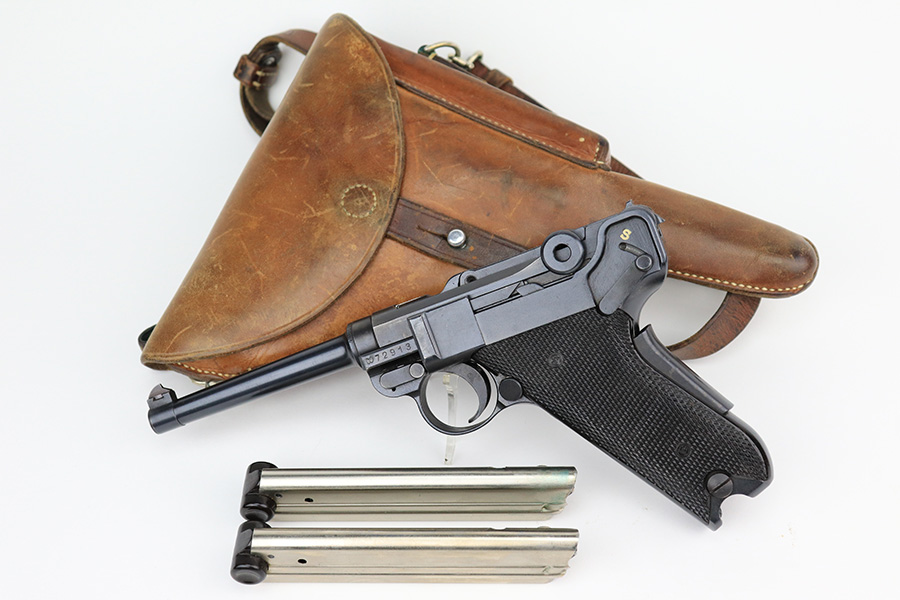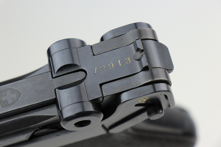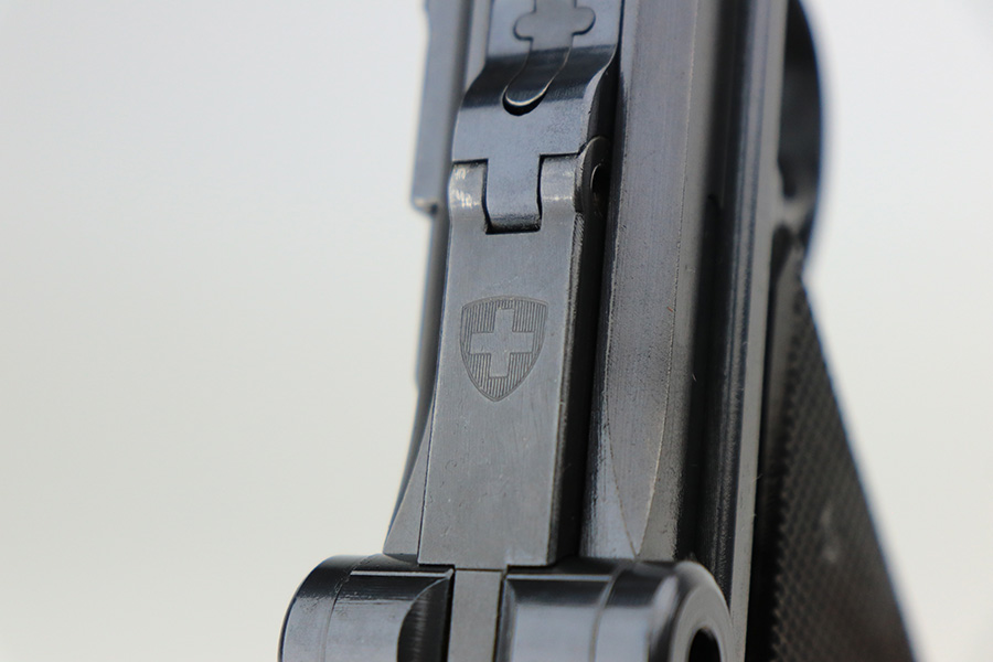 4/22/22 – This is a minty example of a scarce Swiss Bern M1929 Luger rig, manufactured in the 1940’s. It is all matching and has the proper Swiss proofs. “P” marking on the underside of the frame. It comes as a rig with an excellent Swiss leather shoulder holster, shoulder straps, and two proper Swiss magazines. The gun has retained more than 98% of its finish with hints of wear on some of the high edges and a few tiny spots of discoloration on the grip safety. Comes with excellent Swiss bakelite grips. Mint bore.