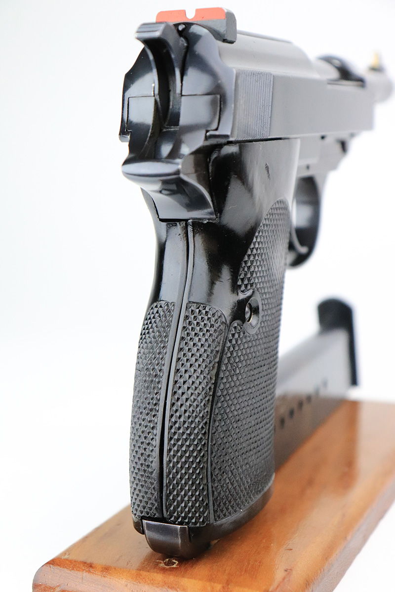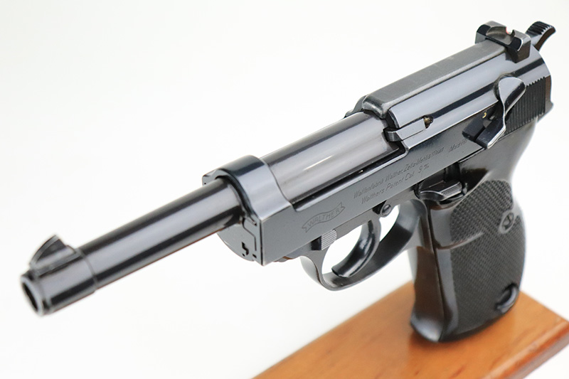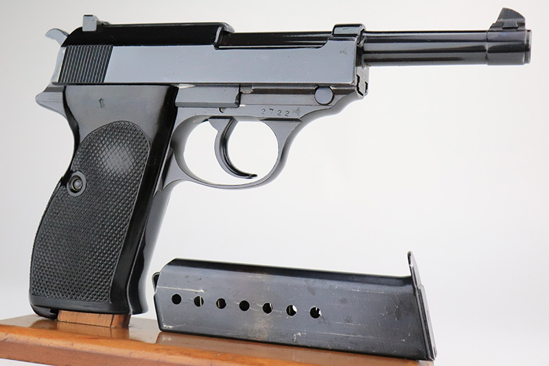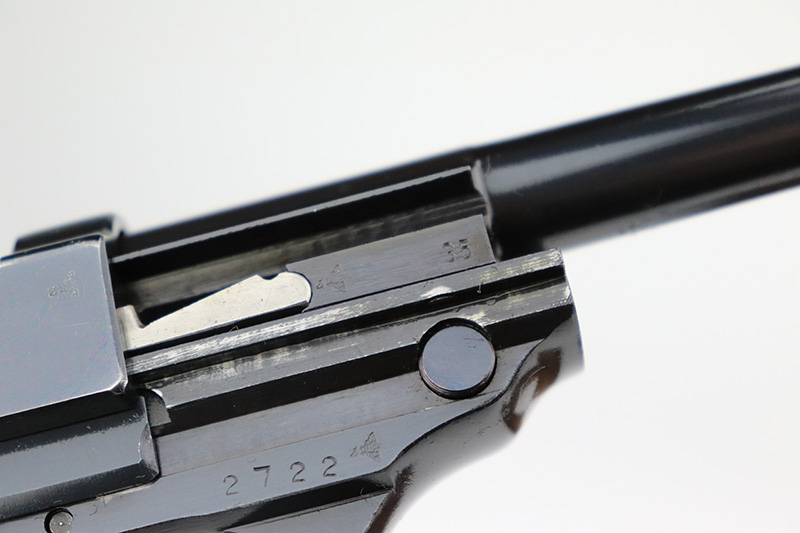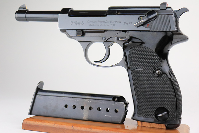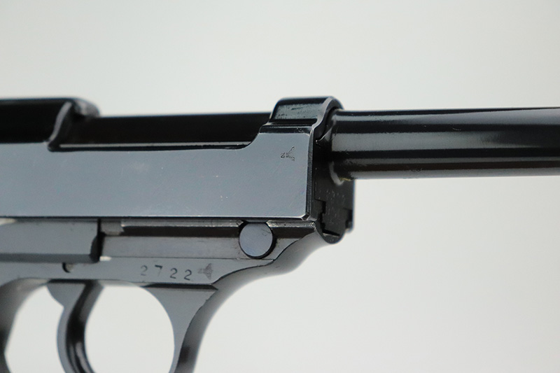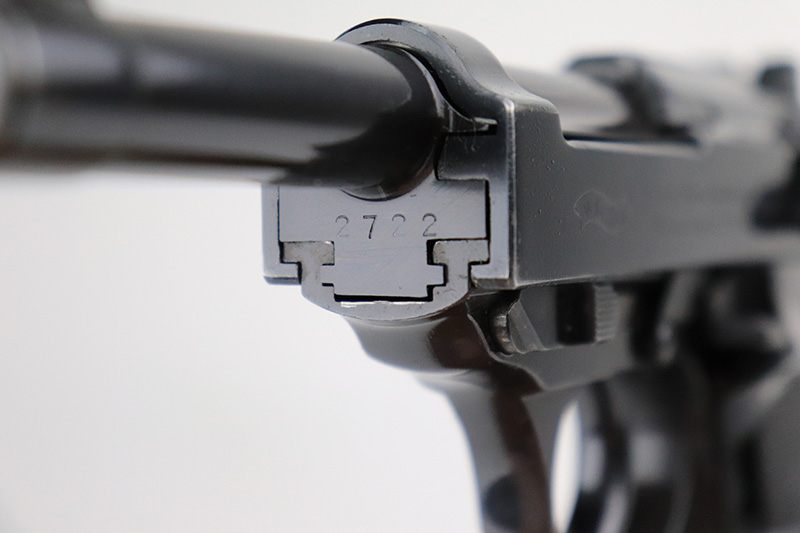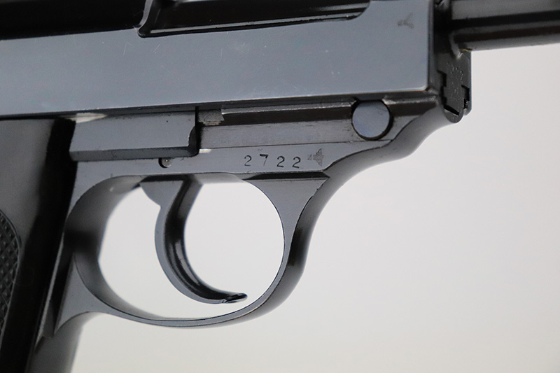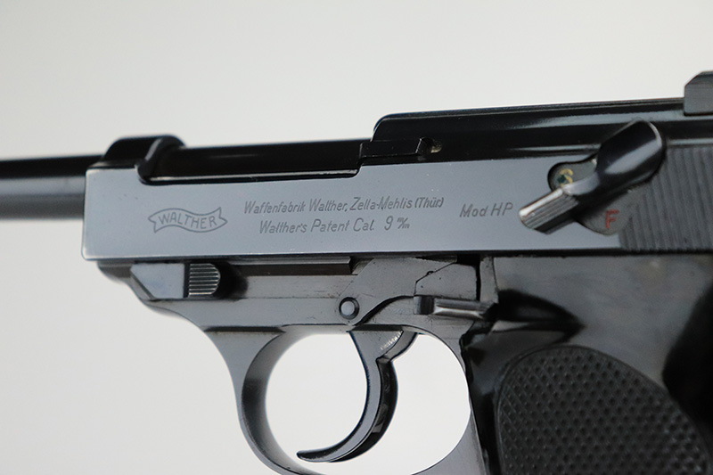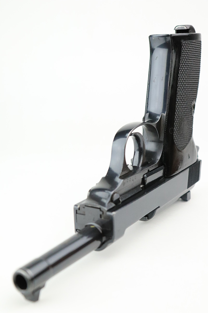 9/7/22 – This is a gorgeous example of a scarce and early Walther Mod HP. All matching and correct with 98+% of the high-polish blue remaining. Minor edge and muzzle wear, and a tiny bit of pinpricking on the front strap. One of only a few thousand produced, this pistol falls in the range of the 2nd Swedish contract, though the serial is not listed on the manifests. It correctly has unmarked small parts and grips. Rare unmarked commercial magazine. Factory paint on sights is in great shape. The bore has strong rifling but a little frost and freckling throughout. Fully functional, including the de-cocker. No import marks, but this one does have a postwar Eagle/N marking on the underside of the barrel and slide. The frame is marked under the grips with “Prz y” and “9 Pa”, as well as Eagle/N over ‘8-92’. So this one ended up sold commercially in Germany at some point after the war and later came to the states.