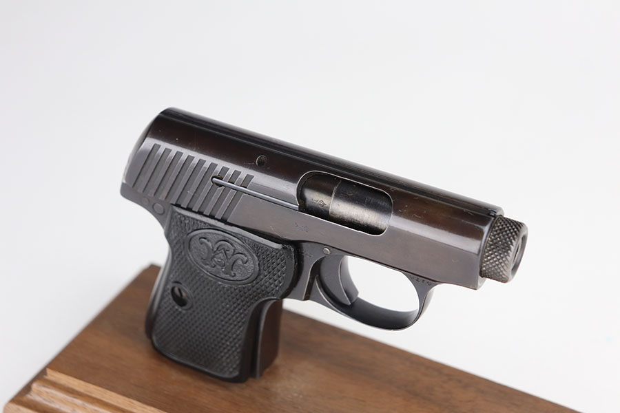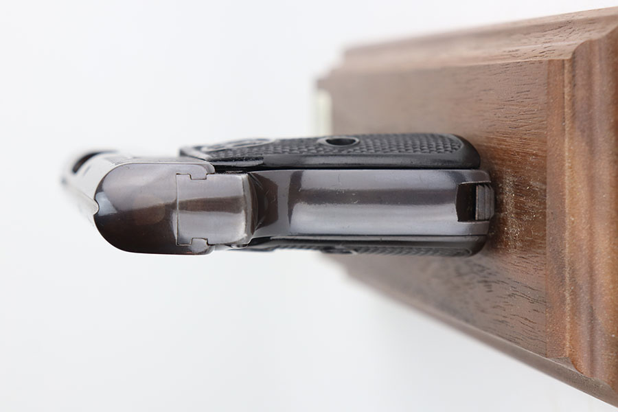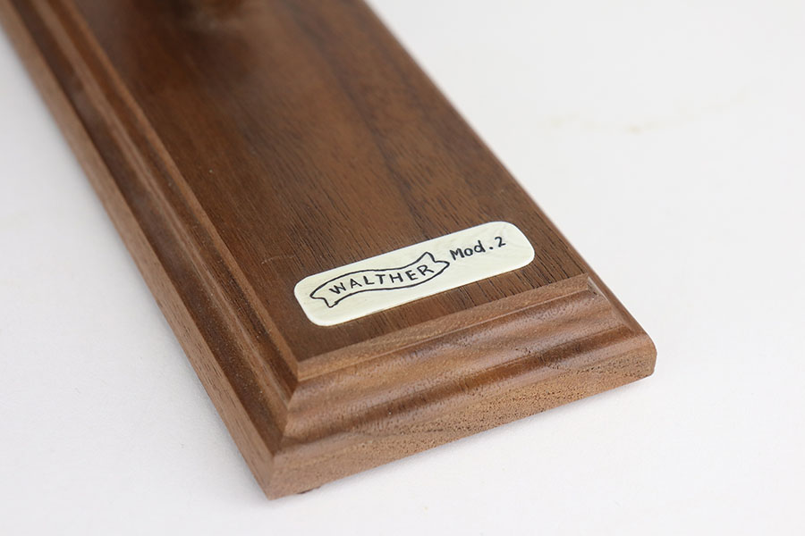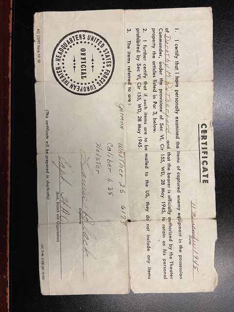 7/26/21 – This is a terrific example of a scarce Walther Model 2 with an interesting history. It comes with a capture document indicating it was brought back by Dorothy Rutherford of the Women’s Army Corps, which we believe is the first such example we’ve offered. WAC units were known to have captured many handguns, whether as a keepsake or for those that were not issued a 1911A1. There were only 19,000 Model 2 pistols produced, and this is one of the nicest you’ll see. It has about 98% of the original blue remaining with just some minor wear/patina on the back of the slide/frame. Strong, shiny bore. Minty grips with minimal handling wear. The listing also includes the custom display stand in the photos.