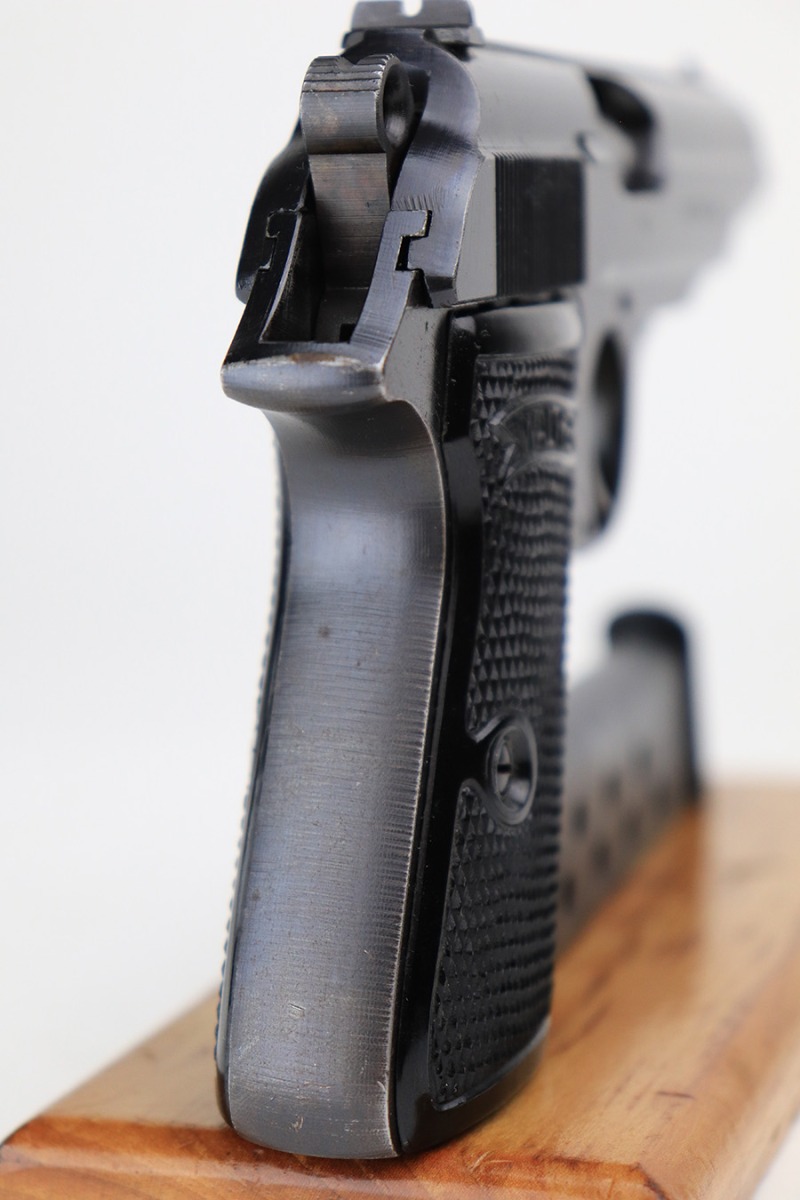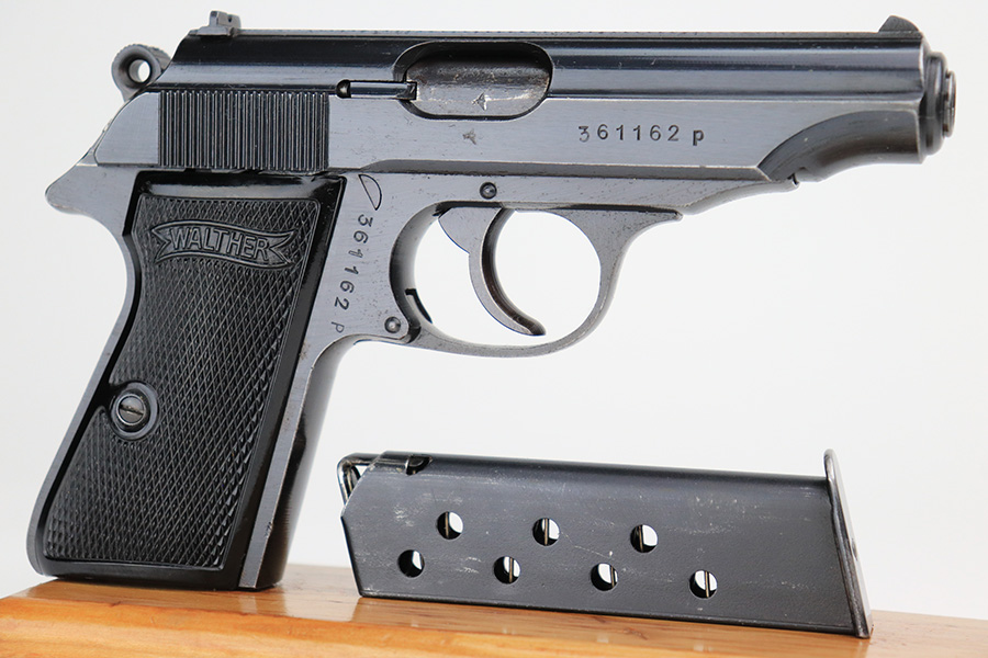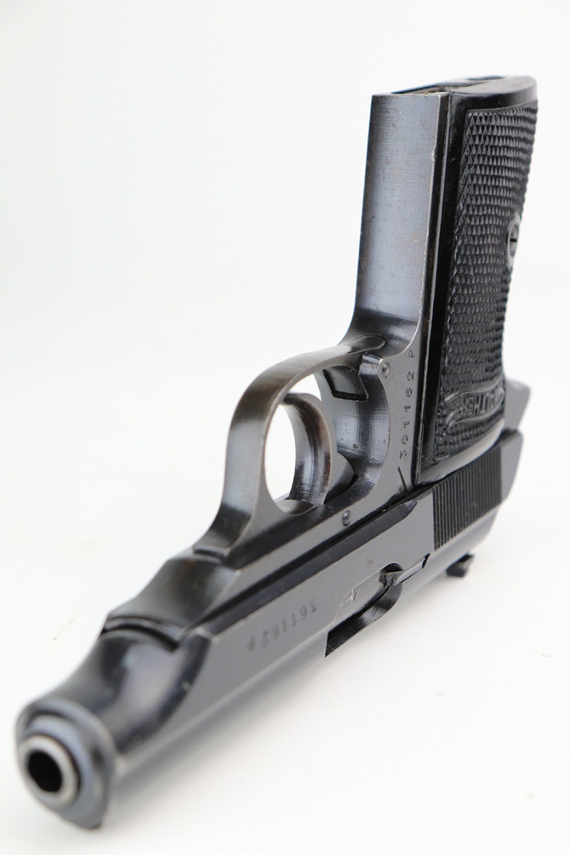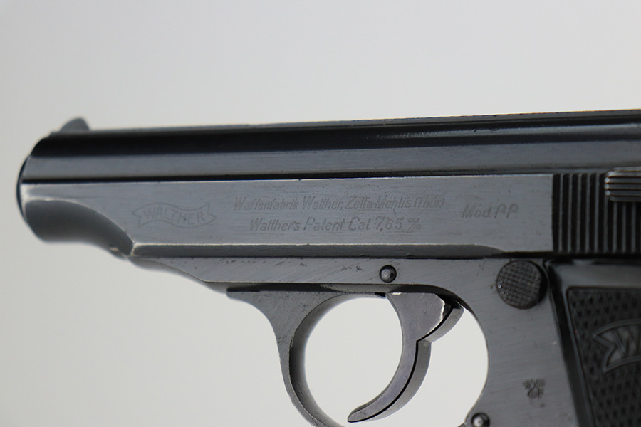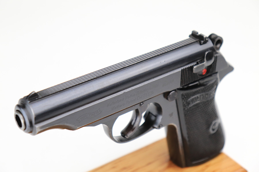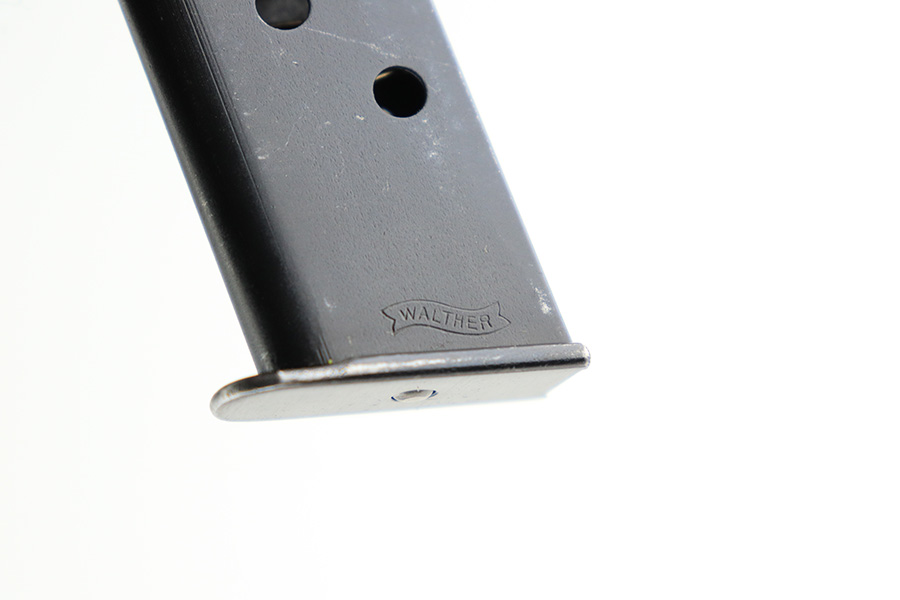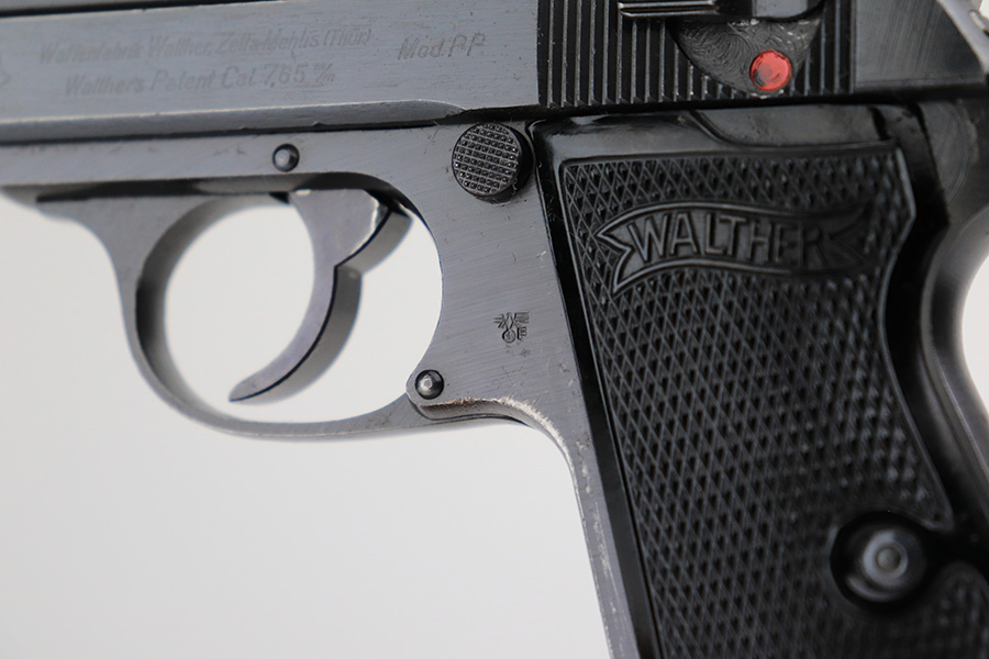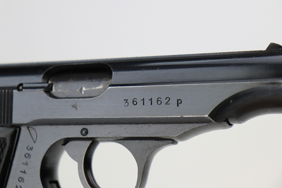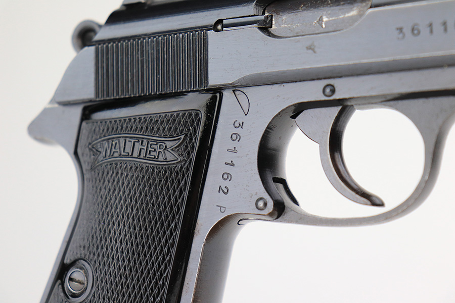 5/2/22 – This is a near-mint example of a scarce late-war Walther PP issued to the Nazi police in 1944. It is all matching and has the proper police “Eagle F” proof. This police “Eagle F” variation is scarce as only about 5,000 were made. It has retained nearly all of its original bluing with a hint of wear around the muzzle and some very light freckling on the grip straps and right side of the frame. Comes with excellent black bakelite grips and a Walther banner-only magazine. Mint bore.