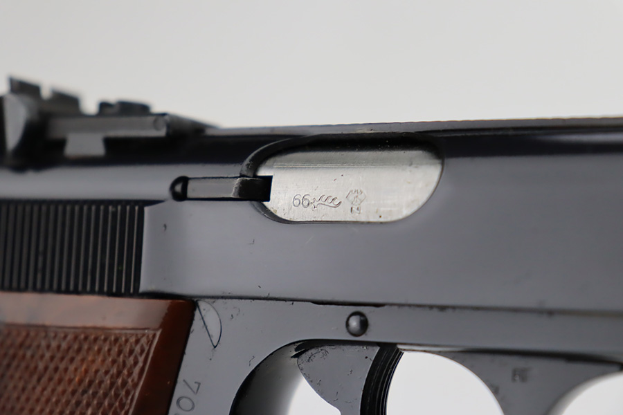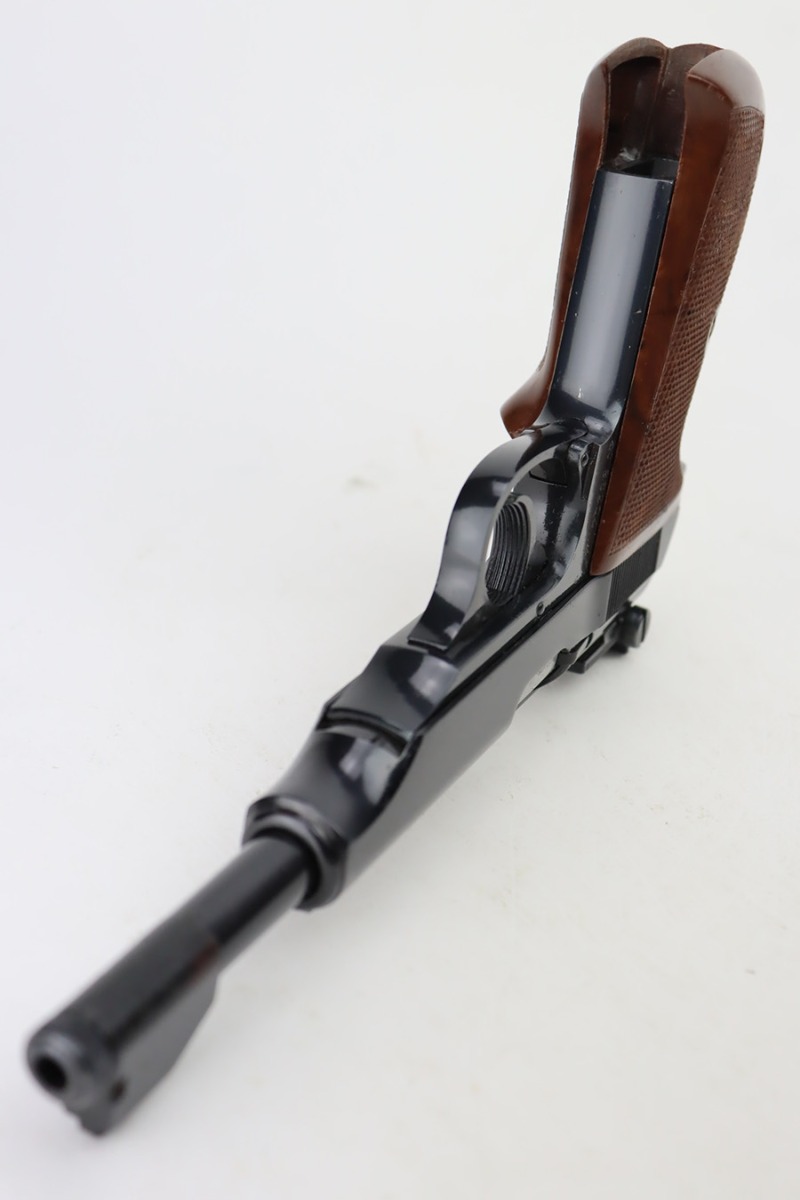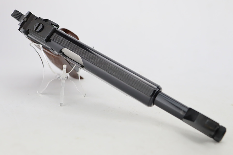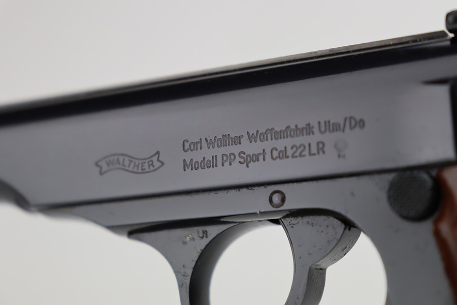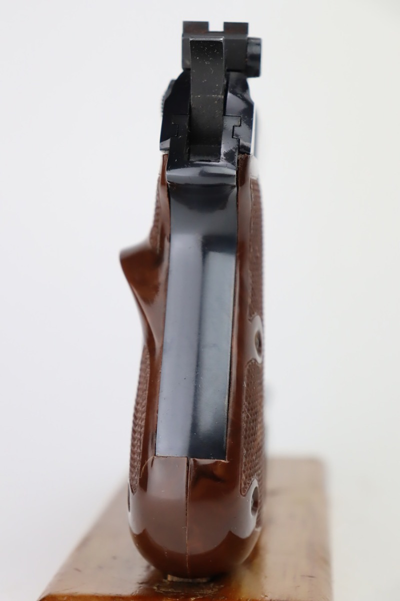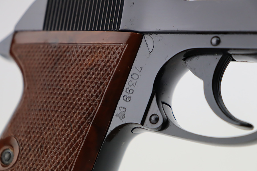 9/28/23 – This is a beautiful example of an original Walther Model PP Sport-C in the original, matching box. This variation is in single action only. It has 99% of the original blue remaining with just a few minuscule dots of wear on the front strap and a mint bore. Excellent grips with no notable defects. A total of two finger extension mags are included. The pistol is dated to 1966. Small import mark on trigger guard.