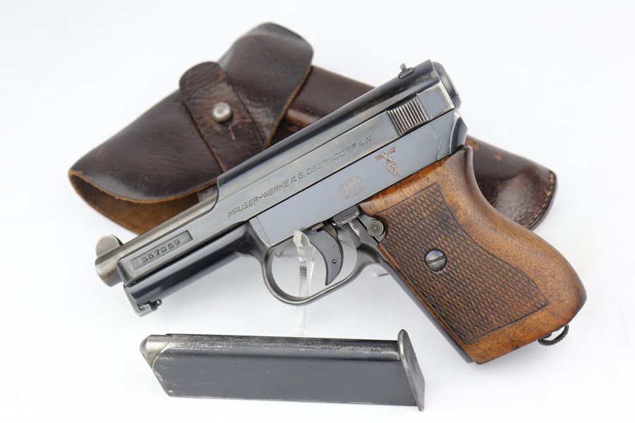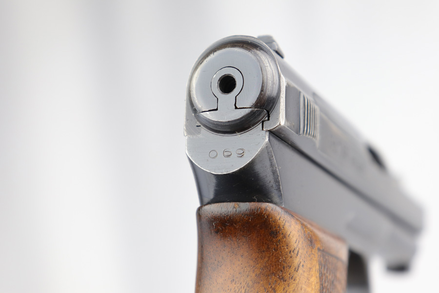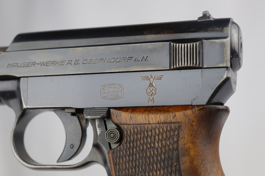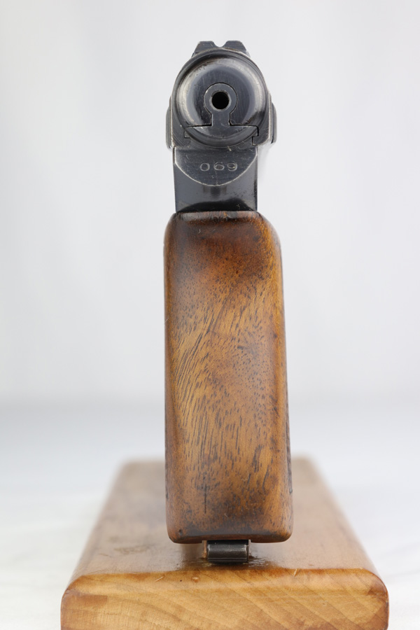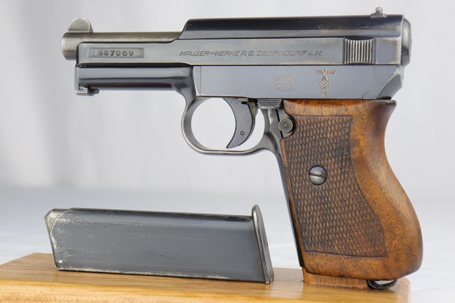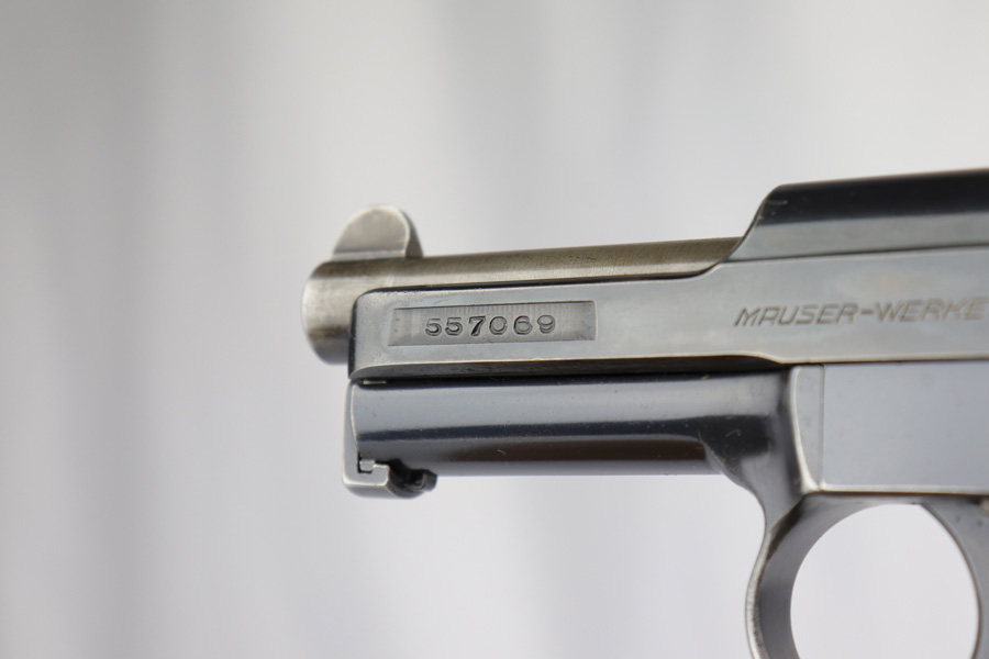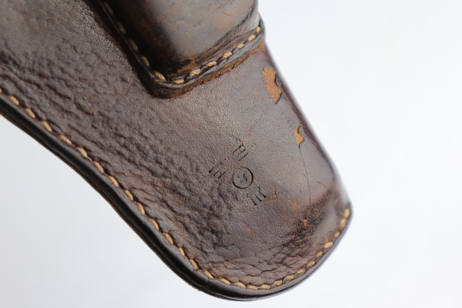 2/26/19 – This is a scarce, original 1934 Mauser rig that was Navy marked and issued. It is a variation 1 pistol, one of 8,000 produced, with N-property mark on front strap and Kriegsmarine Eagle on left side of the frame. This pistol retains 85-90% high-polish blue, with evenly distributed holster wear and patina. Excellent grip and nice, shiny bore with only minor frost. Crown/U proof on slide. This pistol comes with a rare and interesting Navy holster, which shows the Kriegsmarine Eagle as well as clear Akah proof. The holster is in very good condition with just minor flaking on the front.
