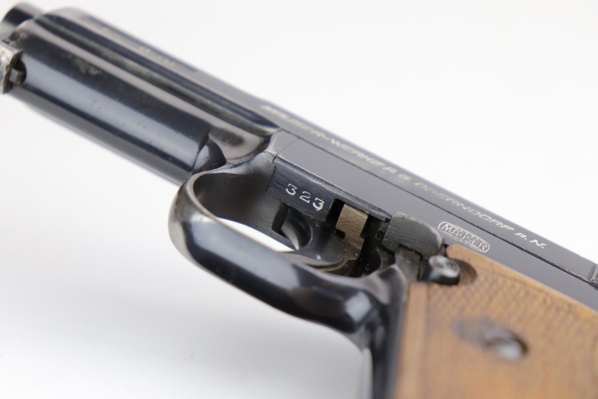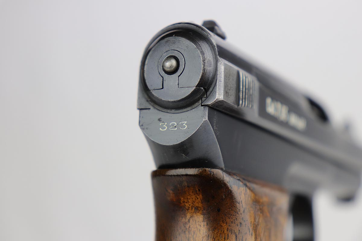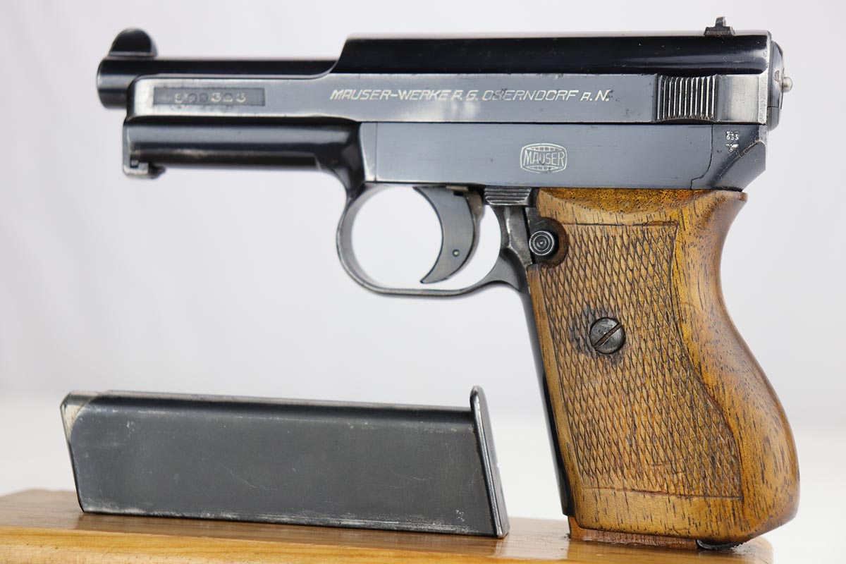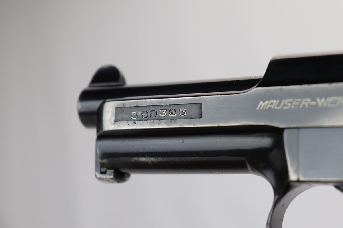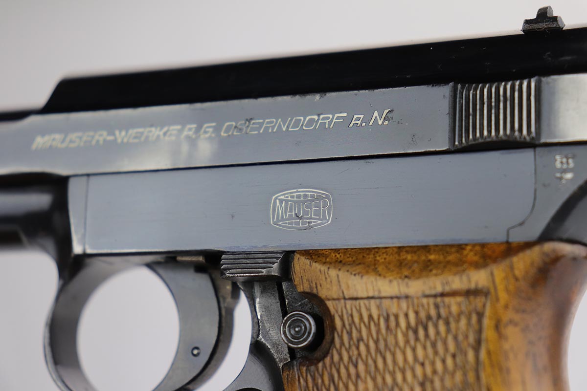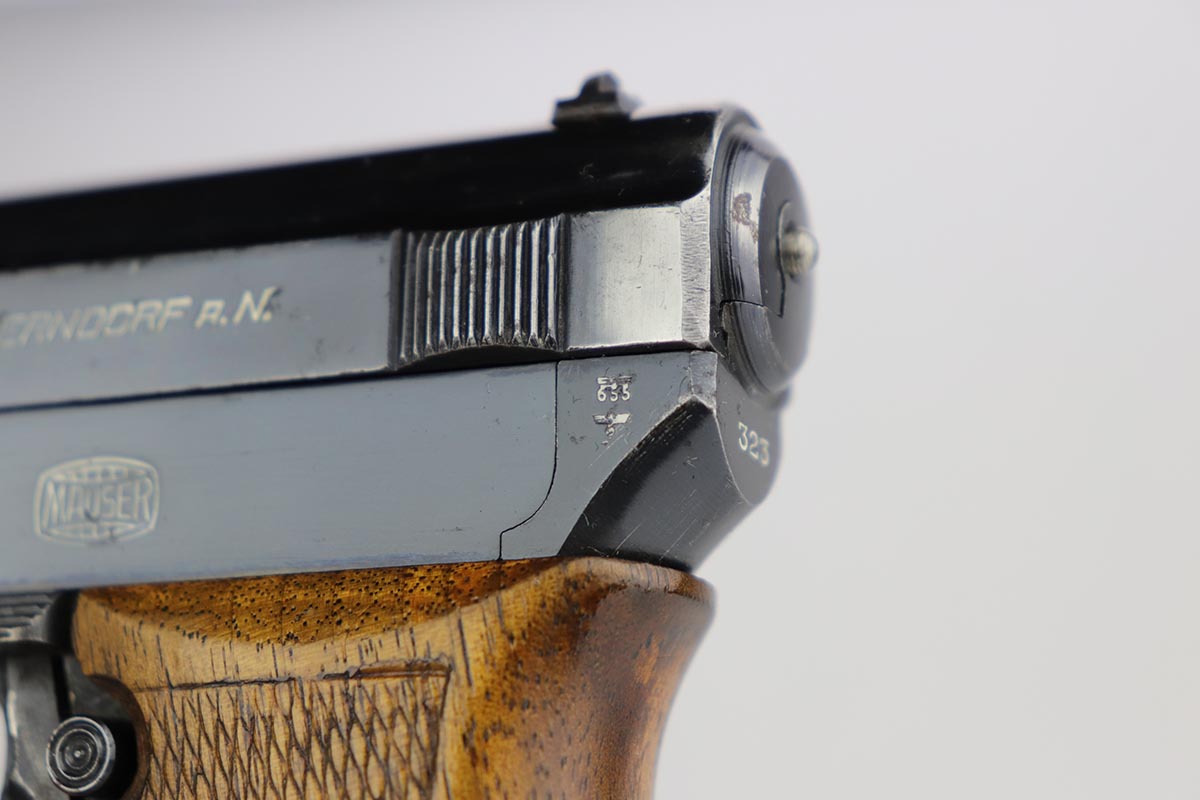 10/25/19 – This is an honest example of a 1934 Mauser that was issued to the German Army. This gun would have been produced just before the factory switched over to HSC production, around 1940 or so. It is Eagle/N proofed which helps to determine the date. It is also Nazi test proofed on the back left side of the frame and Eagle/655 proofed, indicating it was issued to the German Army. These guns are fairly rare with an estimate of only ~8,000 procured by the army. The original finish covers about 85+% of the gun in a nice high-polish finish. There are notable patches of wear on either side of the slide, trigger guard and front strap. Excellent bore. Nice original grip, with some age and handling wear but no cracks or chips.