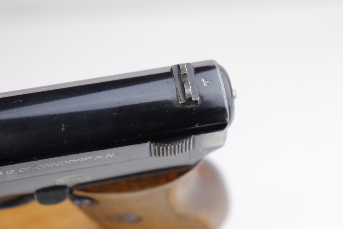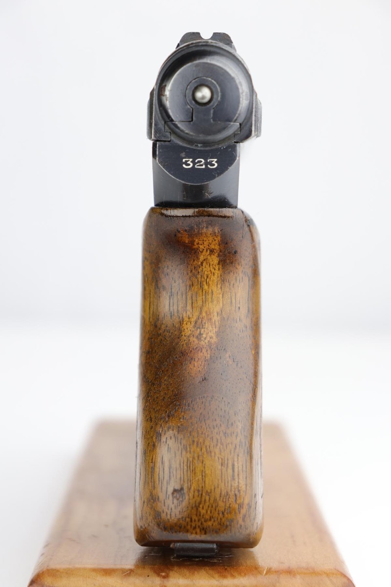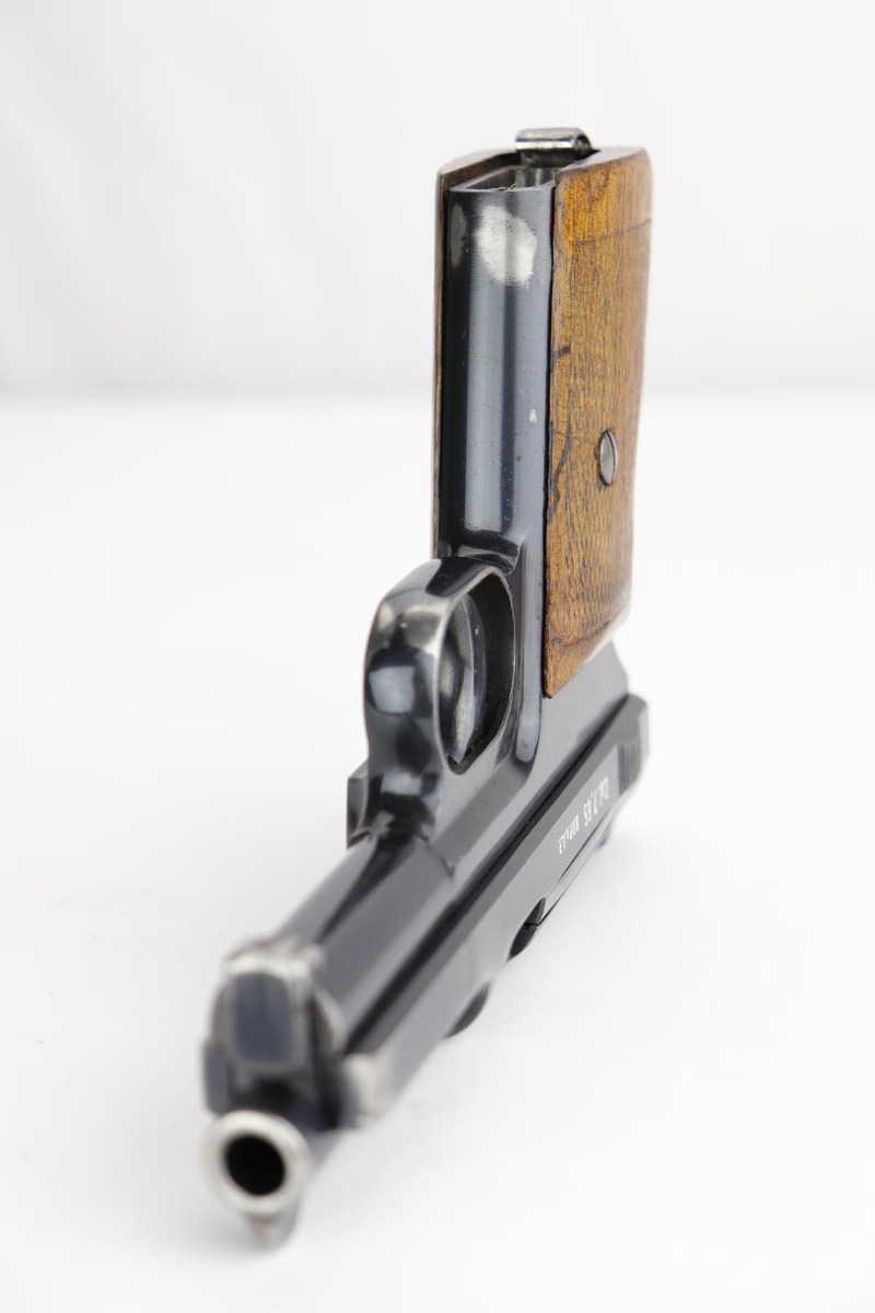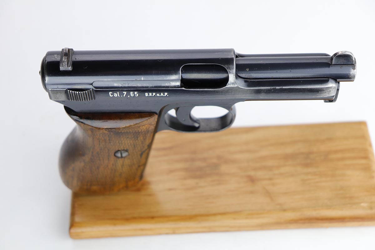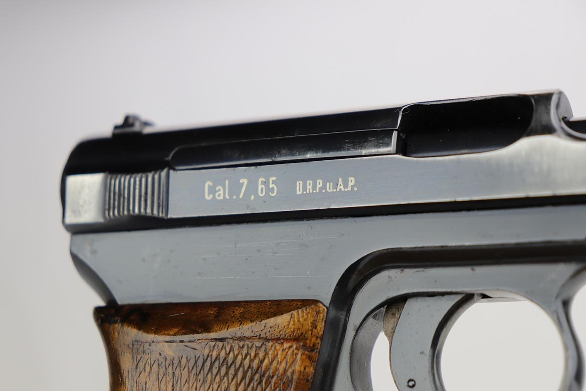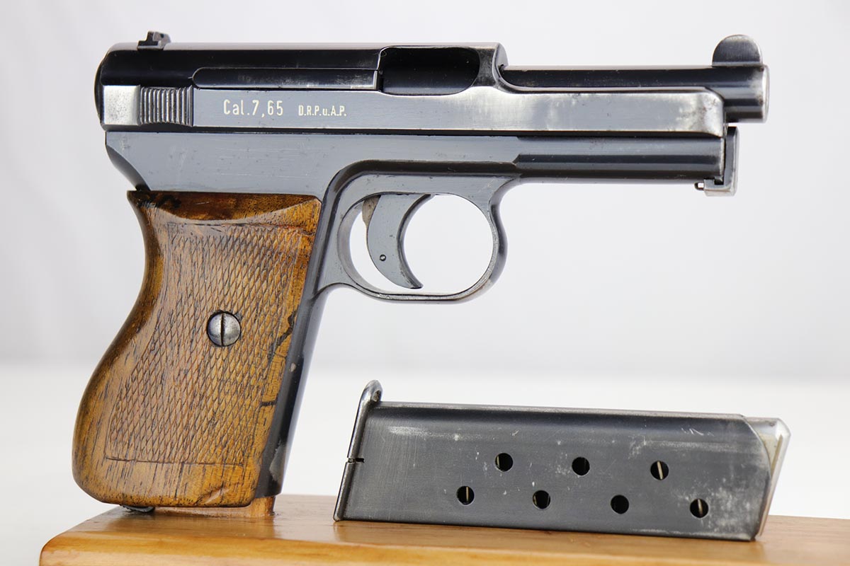 10/25/19 – This is an honest example of a 1934 Mauser that was issued to the German Army. This gun would have been produced just before the factory switched over to HSC production, around 1940 or so. It is Eagle/N proofed which helps to determine the date. It is also Nazi test proofed on the back left side of the frame and Eagle/655 proofed, indicating it was issued to the German Army. These guns are fairly rare with an estimate of only ~8,000 procured by the army. The original finish covers about 85+% of the gun in a nice high-polish finish. There are notable patches of wear on either side of the slide, trigger guard and front strap. Excellent bore. Nice original grip, with some age and handling wear but no cracks or chips.