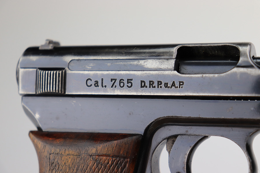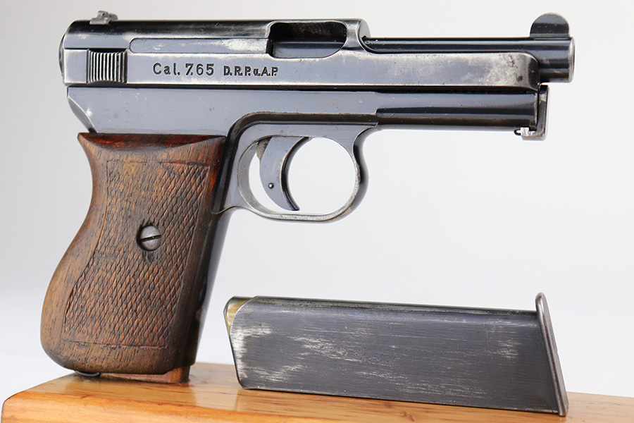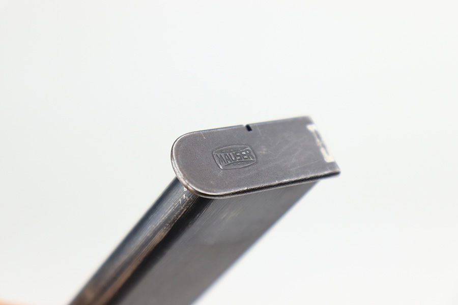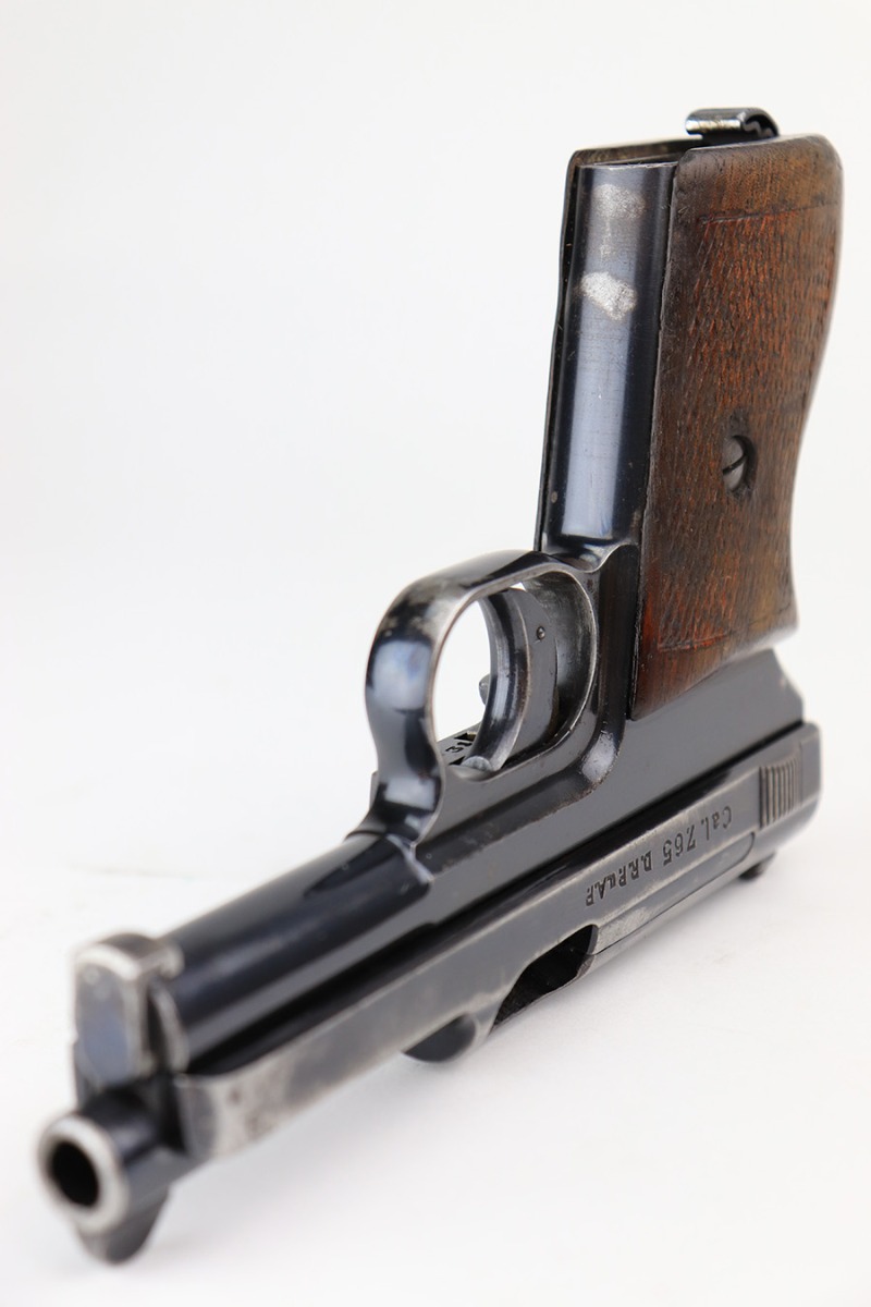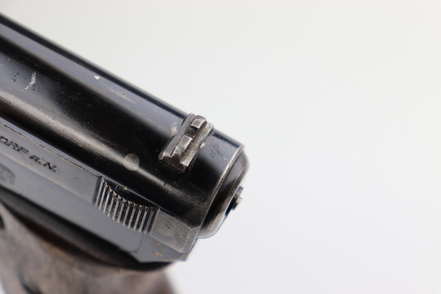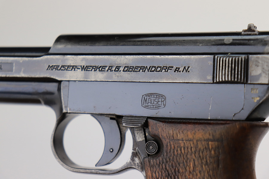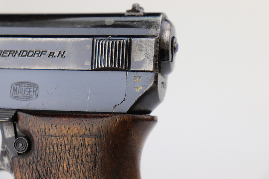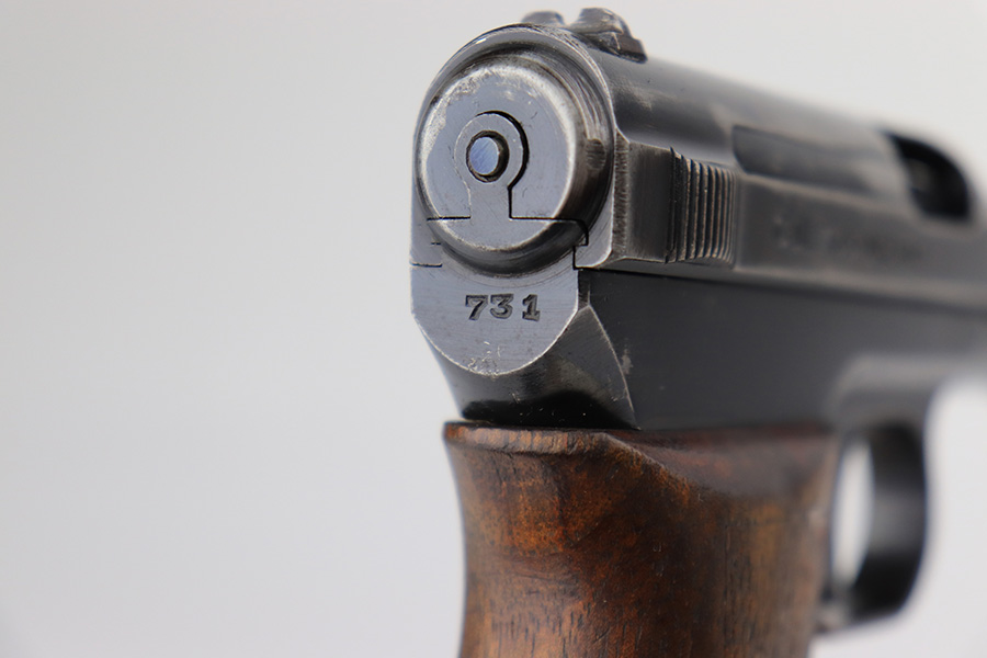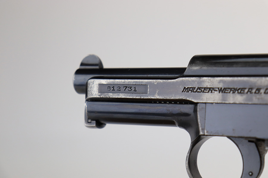3/24/22 – This is an honest example of a 1934 Mauser that was issued to the German Army. This gun would have been produced just before the factory switched over to HSC production, around 1940 or so. It is Eagle/N proofed which helps to determine the date. It is also Nazi test proofed on the back left side of the frame and Eagle/655 proofed, indicating it was issued to the German Army. These guns are fairly rare with an estimate of only ~8,000 procured by the army. It is all matching and has retained roughly 75% of its original high polish finish. Most of the finish loss is along all sides of the slide, but there are some spots of wear on the front strap and underside of the trigger guard. Some very minor pin-pricking around the muzzle. One noticeable scratch on the left side of the frame. Comes with a slightly worn period-correct wood grip and one proper magazine. The bore has good rifling, but there is very minor pin-pricking throughout. The magazine release button is a little stiff.