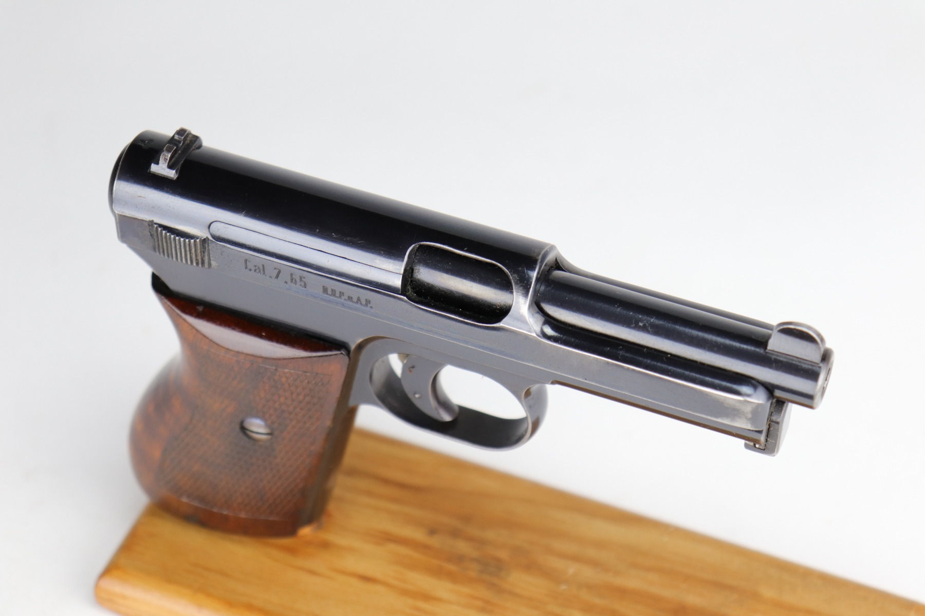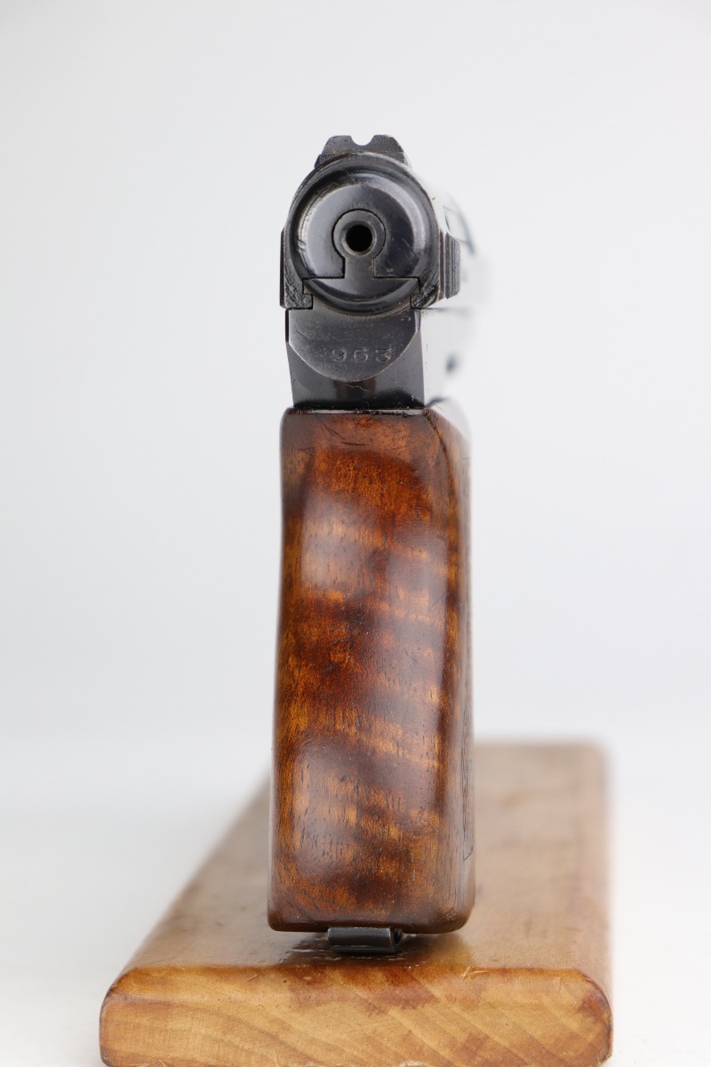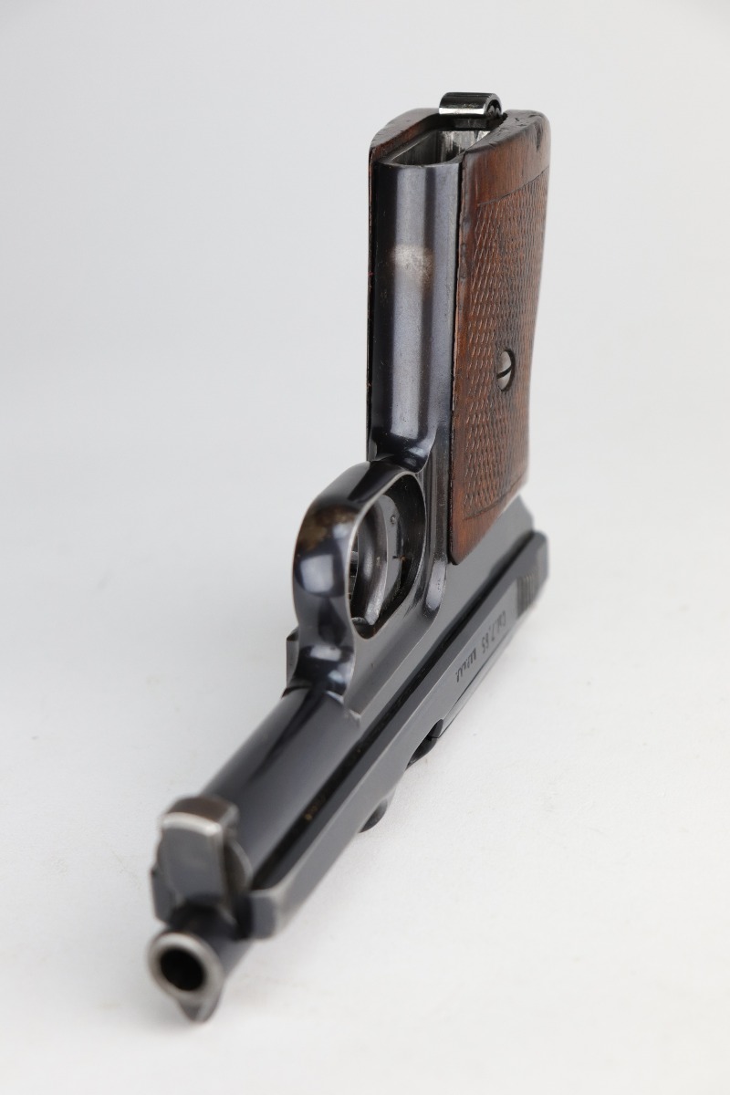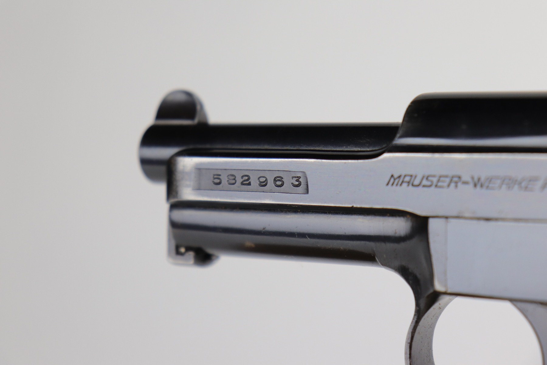 11/20/20 – This is a scarce variation nazi army issued Mauser model 1934. This gun would have been produced just before the factory switched over to HSC production, around 1940-1941. The pistol is proofed on the back left side of the frame with Eagle/655 and a test-fire eagle stamp. There were only about 8,000 of these pistols issued in this way. This pistol comes with a proper 1941-dated, waffenamt holster and two period-correct magazines. This particular gun has retained about 92-93% of its original bluing. There are areas of wear on the front strap, trigger guard, and on the high edges of the slide. Spotty brown patina on the front strap. It has an excellent period-correct grip. The bore is excellent – shiny with strong rifling. The action (racking the slide and pulling the trigger) is very tight. Might improve with a cleaning/oil.