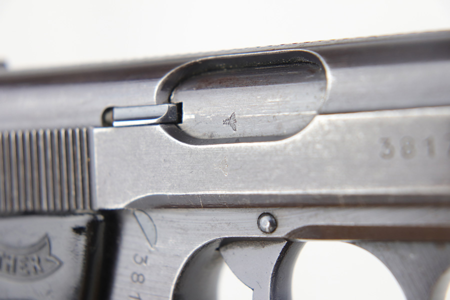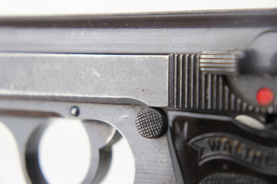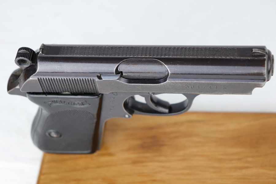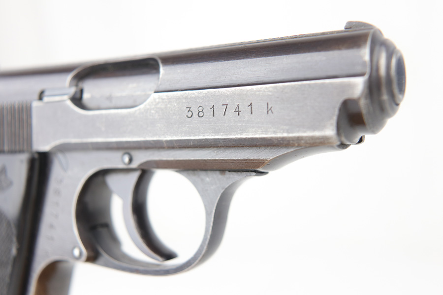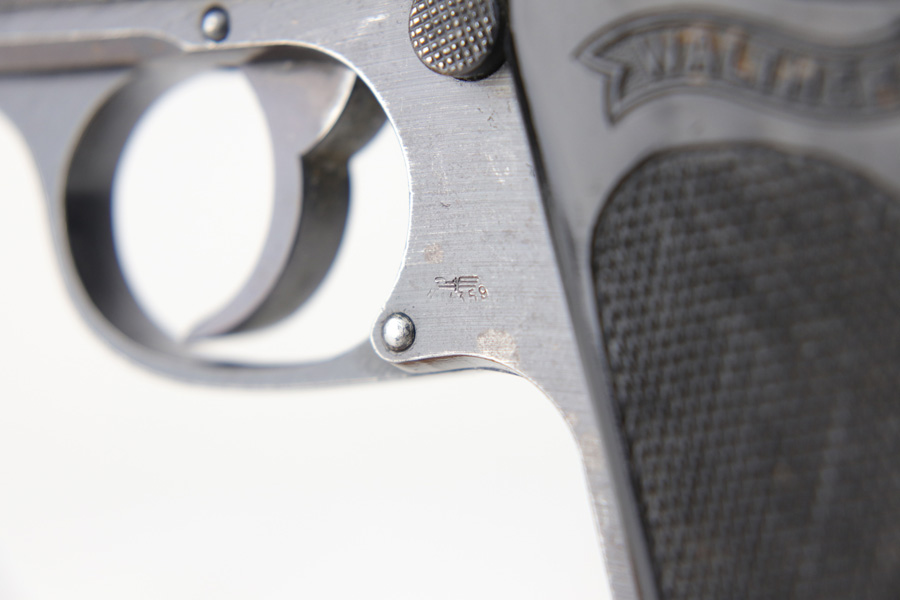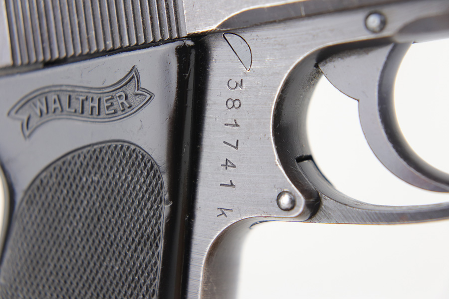 10/25/18 – This is a scarce Nazi Army issued Walther PPK with a photocopy of the original capture document. The pistol is all matching and original but thinning throughout with browning to the finish. There were only ~12,500 of this third variation Army PPK produced, with military style bluing. The black grip has a small chip under the safety and shows some warping. The photocopy of the original document mentions this PPK but is not serialized. Excellent bore.