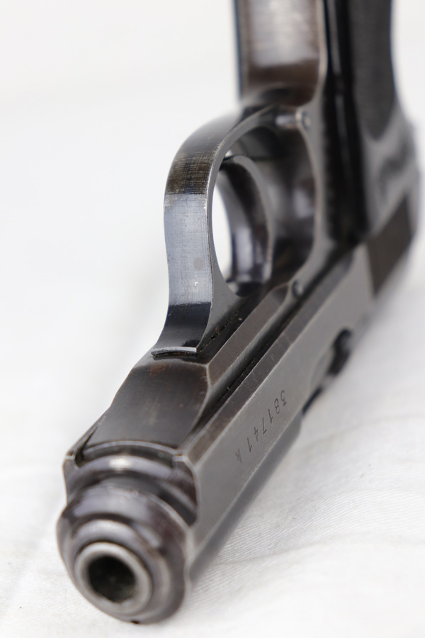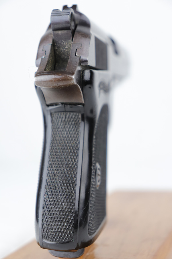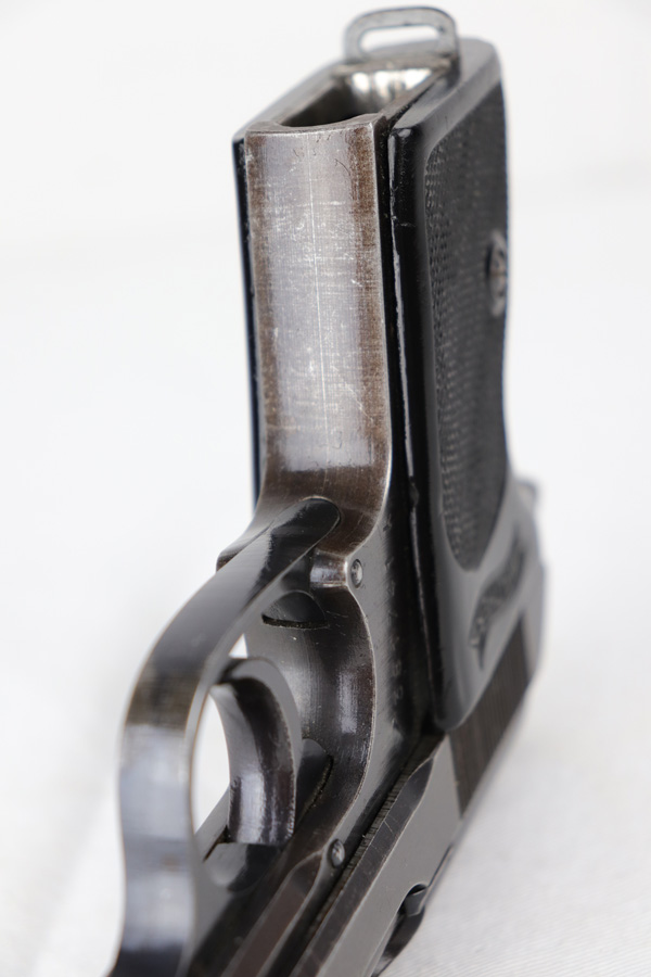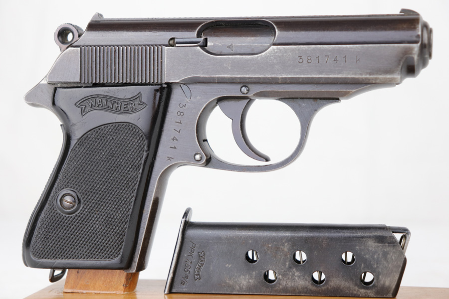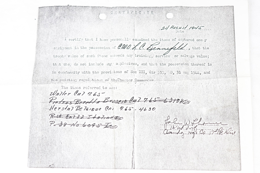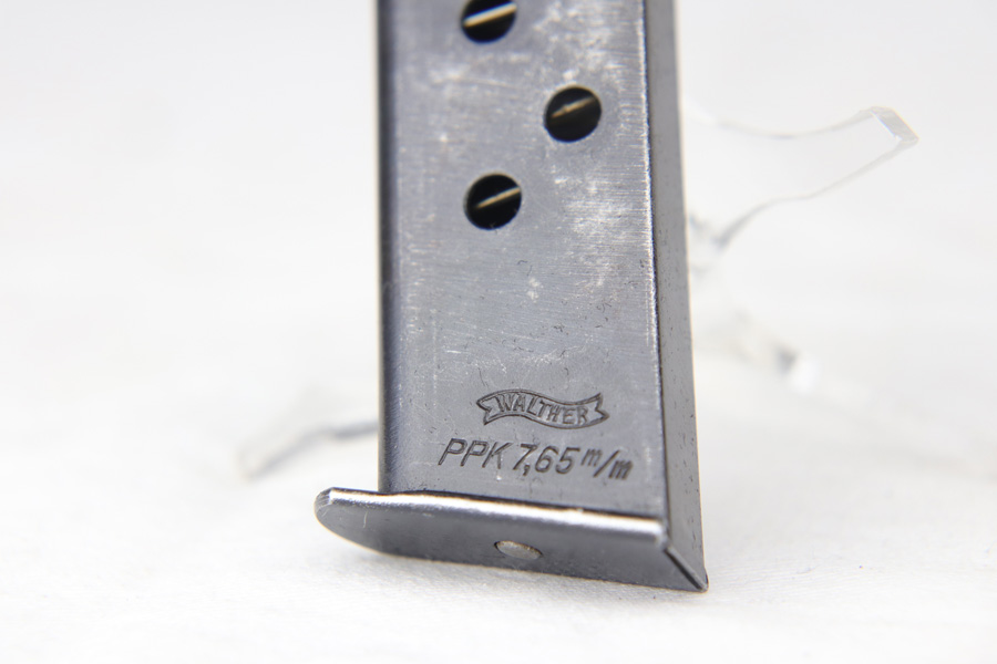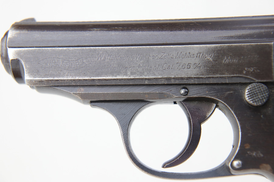 10/25/18 – This is a scarce Nazi Army issued Walther PPK with a photocopy of the original capture document. The pistol is all matching and original but thinning throughout with browning to the finish. There were only ~12,500 of this third variation Army PPK produced, with military style bluing. The black grip has a small chip under the safety and shows some warping. The photocopy of the original document mentions this PPK but is not serialized. Excellent bore.