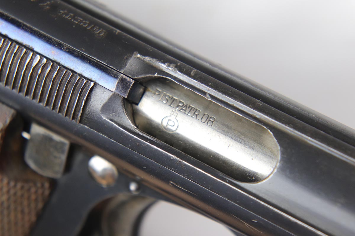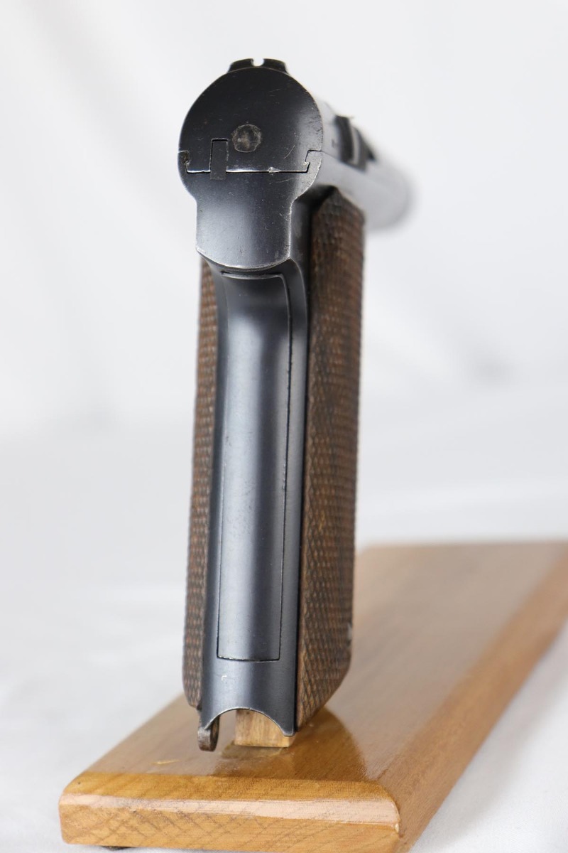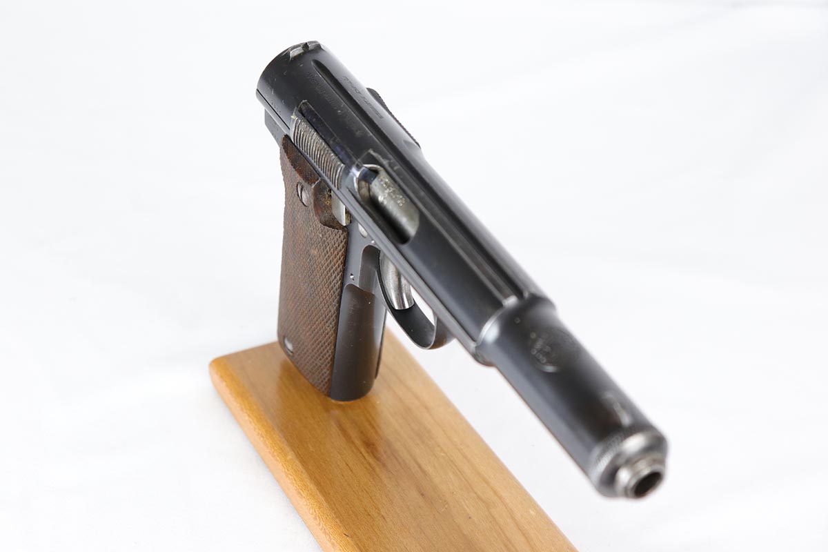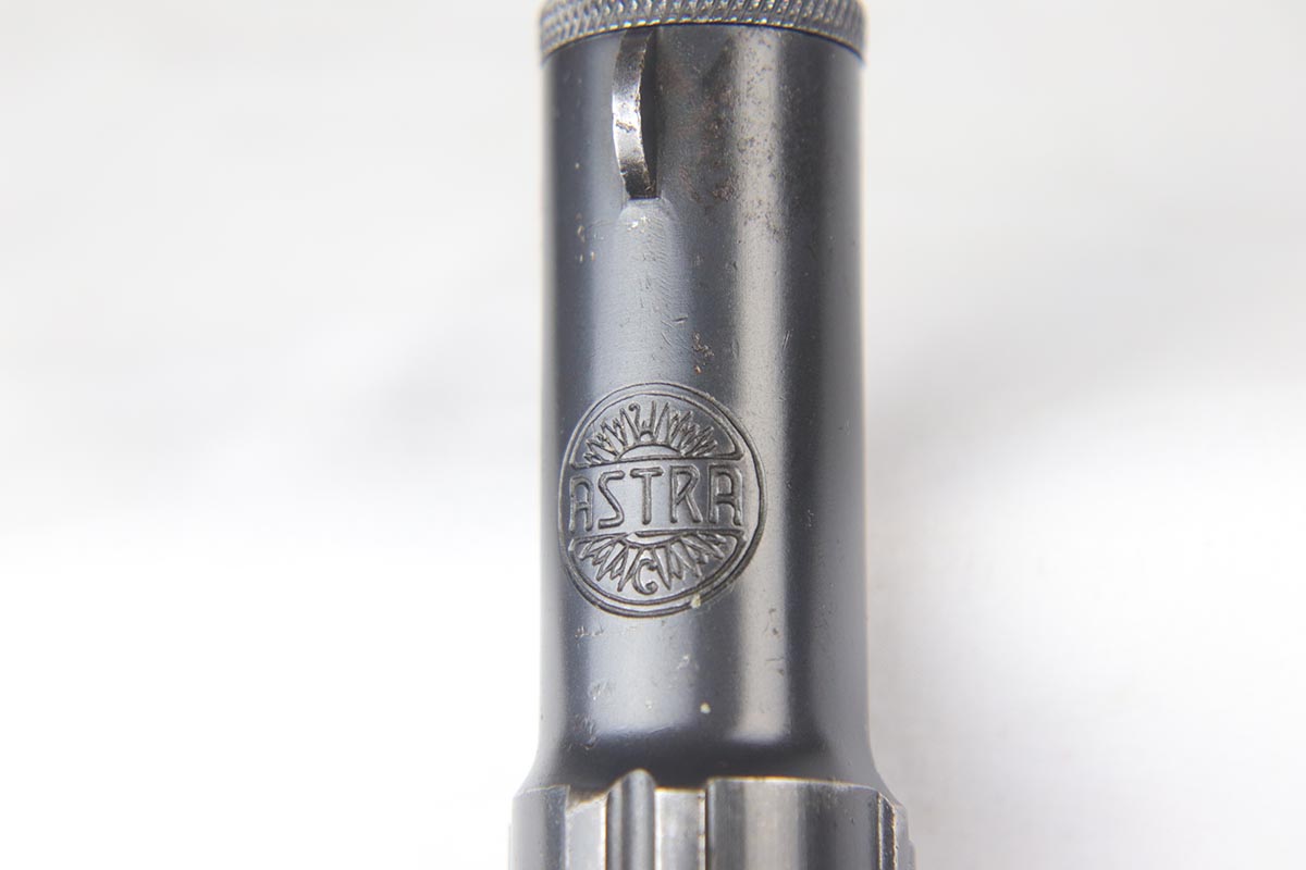 6/22/18 – This is a very nice and honest example of a scarce Astra 600 that is waffen marked and part of the first Nazi contract for these pistols.  This pistol was delivered on July 16 of 1944 in the last batch of Nazi ordered Astra 600s, and it retains about 95% of the original blue with excellent straps and some thinning on the high edges.  These pistols were delivered to German Army via the Spanish-French border before it was closed by the Allies.  Only about 10,000 waffen marked Astra 600s were delivered before this point.  Excellent grips, mint bore and correct magazine.