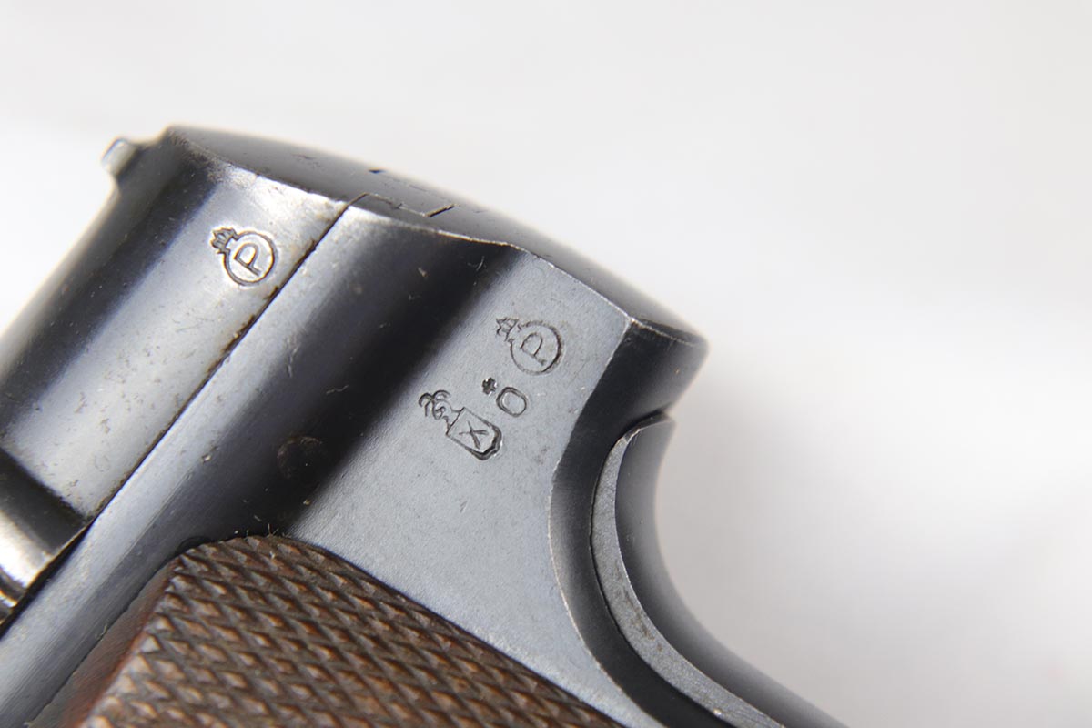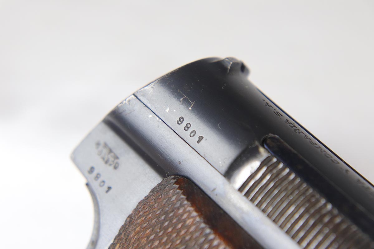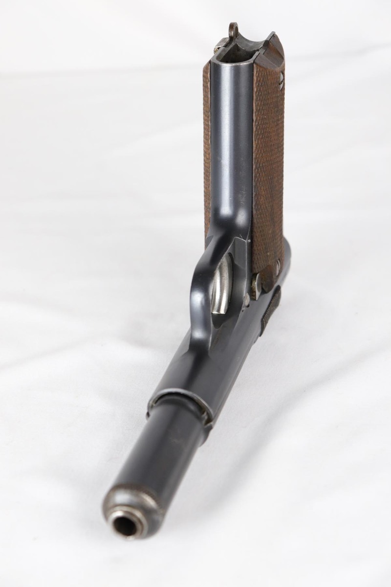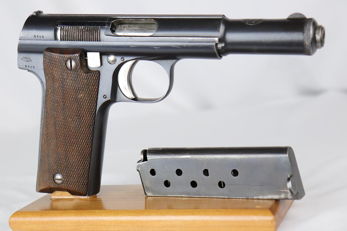 6/22/18 – This is a very nice and honest example of a scarce Astra 600 that is waffen marked and part of the first Nazi contract for these pistols.  This pistol was delivered on July 16 of 1944 in the last batch of Nazi ordered Astra 600s, and it retains about 95% of the original blue with excellent straps and some thinning on the high edges.  These pistols were delivered to German Army via the Spanish-French border before it was closed by the Allies.  Only about 10,000 waffen marked Astra 600s were delivered before this point.  Excellent grips, mint bore and correct magazine.