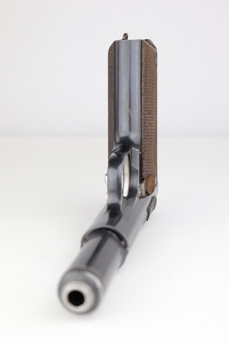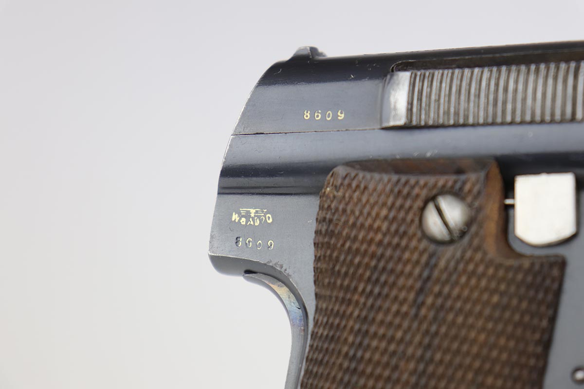 5/7/19 – This is a scarce Astra model 600 that was part of a short-lived Nazi contract of only 10,000 such pistols. It is all original and correct, with matching numbered magazine. The finish rates at 95-96% with minor thinning on the straps but the majority of finish loss found along the slide. Excellent, shiny bore. Very nice grips with minor handling wear, and a small surface crack on the right panel.
