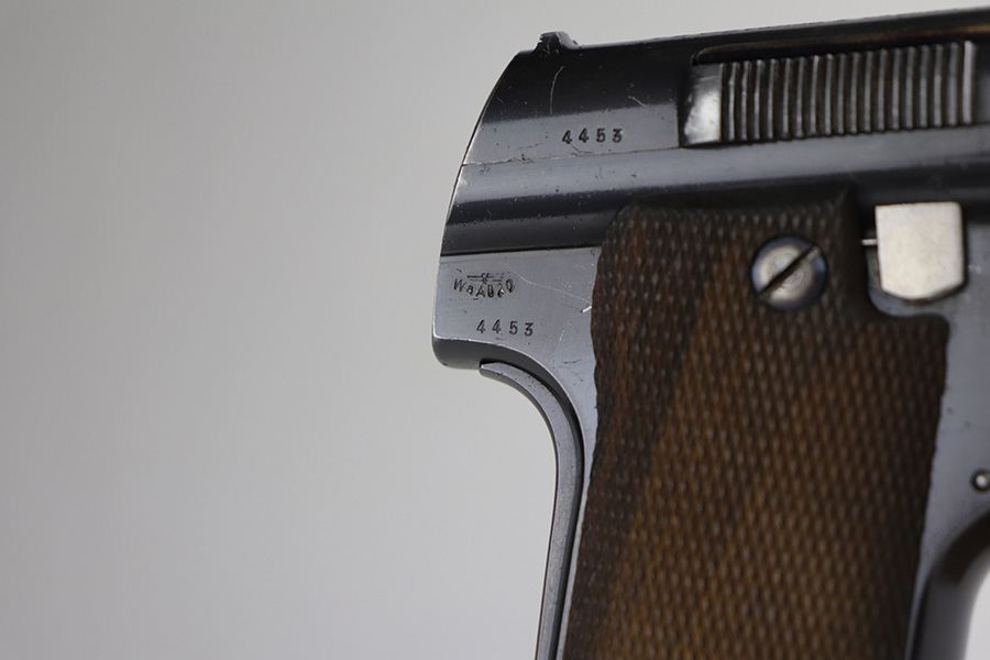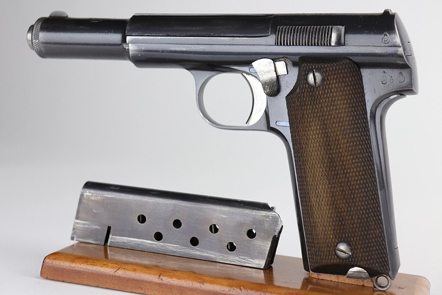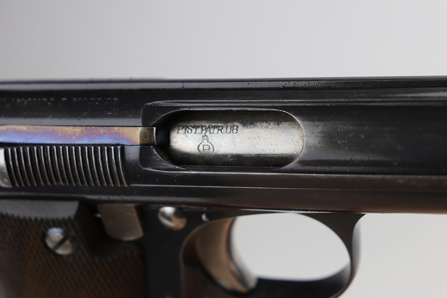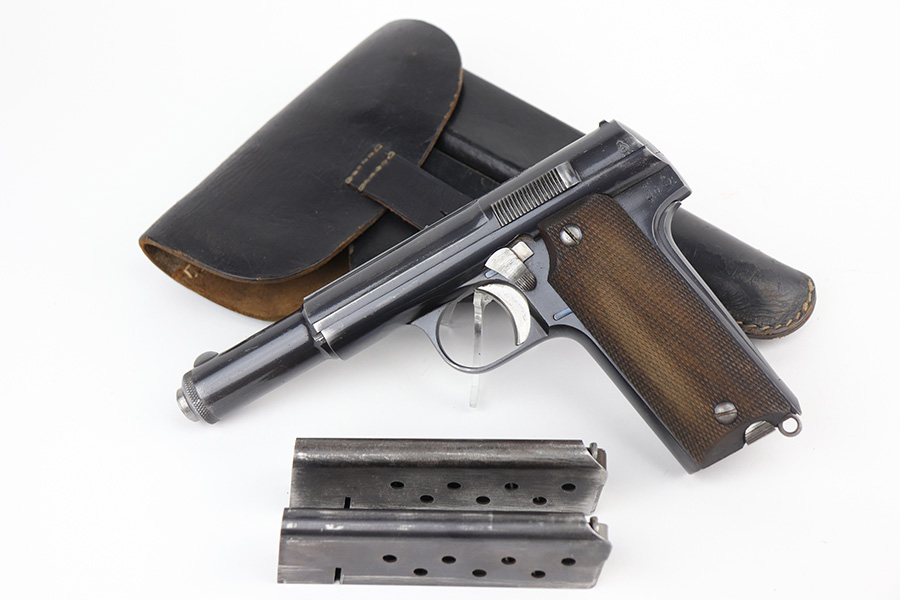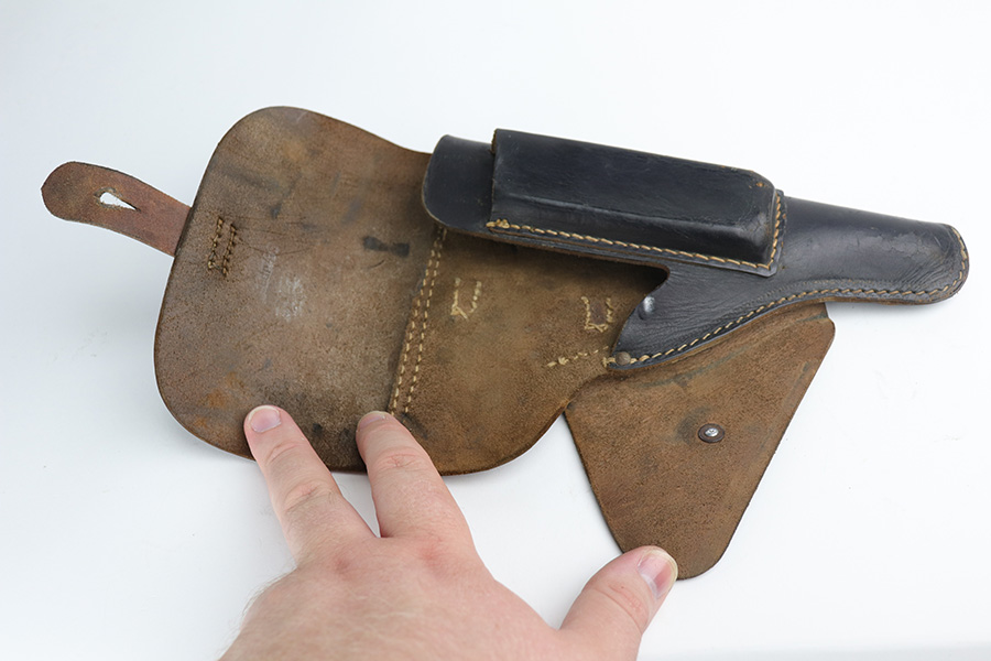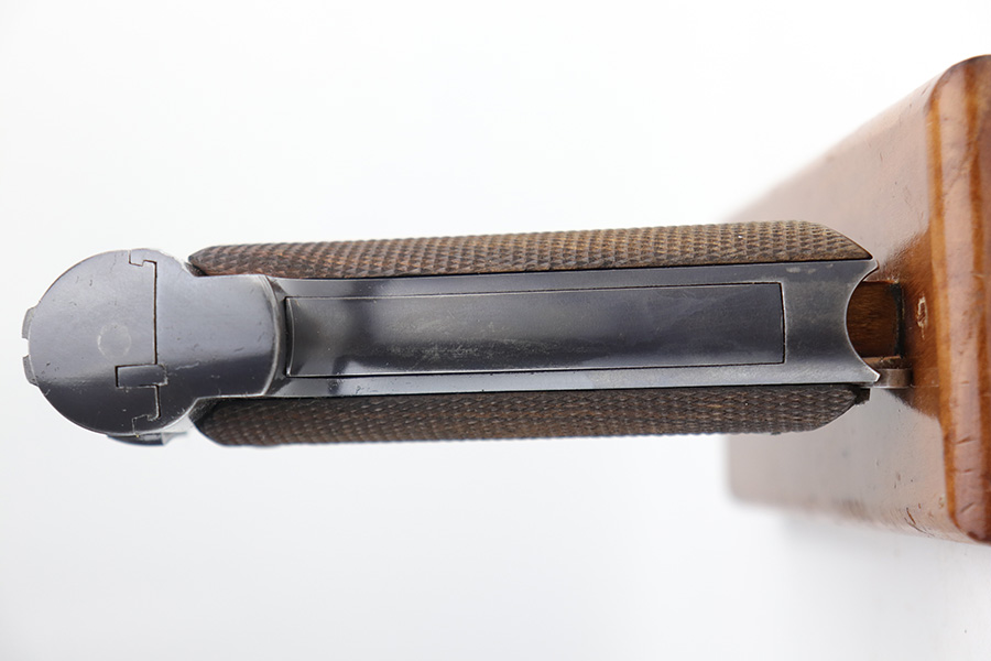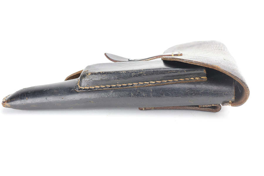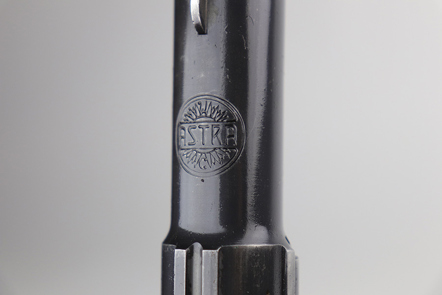 8/20/21 – This is a nice, honest example of a scarce Astra 600 rig that is waffen marked and part of the first Nazi contract for these pistols.  This pistol was delivered on June 23rd of 1944. It retains about 90-92% of the original blue with several minor spots of bluing loss, likely from rubbing against the holster.  These pistols were delivered to German Army via the Spanish-French border before it was closed by the Allies.  Only about 10,000 waffen marked Astra 600s were delivered before this point.  The pistol comes with a scarce, original holster that is ’44 dated with sharp waffenamt and ‘bdr’ maker mark.  Excellent grips and two correct magazines.  Bore is nice and shiny.