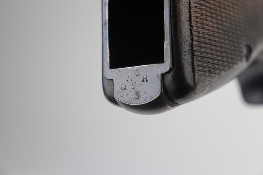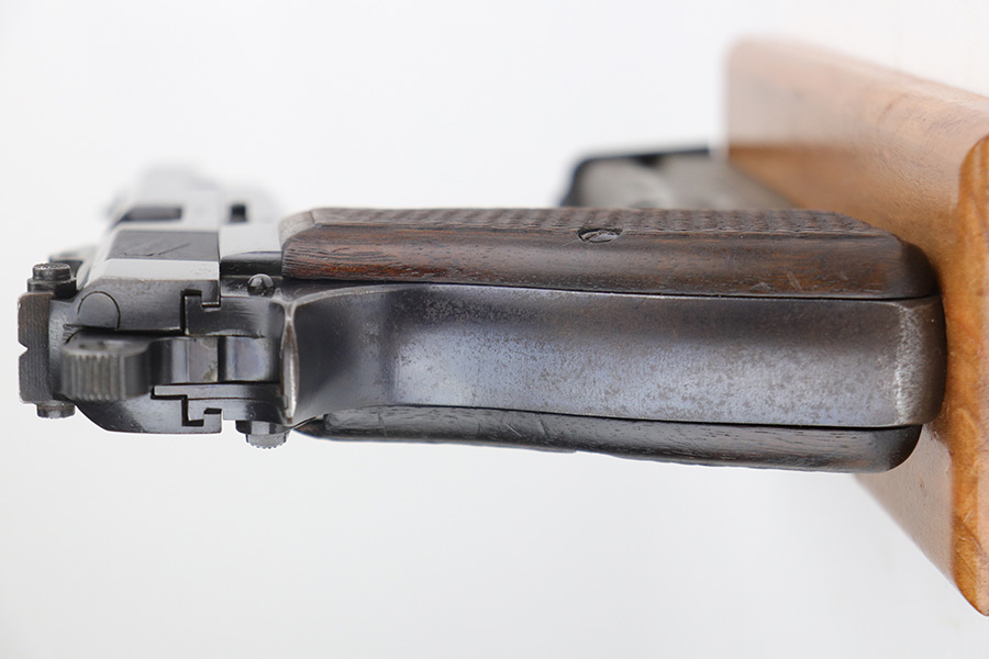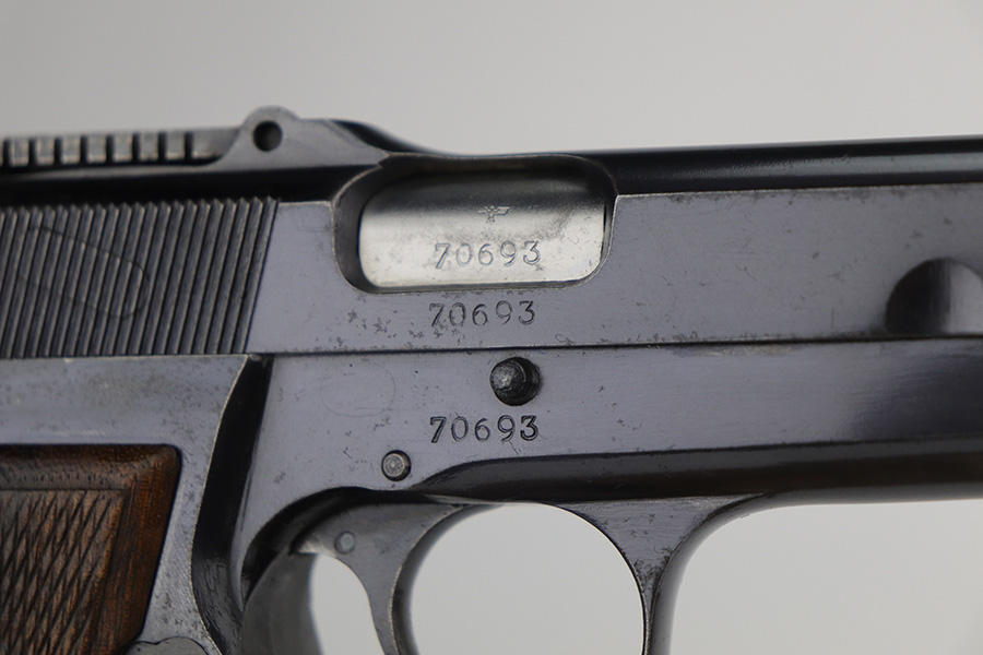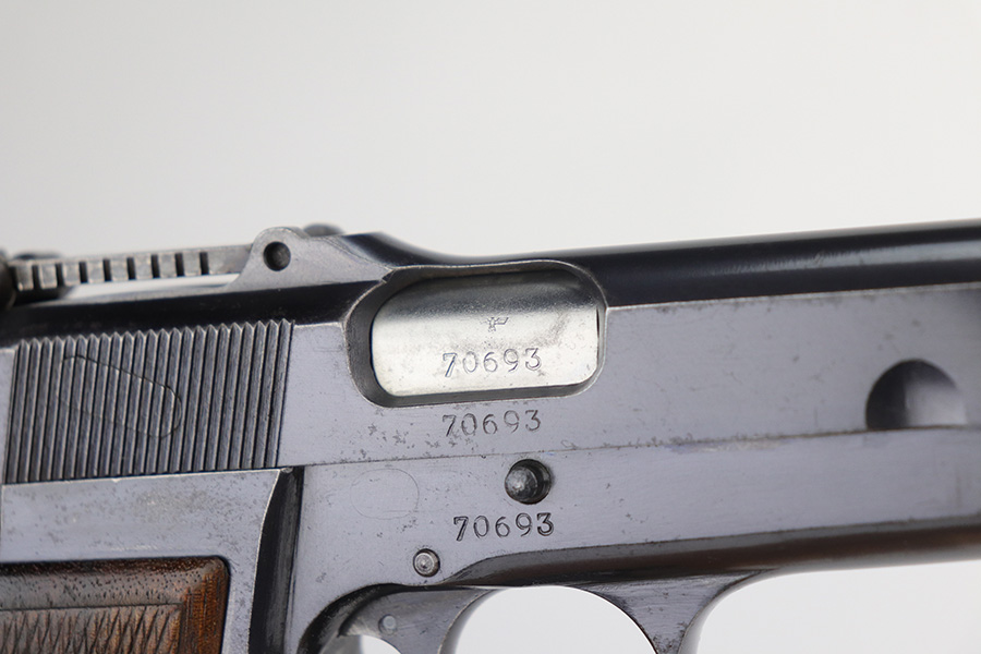 11/29/21 – This is an early Nazi FN Browning High Power with tangent rear sight and WaA103 proofs on slide, frame and magazine. It’s all matching and original with about 96-97% of the blue remaining. There is very little actual bluing loss on this one, just minor high edge wear. It does have visible patina/oxidation on the grip straps and right side of the pistol though. All matching and original. The grips show some handling wear but no cracks or chips. Bore has decent rifling but some freckling and frost throughout.