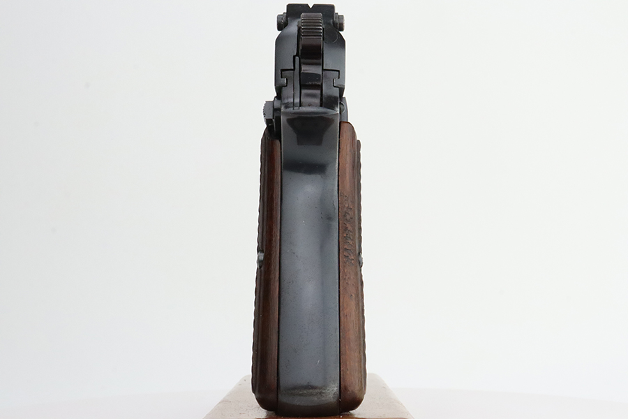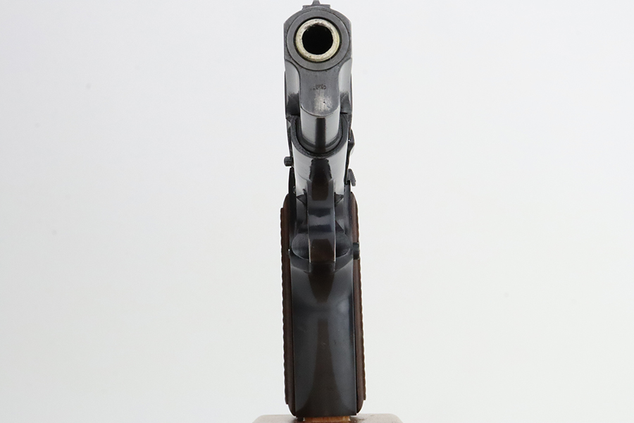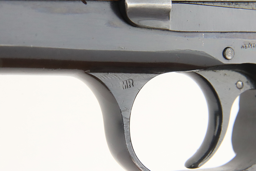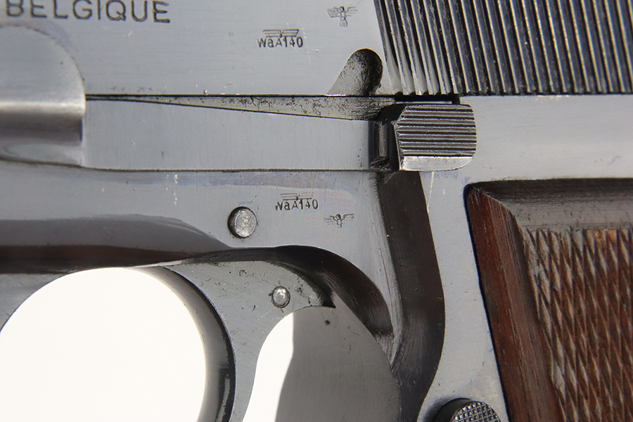 2/2/24 – This is an excellent example of an early FN Browning High Power with tangent rear sight that was issued to the German military. All matching and original with WaA140 proofs on slide and frame. Unmarked wartime magazine. The original blue rates at 96-97% with minor high edge wear, a little wear on the bottom of the back strap and a minor spot of thinning on the front strap. Minty bore and grips.