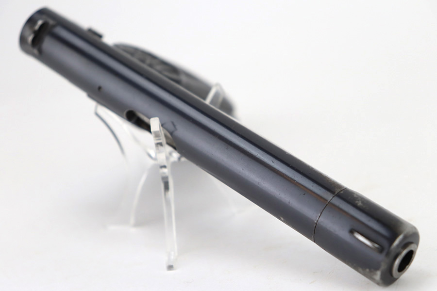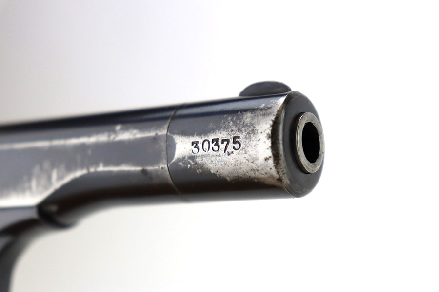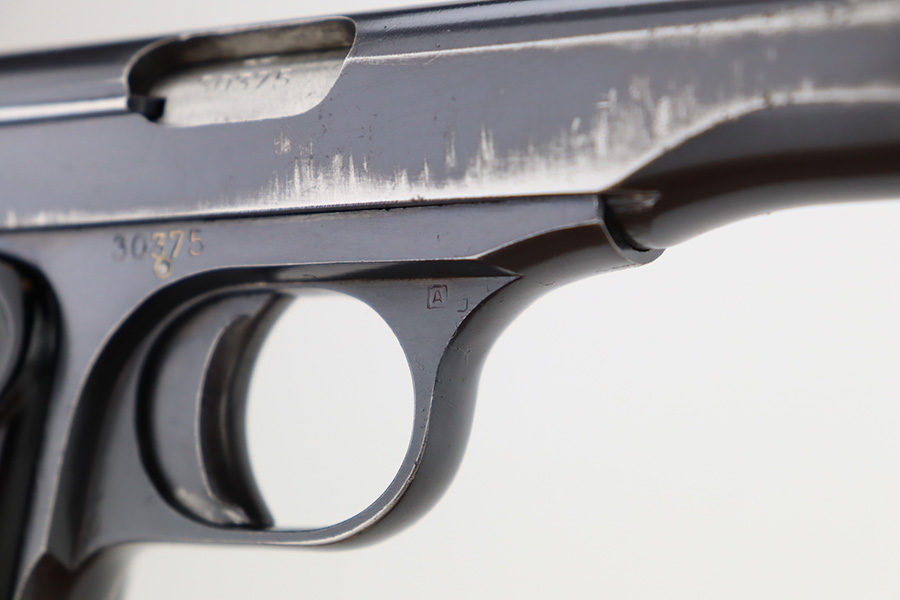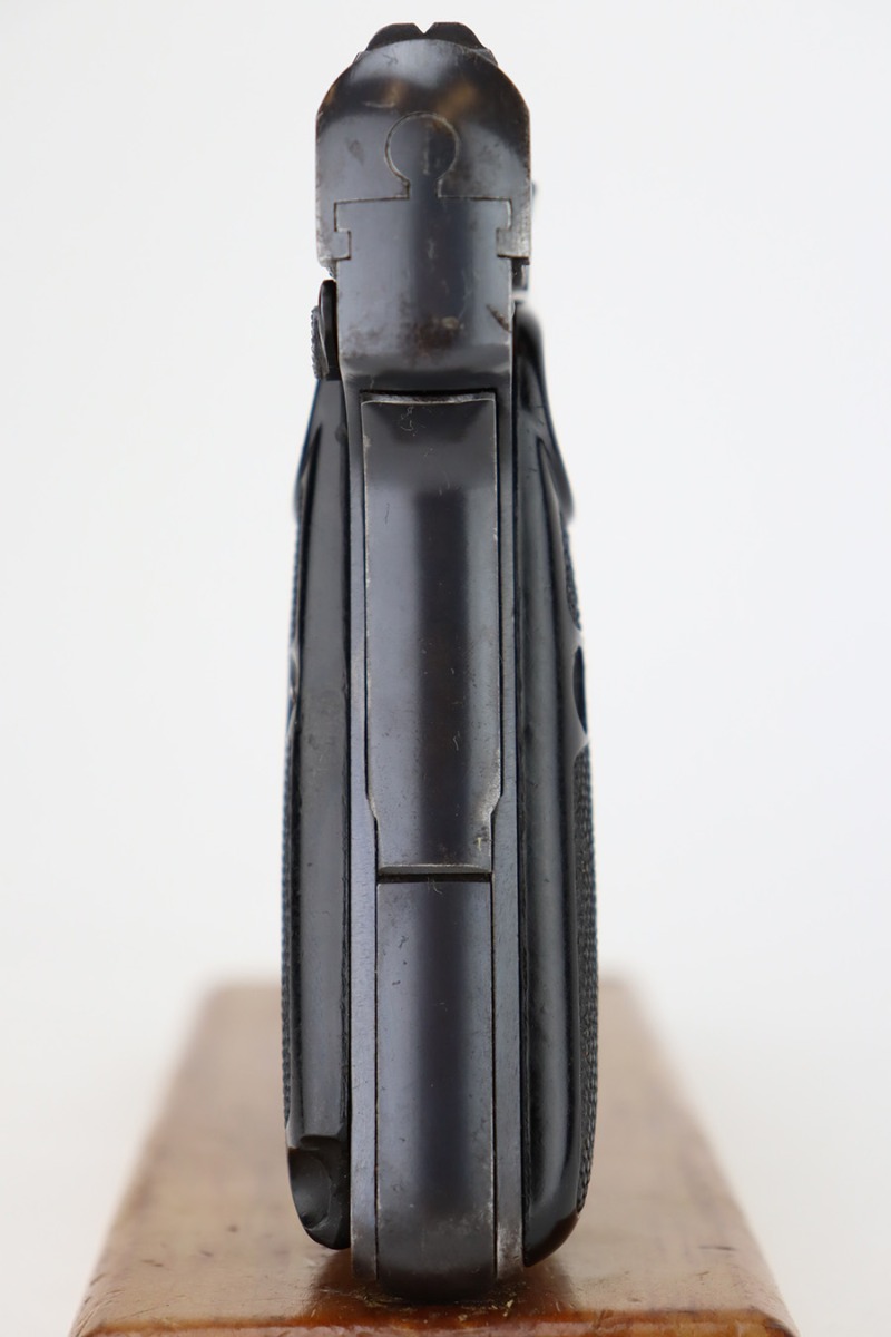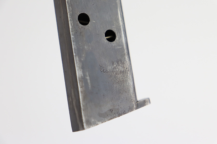 12/13/23 – This is a scarce FN Browning Model 1922 issued to the Nazi military during WW2. This one is all matching and is scarce because it has the earlier “Waffen 103” military proofs. It has retained roughly 80% of its original finish. The majority of the wear is around the muzzle and on the right side of the slide. Fitted with black bakelite grips and comes with a rare “Waffen 103” marked magazine (the marking is hard to see). Minty bore.