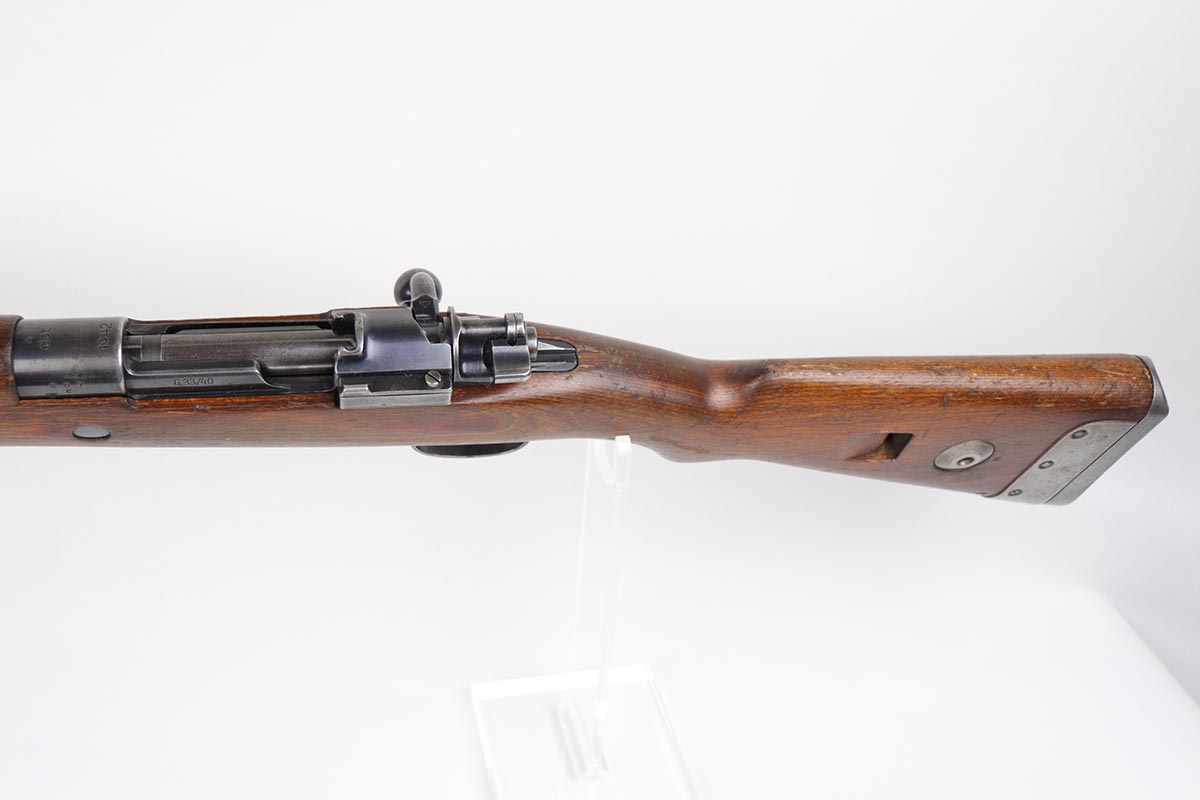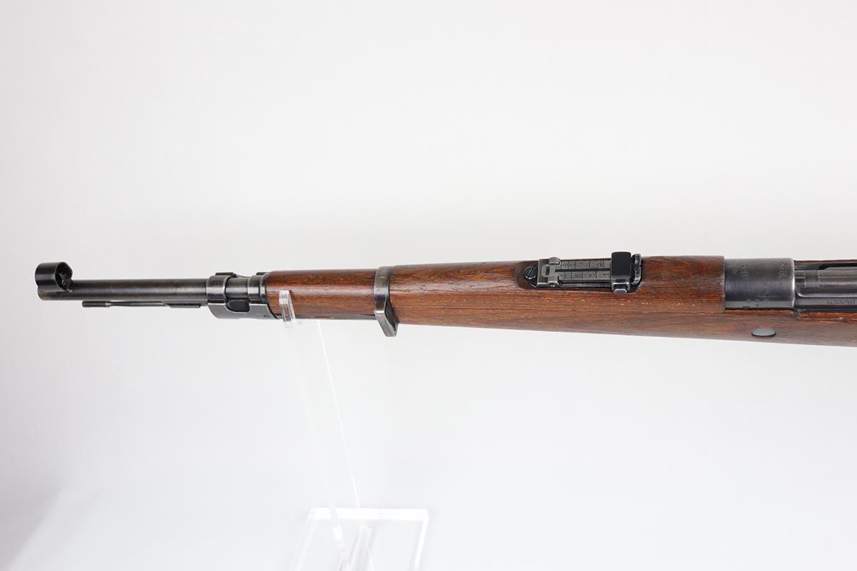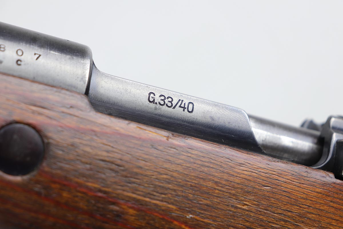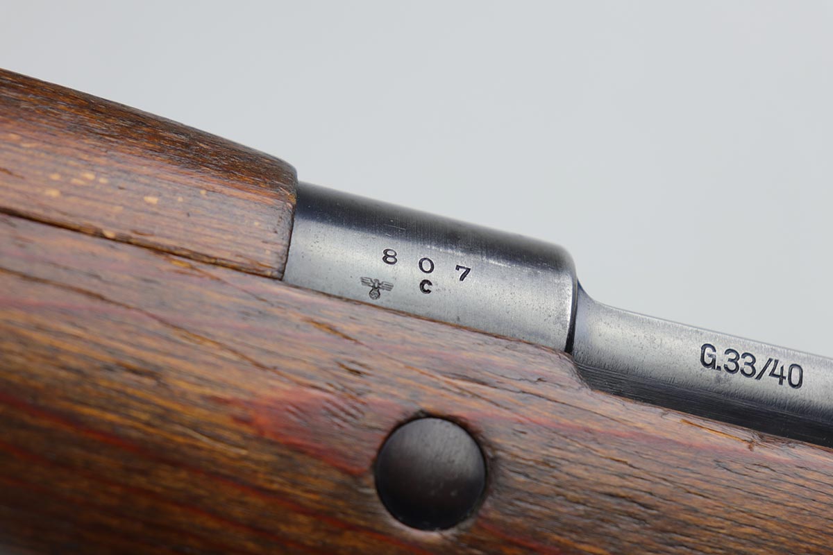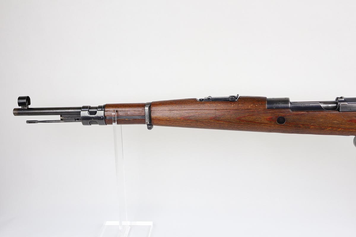 2/27/20 – This is a scarce German G33/40 Mountain carbine from World War II. This one was built at the Waffenwerke Brunn factory in Czechoslovakia and they are patterned after the Czech VZ 33. It was made in 1942 and maker coded “dot” with an early Walnut stock. Many of the G 33/40 carbines were issued to the German “Gebirgstruppen”, or Mountain Infantry, where the metal plate on the left side of the butt was used to keep the stock from harm while using the rifle for assistance in climbing. The rifle is all matching and original with about 70-80% blue remaining, showing general thinning on the bands and trigger assembly. Original stock is matching numbered to the receiver with waffenamt on the bottom of stock. The stock is fairly nice with just a few dings. The bore is terrific. Original cleaning rod and sight hood is included.