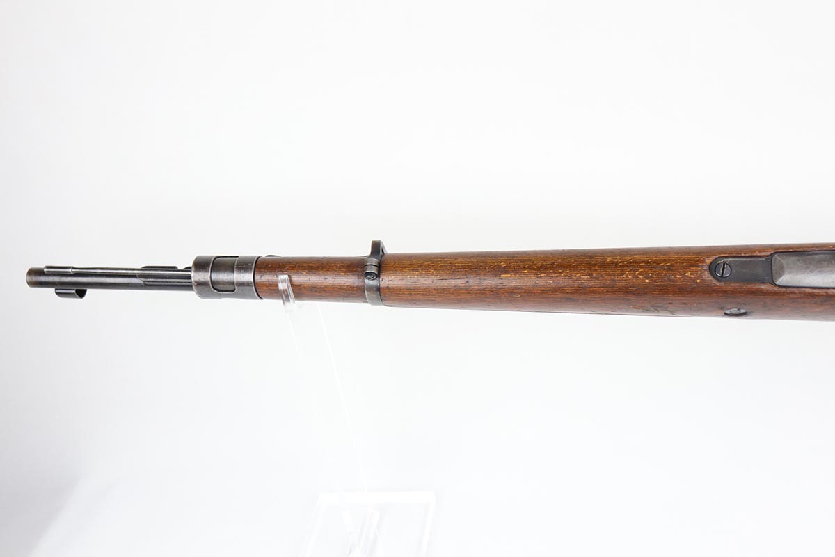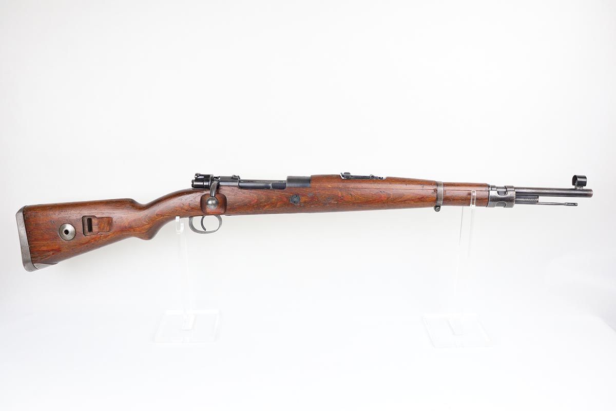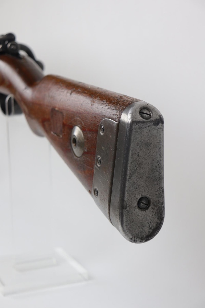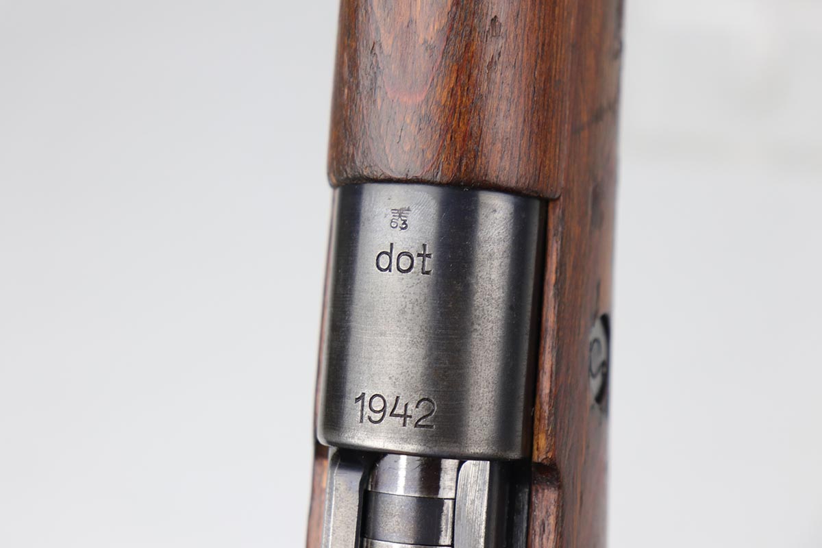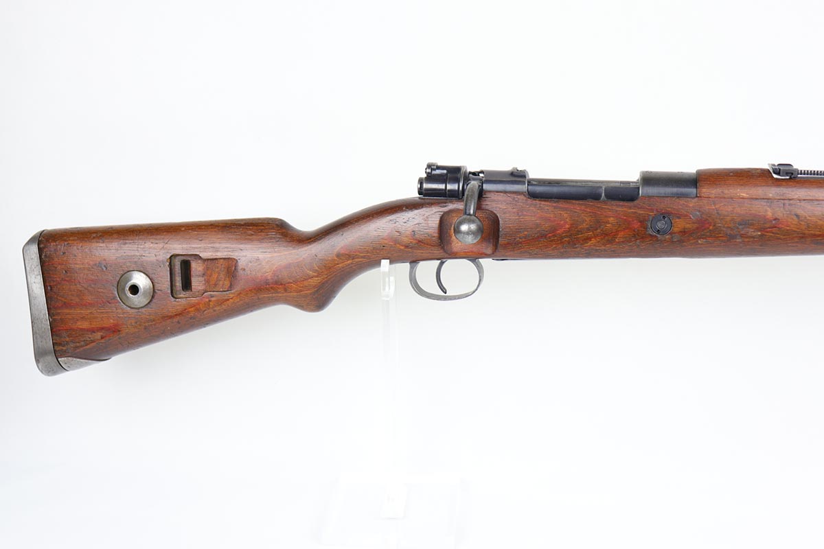 2/27/20 – This is a scarce German G33/40 Mountain carbine from World War II. This one was built at the Waffenwerke Brunn factory in Czechoslovakia and they are patterned after the Czech VZ 33. It was made in 1942 and maker coded “dot” with an early Walnut stock. Many of the G 33/40 carbines were issued to the German “Gebirgstruppen”, or Mountain Infantry, where the metal plate on the left side of the butt was used to keep the stock from harm while using the rifle for assistance in climbing. The rifle is all matching and original with about 70-80% blue remaining, showing general thinning on the bands and trigger assembly. Original stock is matching numbered to the receiver with waffenamt on the bottom of stock. The stock is fairly nice with just a few dings. The bore is terrific. Original cleaning rod and sight hood is included.