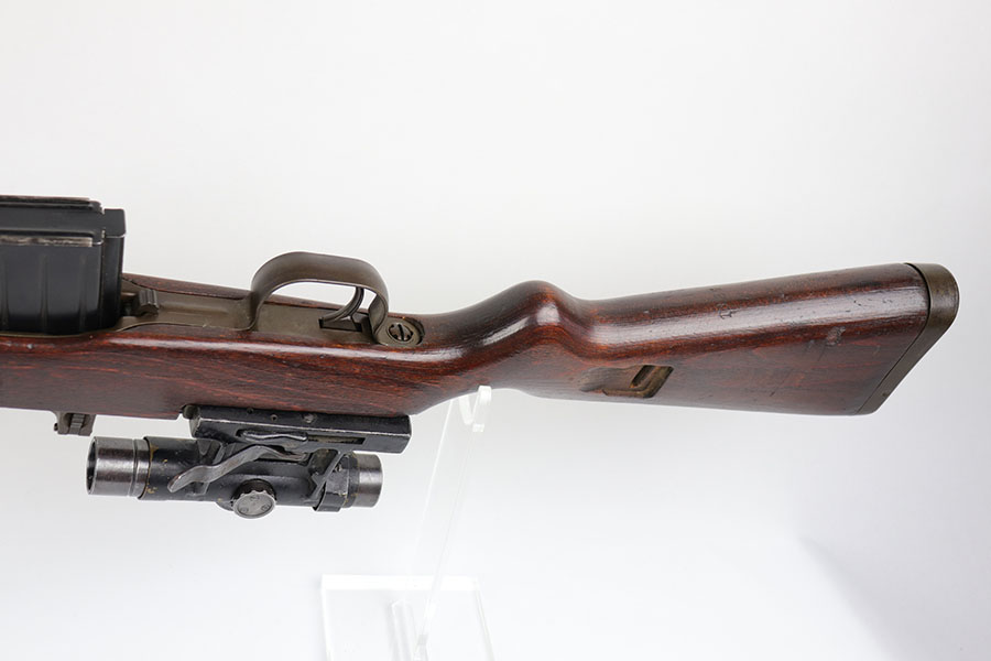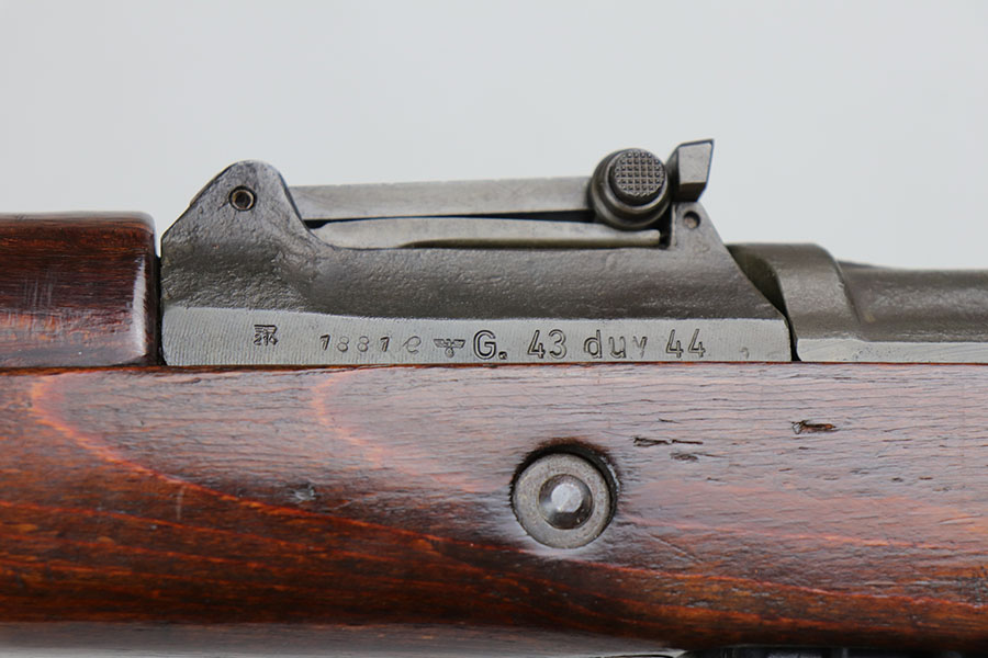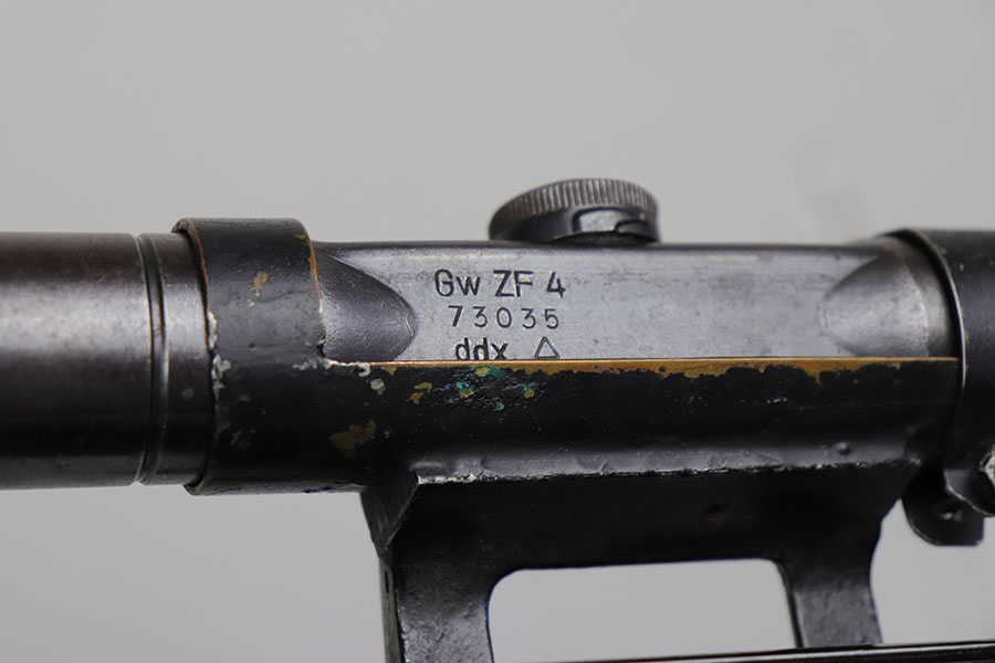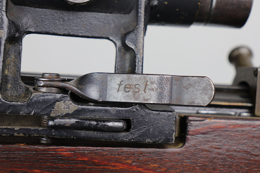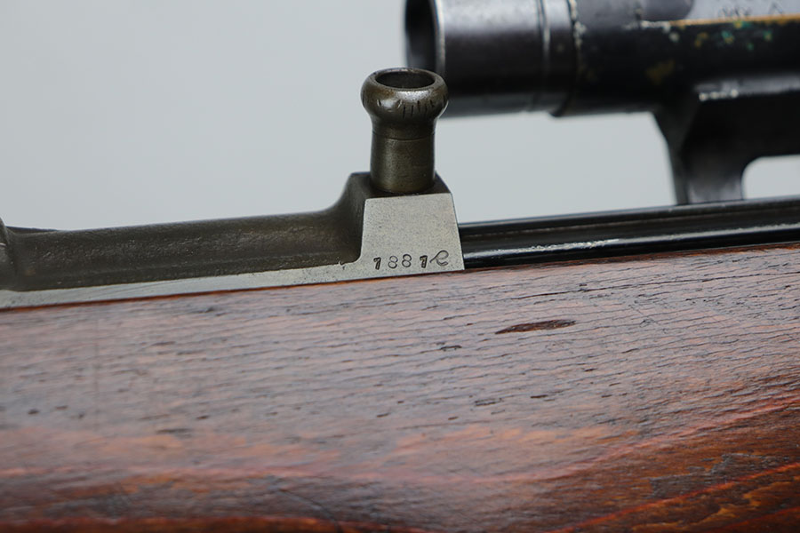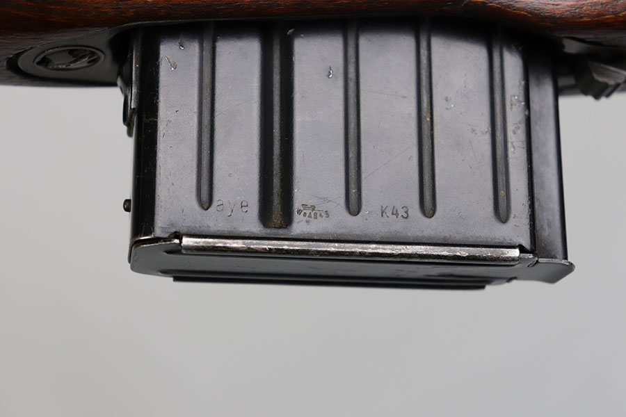 3/31/20 – This is a scarce Nazi G.43 sniper rifle that was made in 1944 at the Berlin Lubecker factory, though likely actually assembled in early 1945. It has dual-tone metal parts with a mix of phosphate and blued pieces. The finish on the receiver and barrel is excellent, while front band trigger assembly show some patina and oxidation. All matching numbers, including the stock. Stock has a notable chip on the right side of it, and a couple of waffenamts that are a little faint. No dust cover on the bolt. Original ZF4 scope with pretty clear optics. The mount appears original and late war with a black painted finish similar to the SACM M1935A. Terrific bore. Magazine marked ‘aye’.