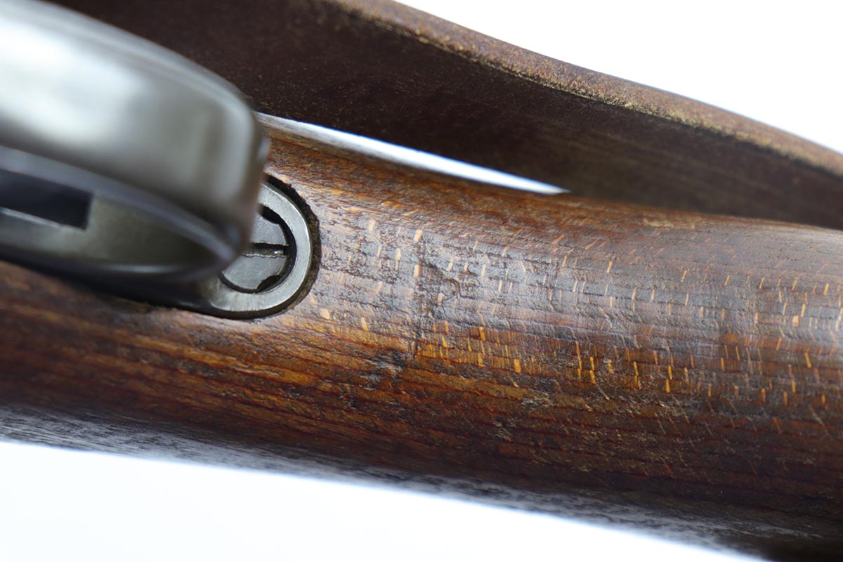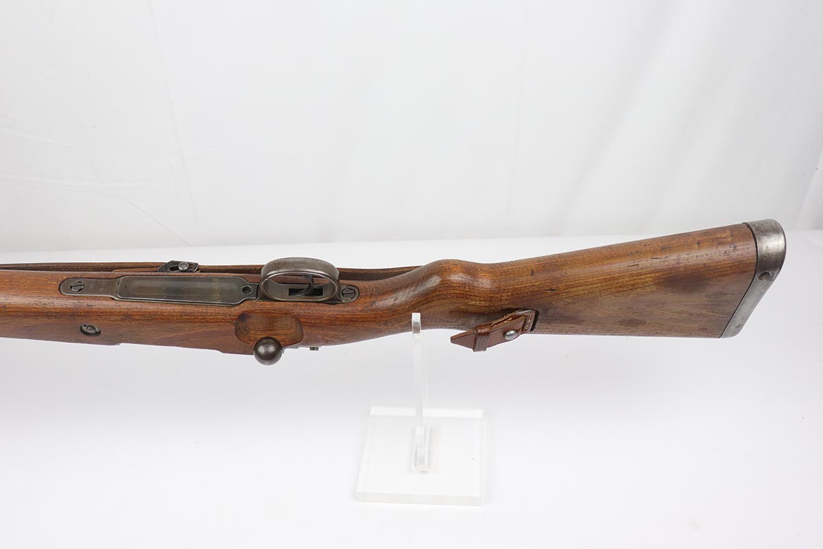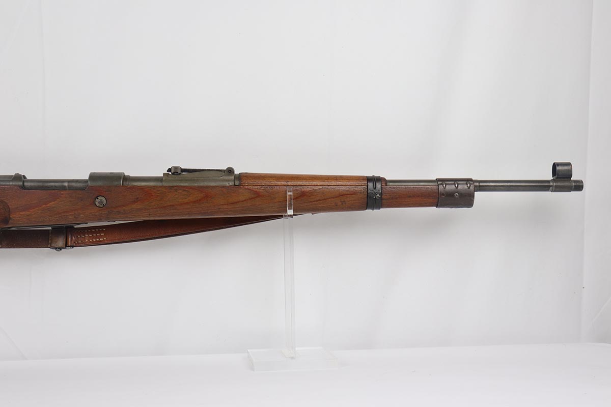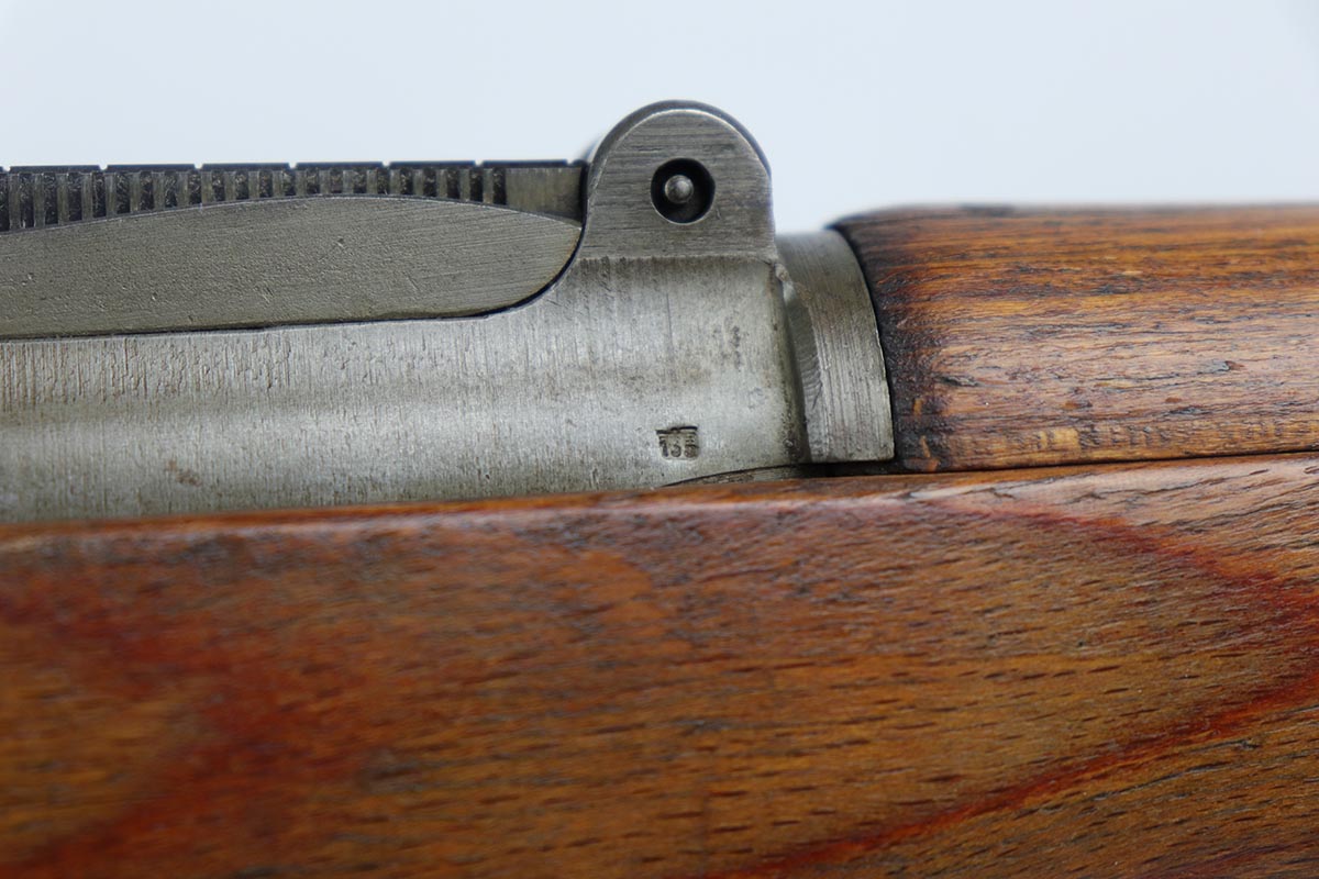 4/24/19 – This is an excellent example of a scarce and desirable Mauser K98 variation, made at the French Mauser factory and marked ‘svw 45’. The rifle is all matching and original with about 90% finish remaining on metal parts, with minor thinning on the barrel and standard thinning on the buttplate. The finish is phosphate on most of the rifle, giving it a nice tinge of greenish color. Some blued parts, like bolt release and front barrel band. Very nice stock with multiple waffenamts, and properly unnumbered for a rifle this late. Excellent bore. Unmarked sling.