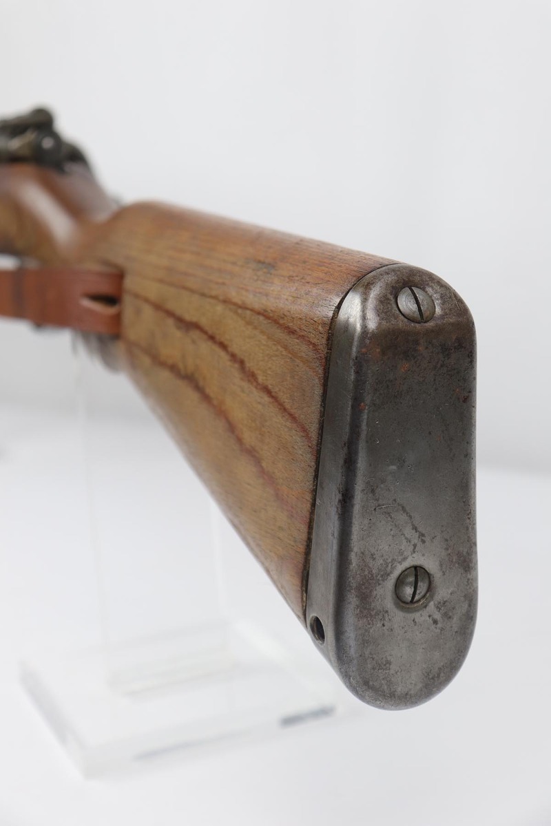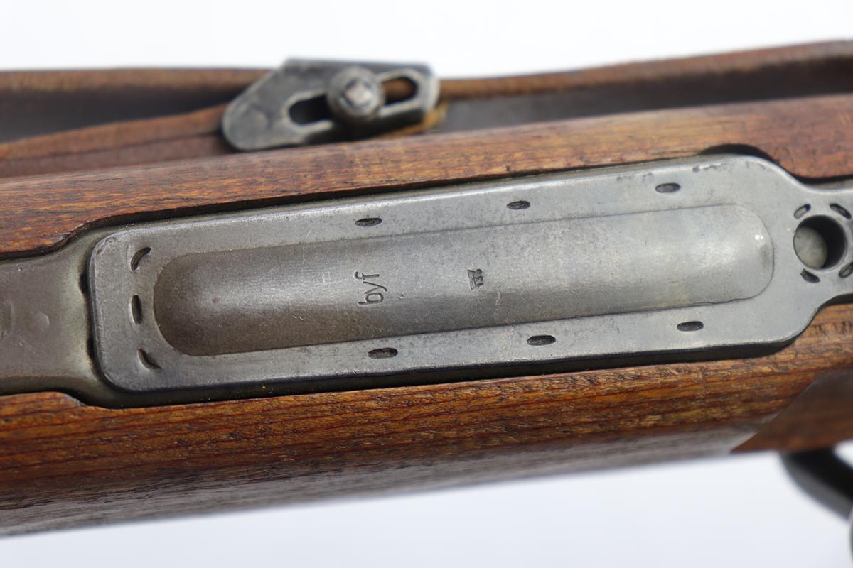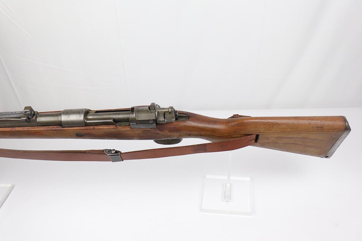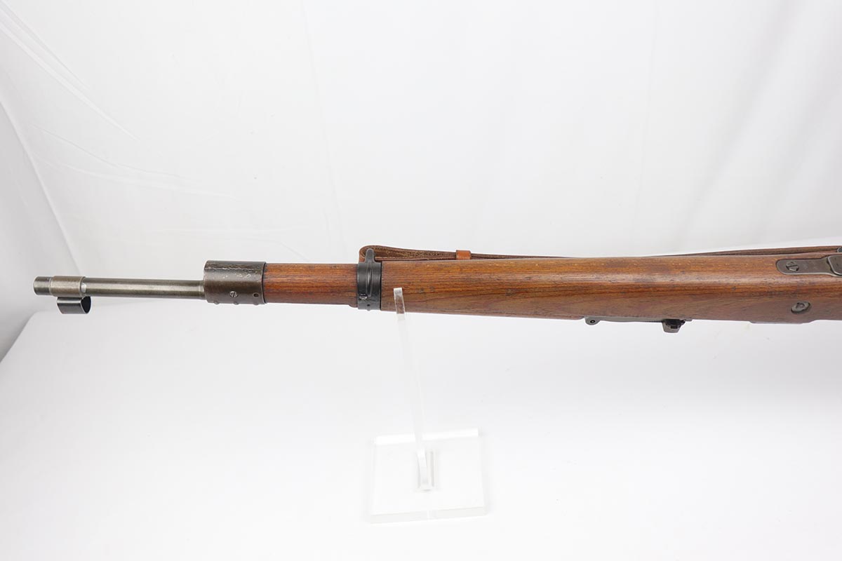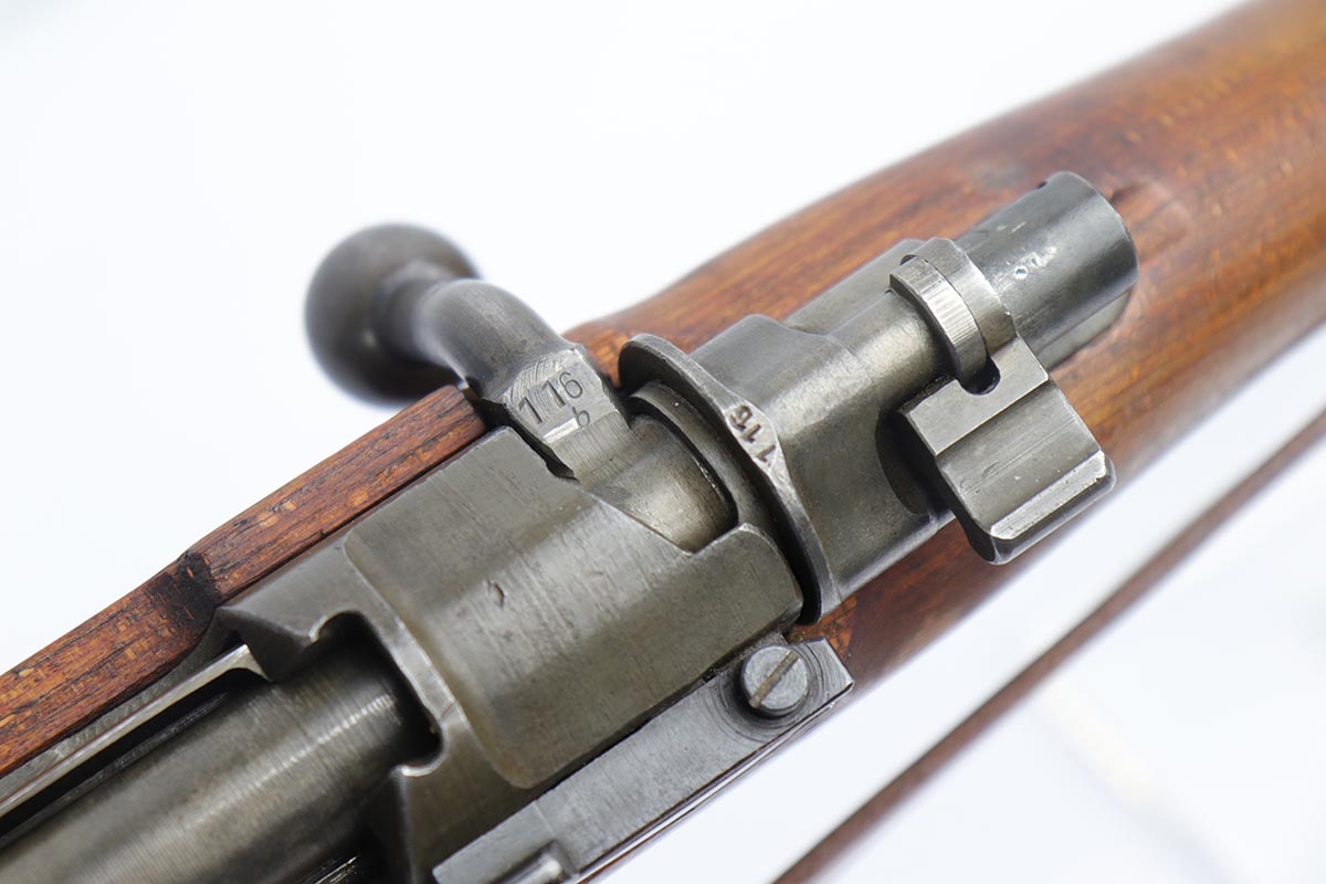 4/24/19 – This is an excellent example of a scarce and desirable Mauser K98 variation, made at the French Mauser factory and marked ‘svw 45’. The rifle is all matching and original with about 90% finish remaining on metal parts, with minor thinning on the barrel and standard thinning on the buttplate. The finish is phosphate on most of the rifle, giving it a nice tinge of greenish color. Some blued parts, like bolt release and front barrel band. Very nice stock with multiple waffenamts, and properly unnumbered for a rifle this late. Excellent bore. Unmarked sling.