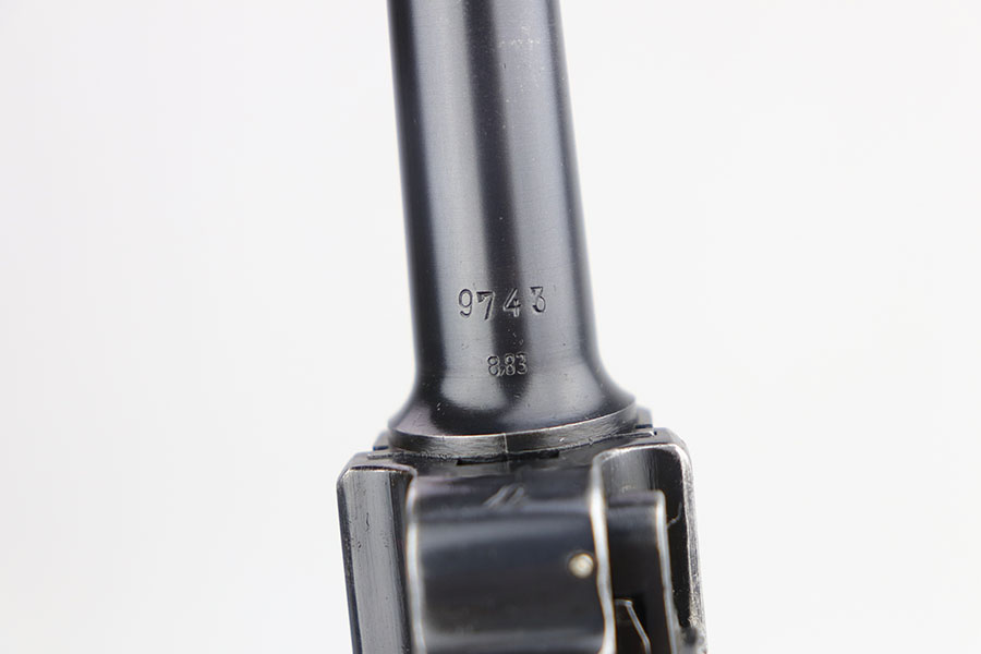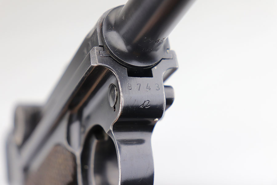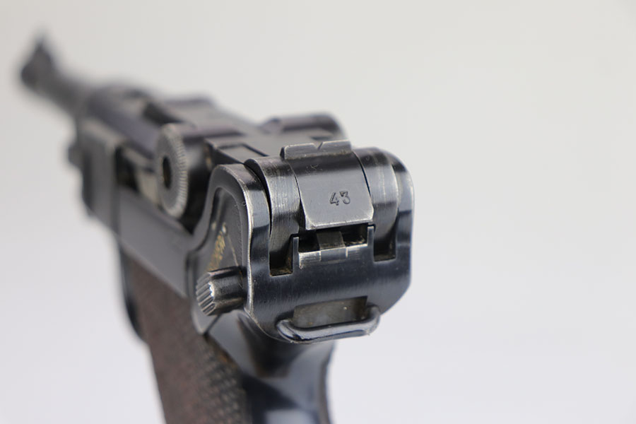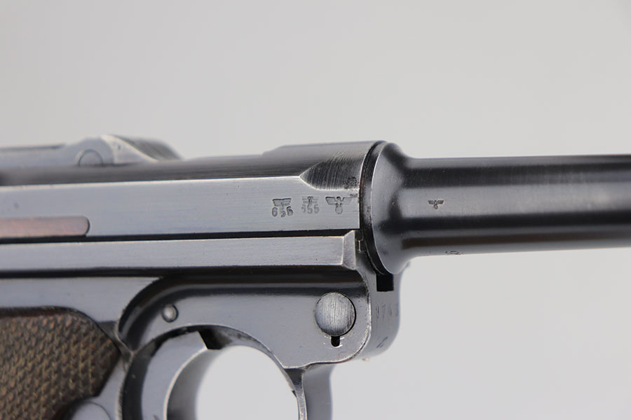 3/17/20 – This is a very nice example of a desirable Luger variation – the 1941/42 Mauser Luger. Only about 7,000 made, making them even rarer than the K date Luger. The pistol is all matching and original with about 93-94% blue remaining. There’s standard high point wear, as well as some finish loss on the bottom of the front strap, trigger guard, stock lug and top of the receiver. The grips are unnumbered and E/655 proofed. Magazine is period original but mismatched. Right grip panel has the common chip under the safety. Strong, shiny bore with only a bit of frost.